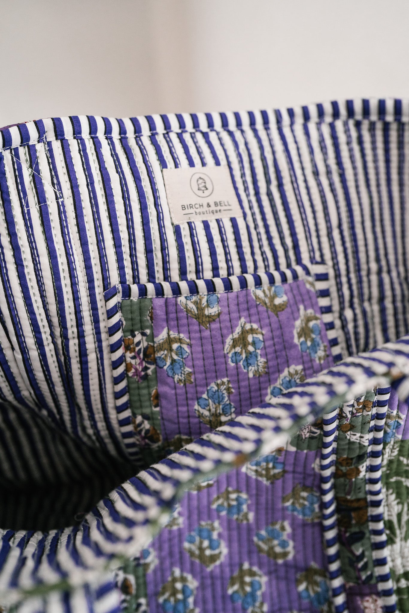 Each piece is crafted from 100% hand-printed fabric, so minor variations or subtle imperfections in the print are natural and part of its charm. Every bag will feature slightly different fabric patches, making each one truly unique while maintaining the same overall design as shown.