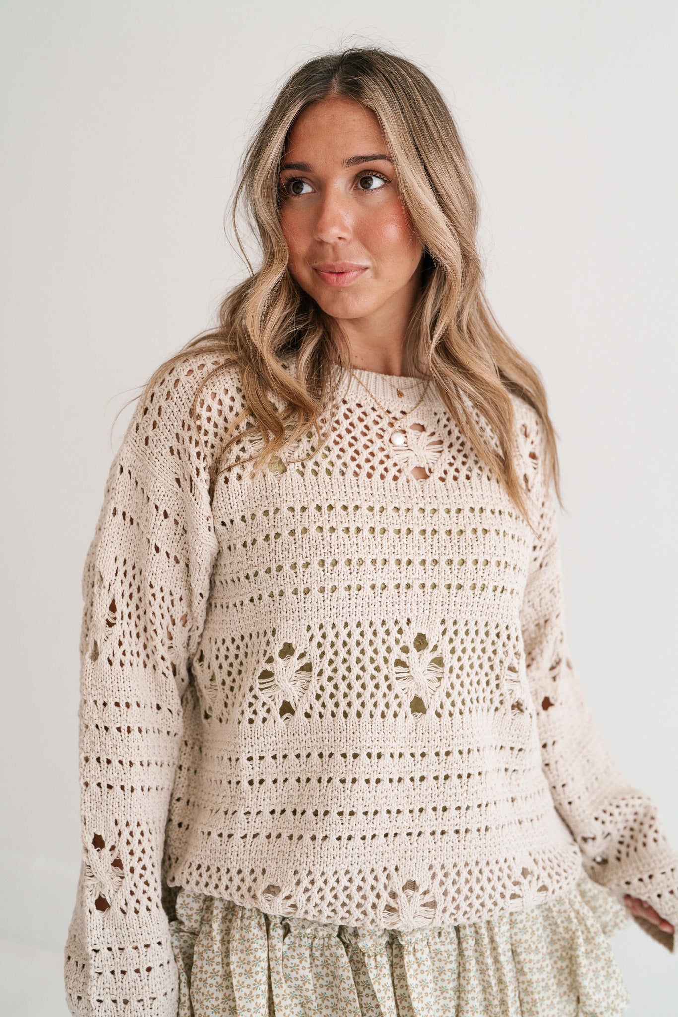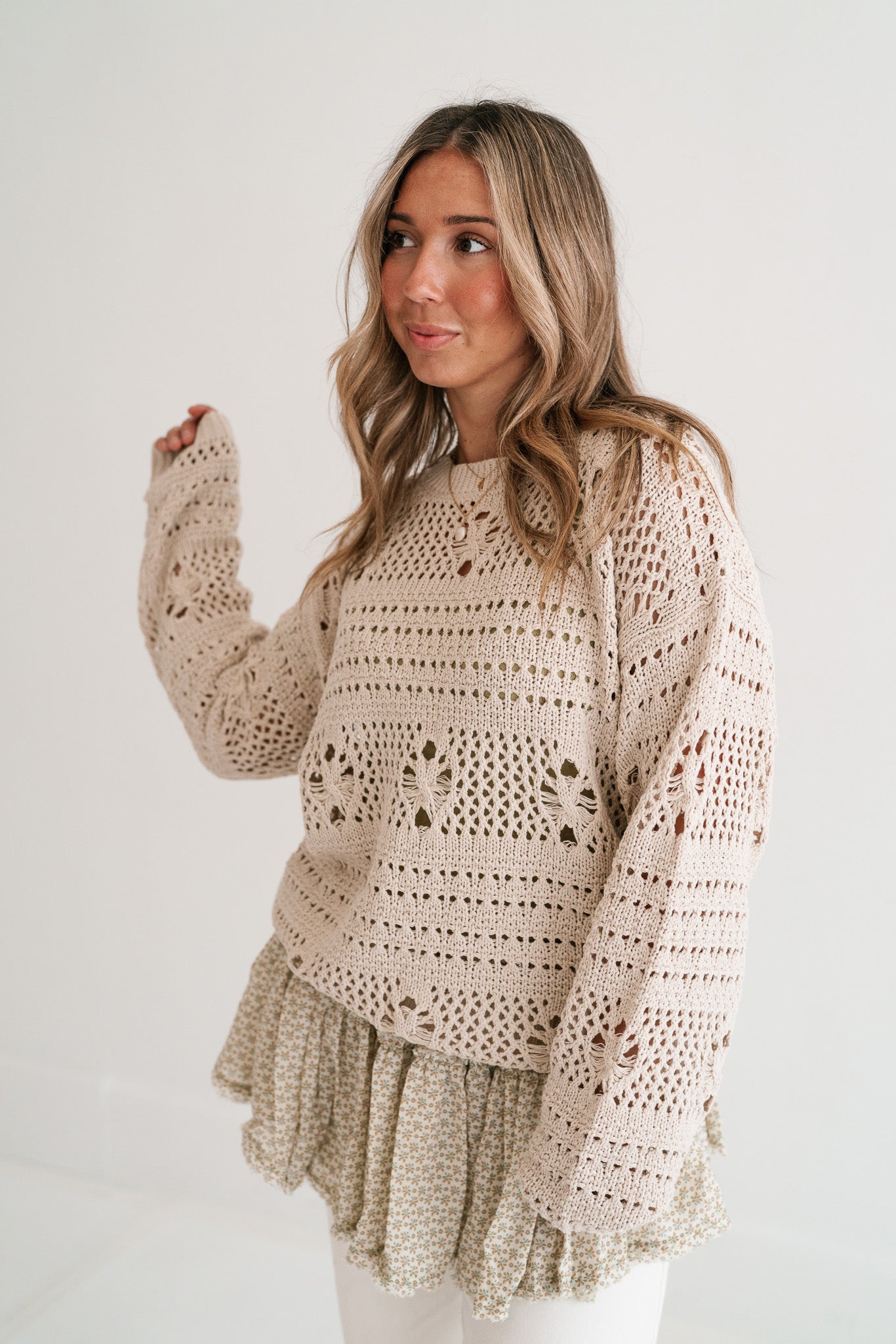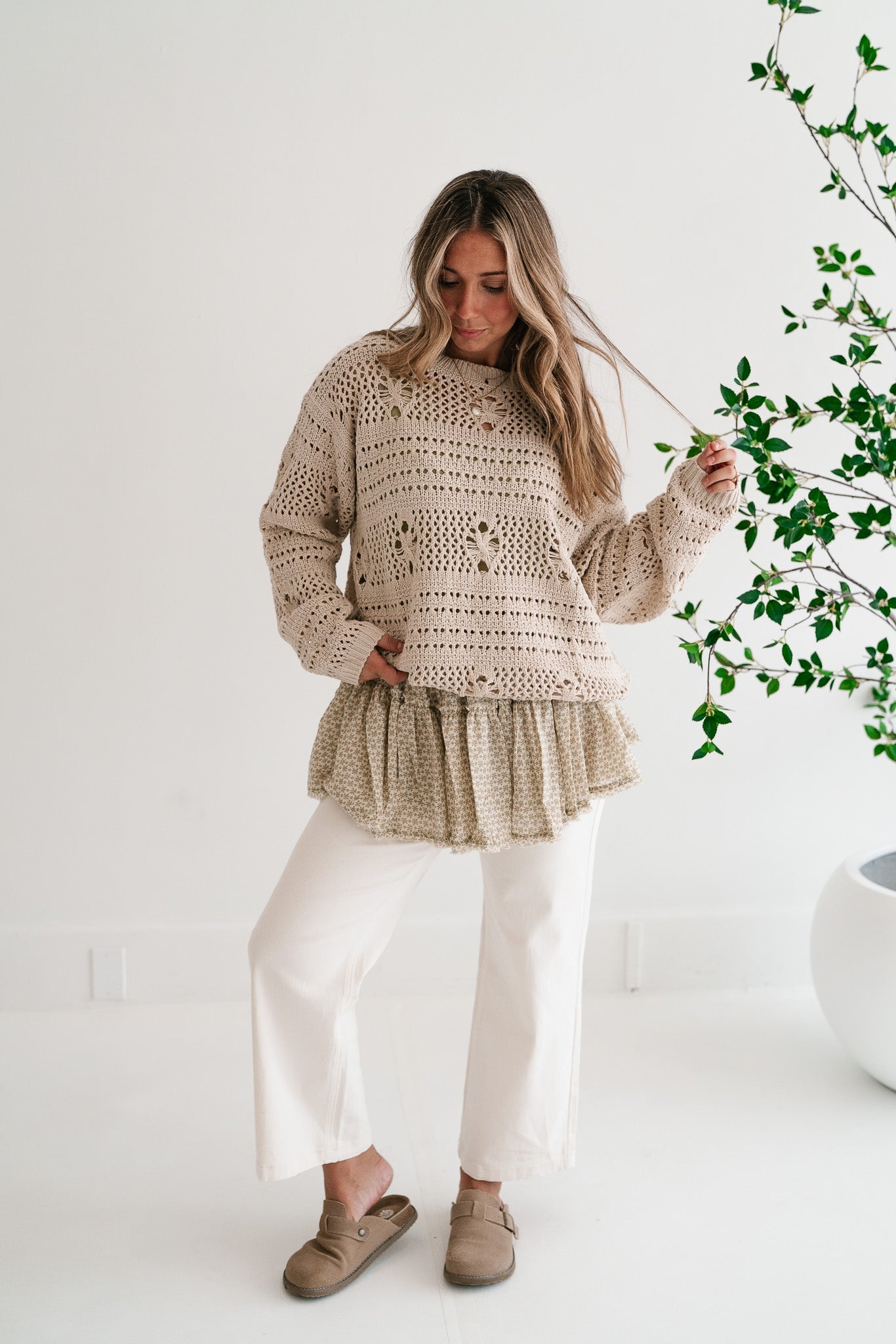 Designed with a relaxed, oversized silhouette and airy crochet-knit detailing, this sweater brings both texture and warmth. The soft oatmeal hue makes it a versatile staple, pairing beautifully with denim, skirts, or layered over a slip dress. Its open-knit design adds a touch of playfulness, making it perfect for breezy afternoons, cozy mornings, or weekend coffee dates. The slightly cropped length keeps it modern while maintaining that comfortable, easy fit you’ll love reaching for.
