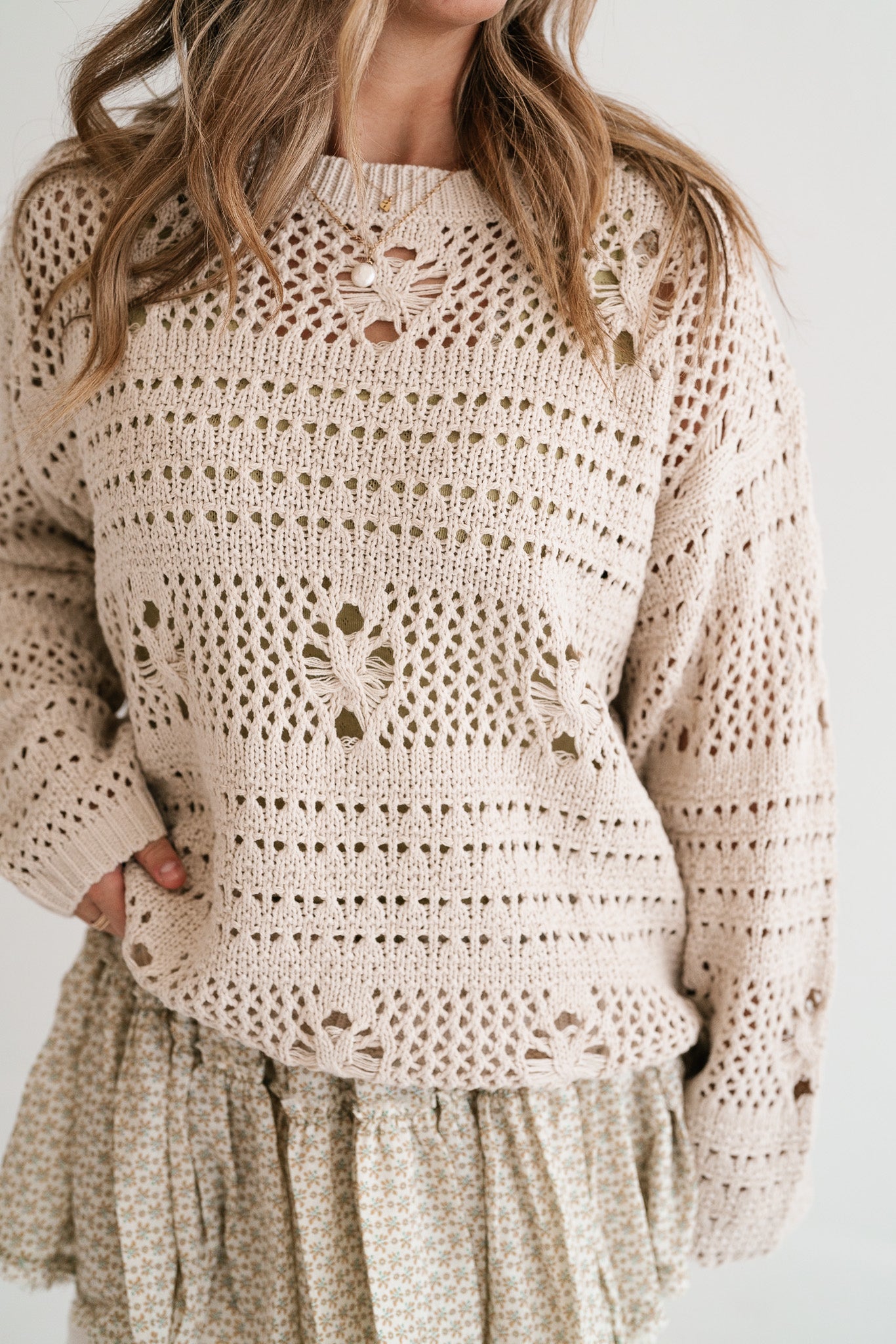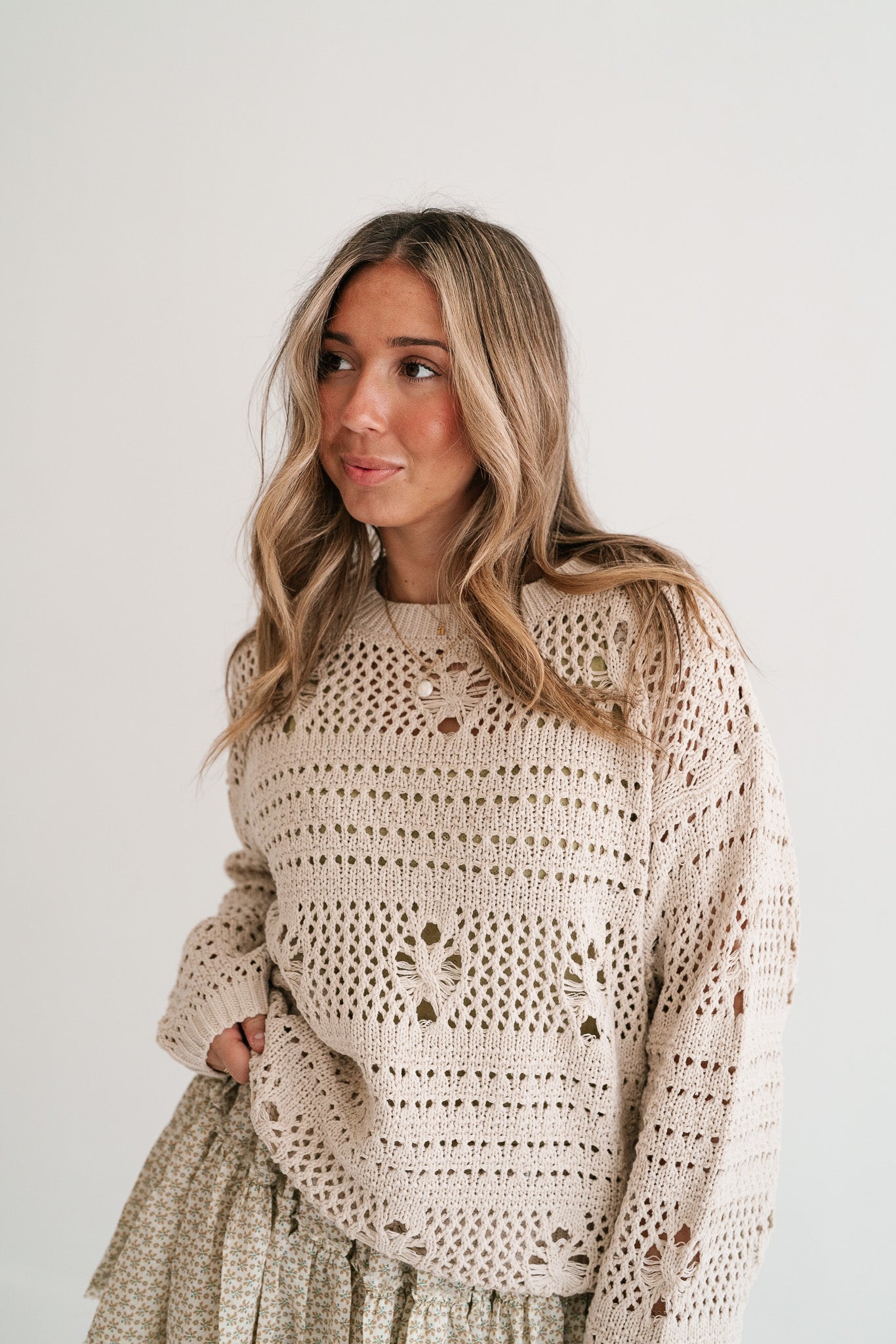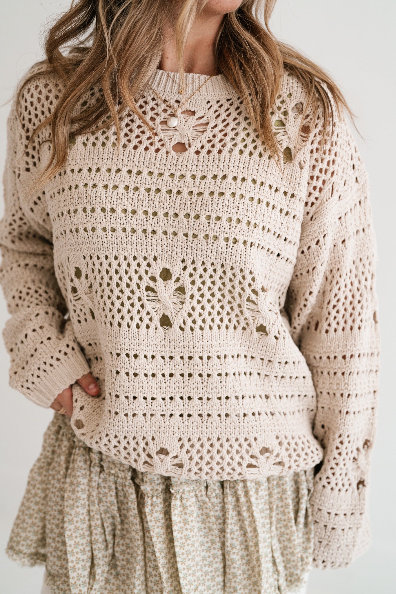 Designed with a relaxed, oversized silhouette and airy crochet-knit detailing, this sweater brings both texture and warmth. The soft oatmeal hue makes it a versatile staple, pairing beautifully with denim, skirts, or layered over a slip dress. Its open-knit design adds a touch of playfulness, making it perfect for breezy afternoons, cozy mornings, or weekend coffee dates. The slightly cropped length keeps it modern while maintaining that comfortable, easy fit you’ll love reaching for.