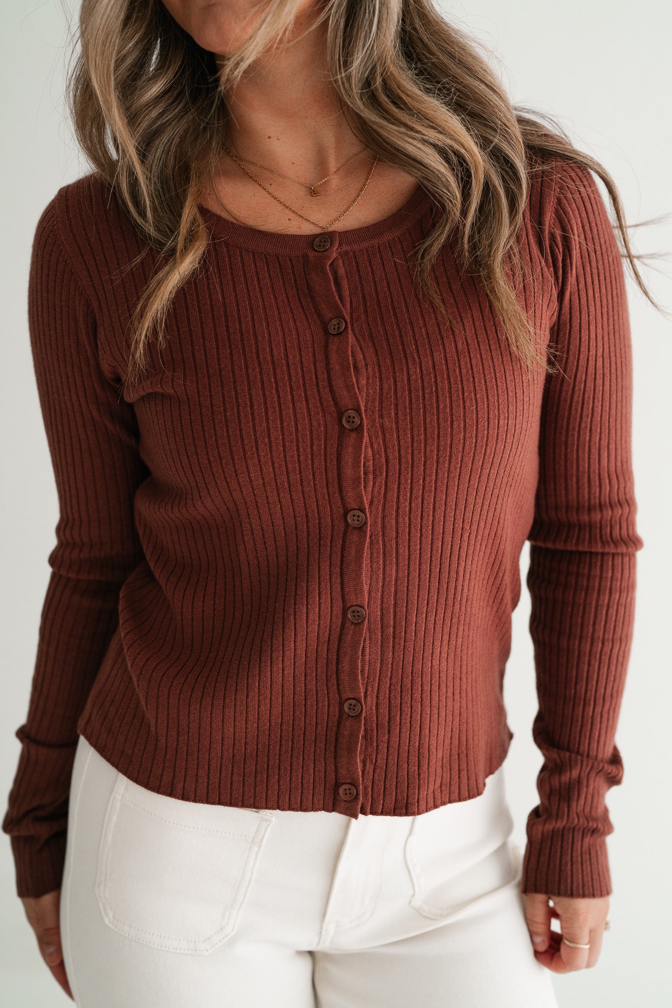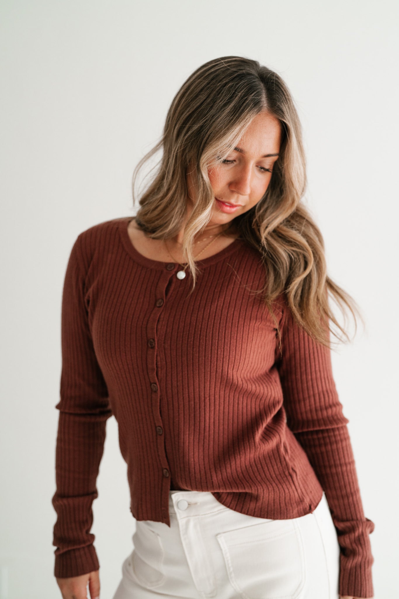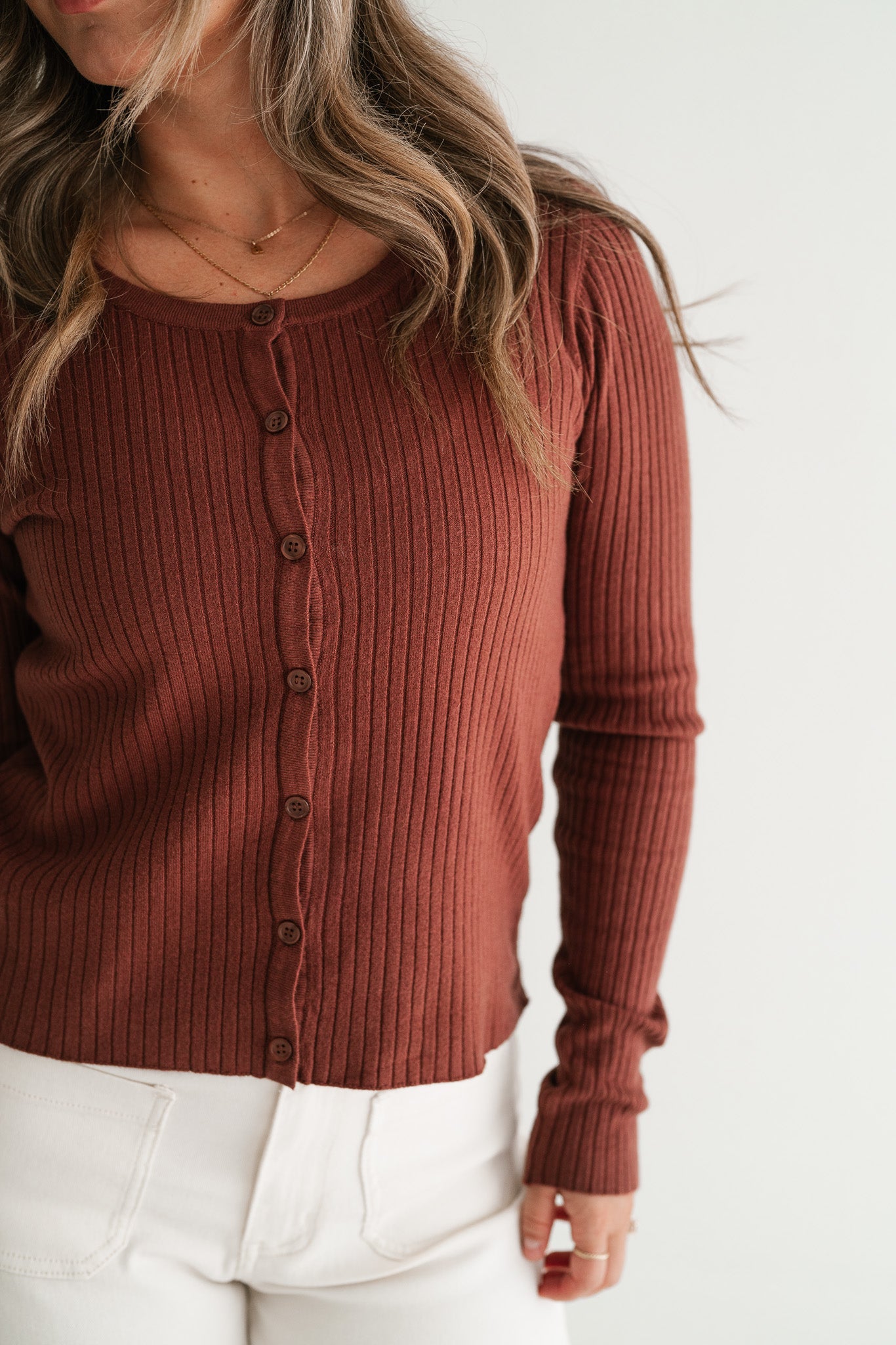 Spicewood Women's Ribbed Knit Button-Up Cardigan - Rust Brown Long Sleeve Top