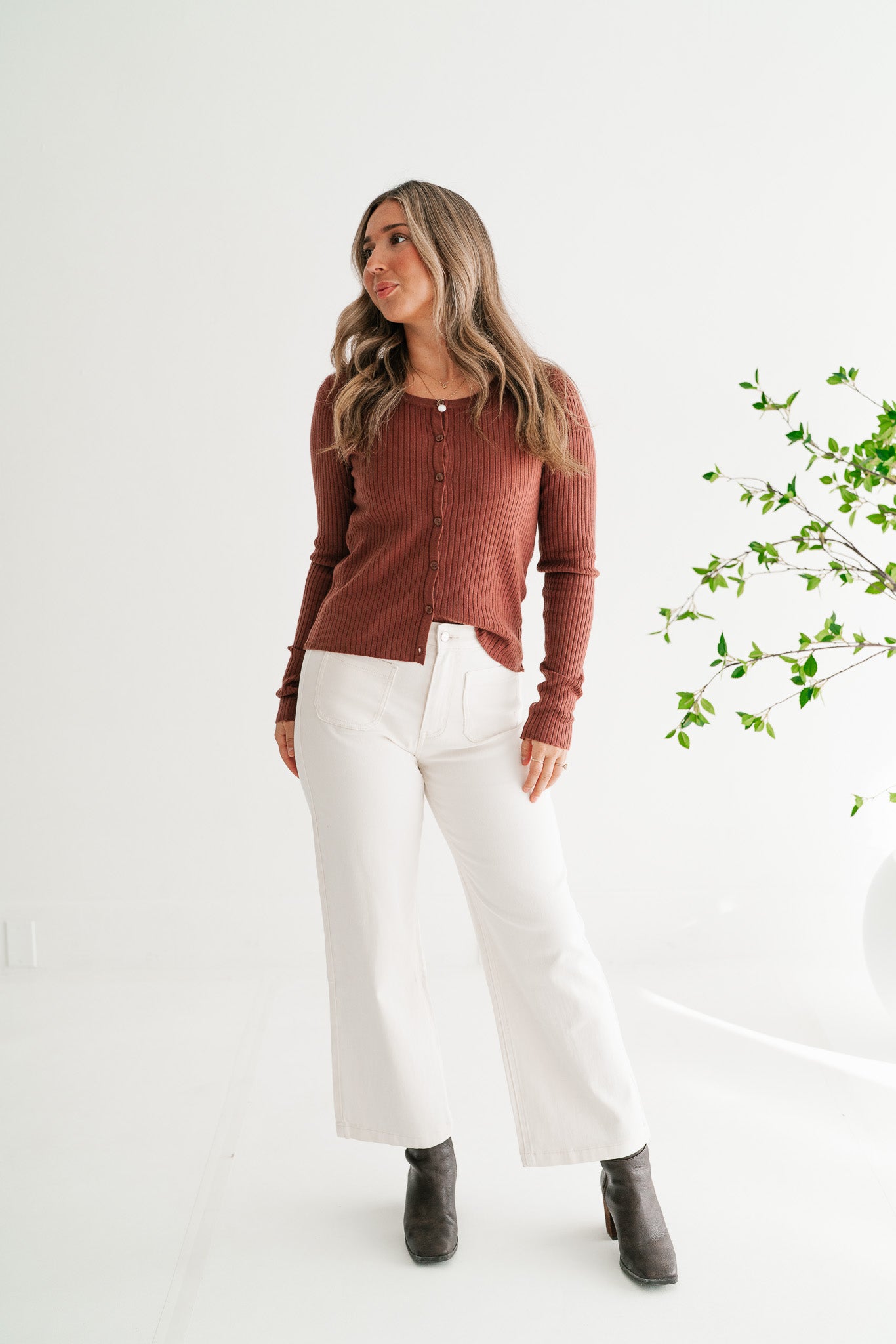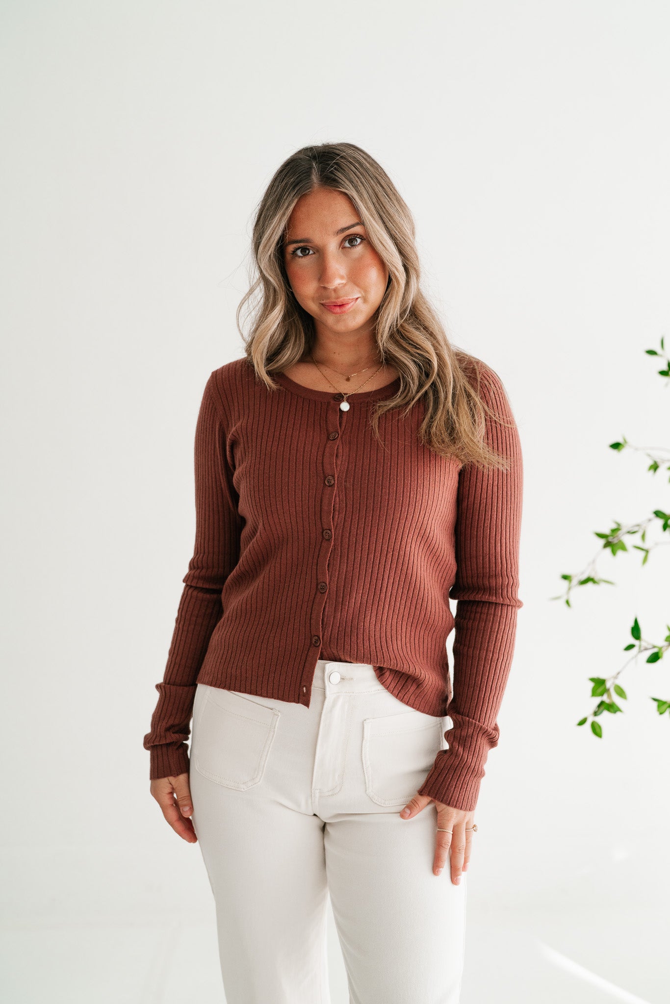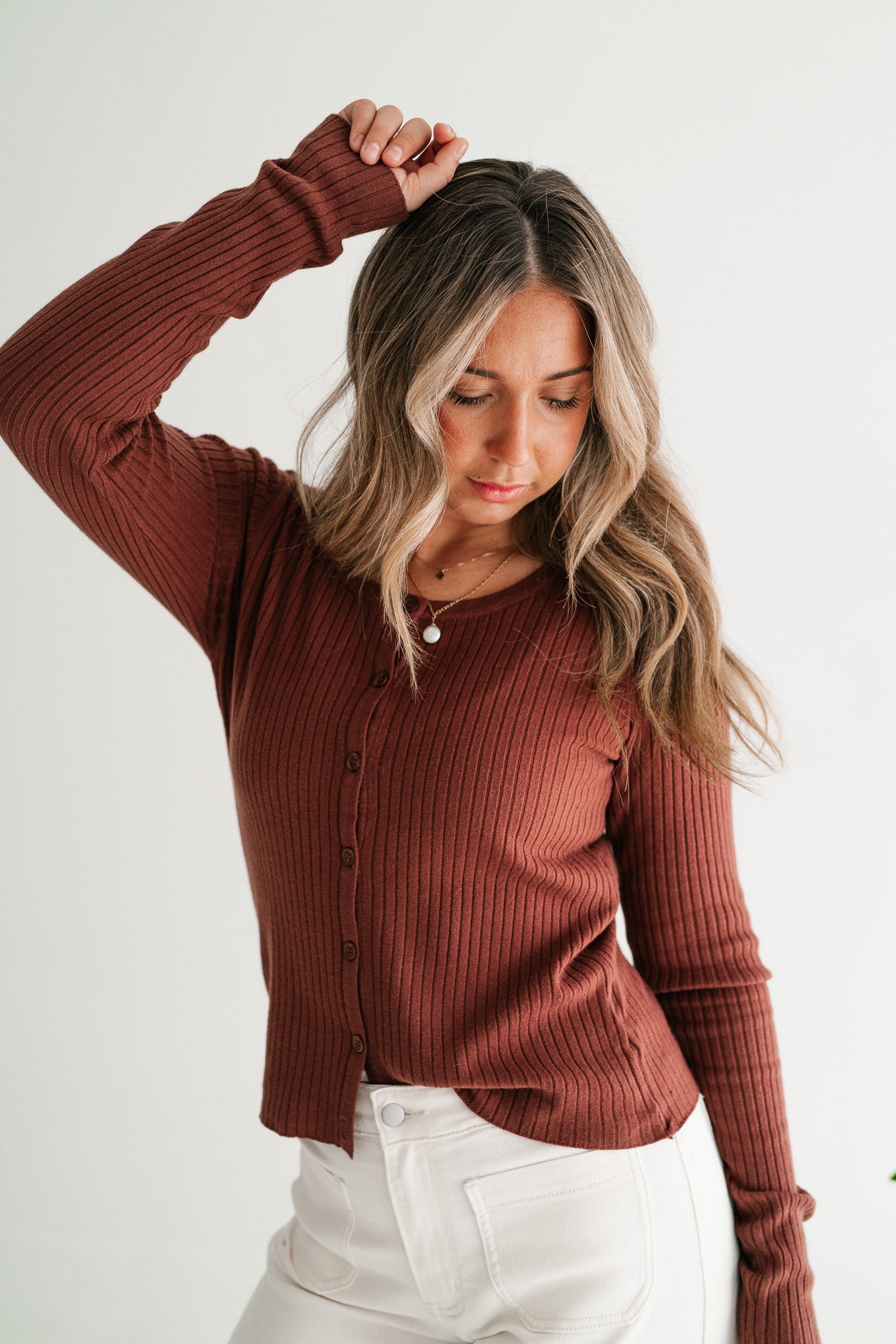 Spicewood Women's Ribbed Knit Button-Up Cardigan - Rust Brown Long Sleeve Top