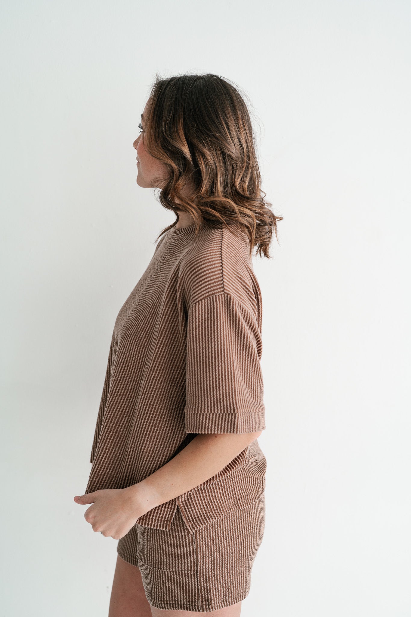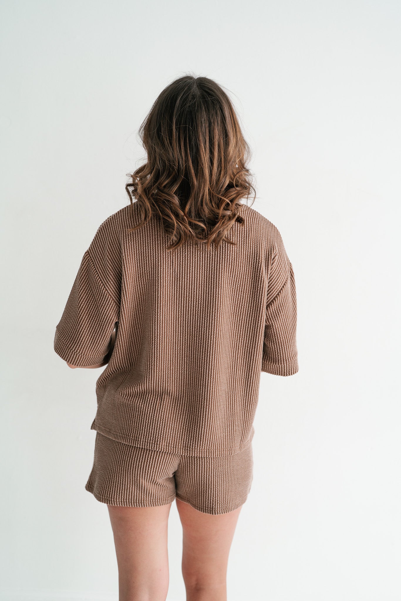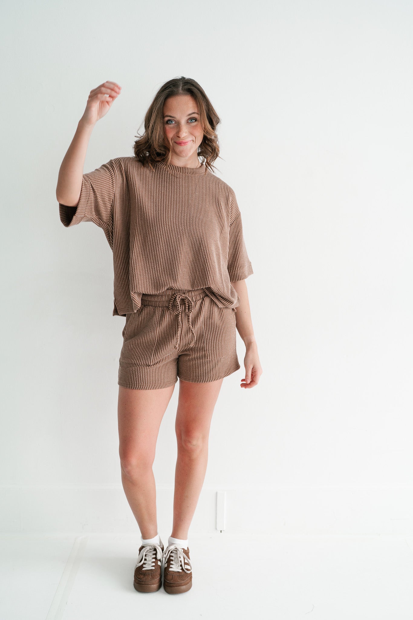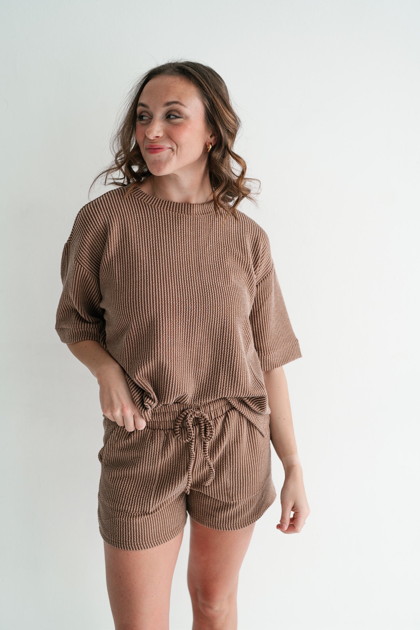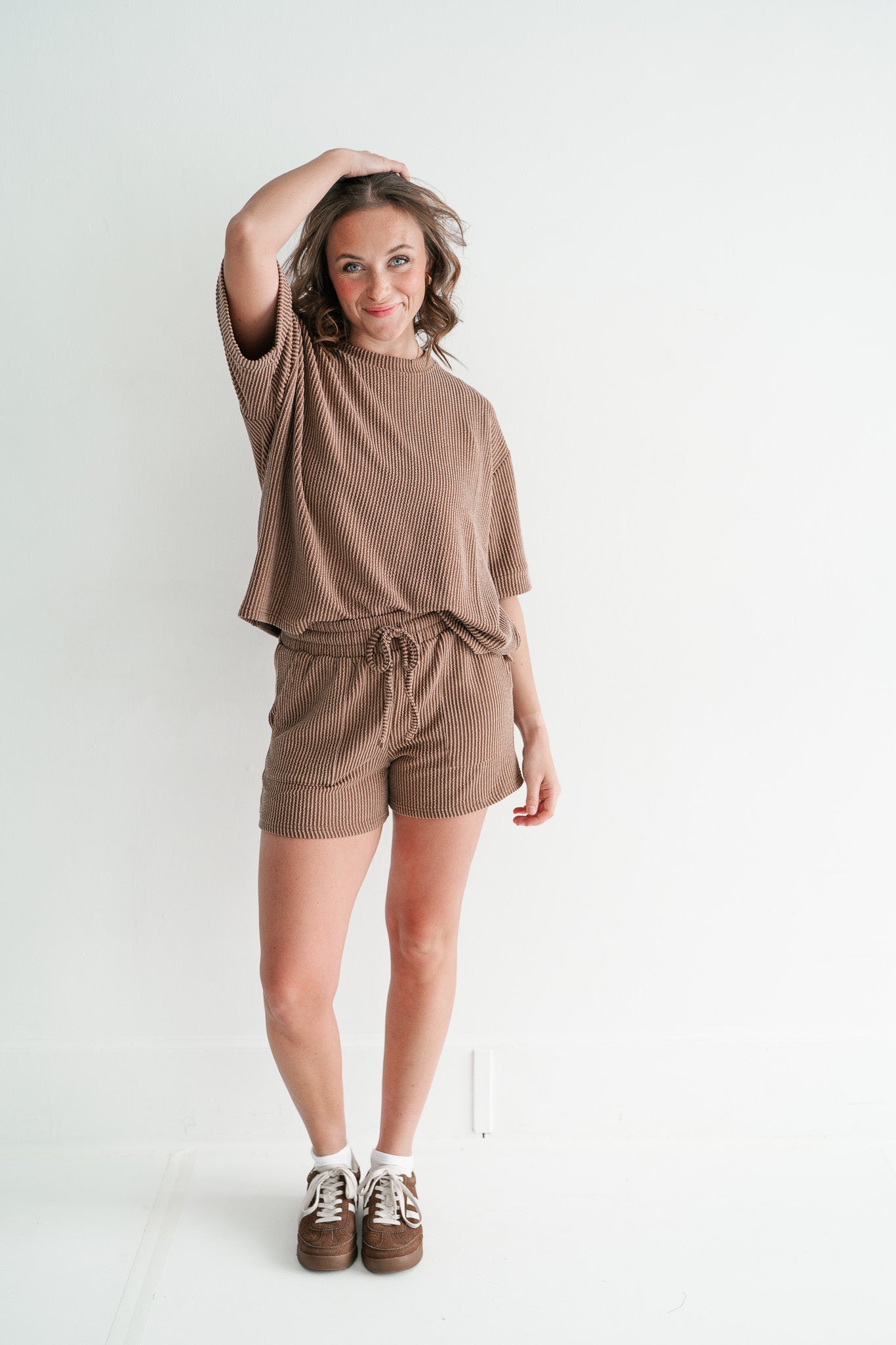 The Hazelwood Lounge Premium Women's Ribbed - Top Brown | Knit 2-Piece Lounge Set | Cozy Short Sleeve Top & Drawstring Shorts Outfits