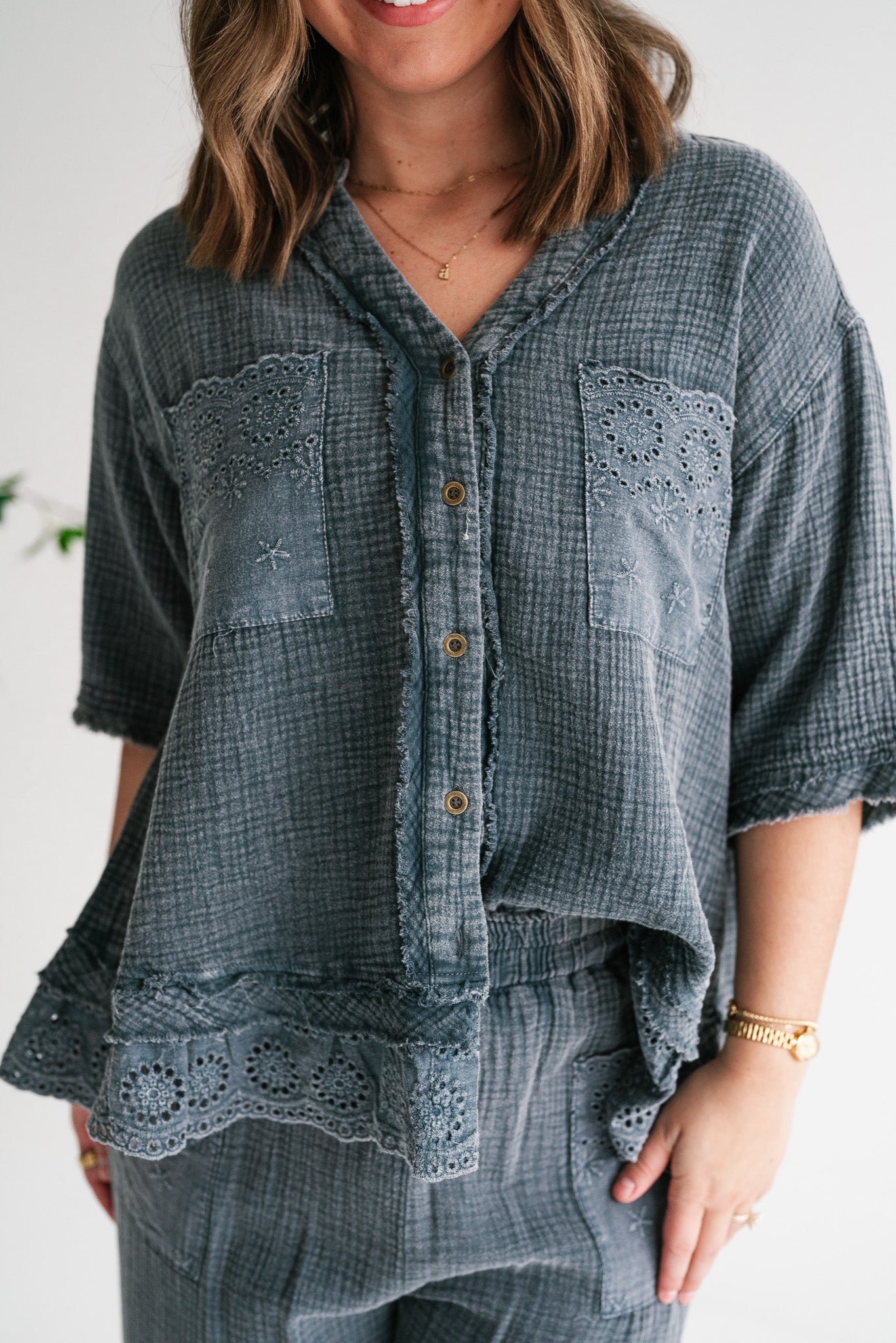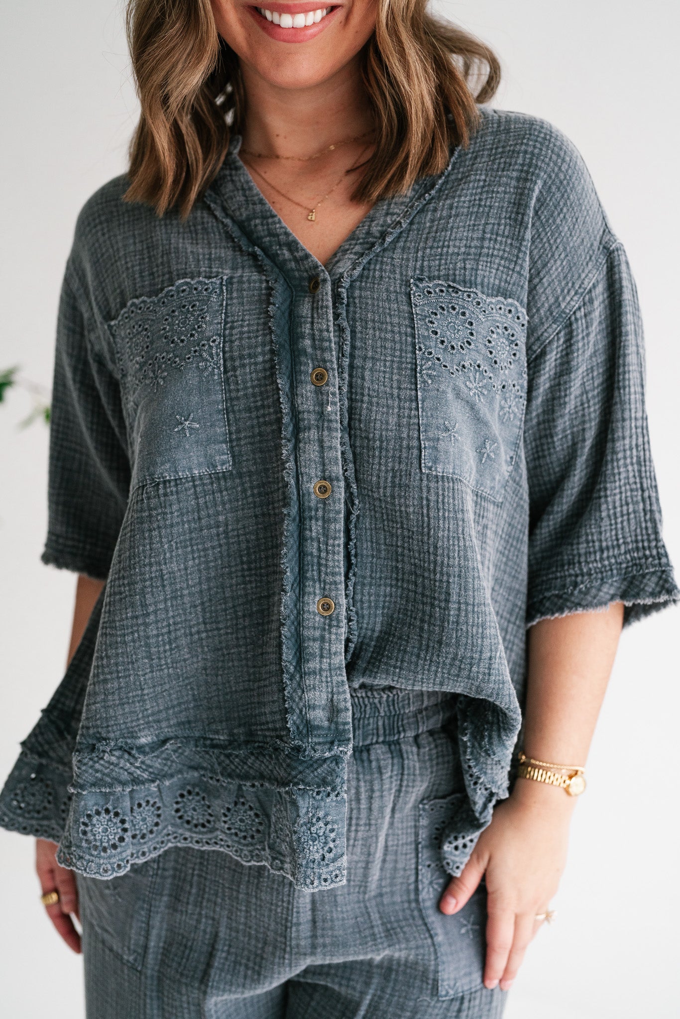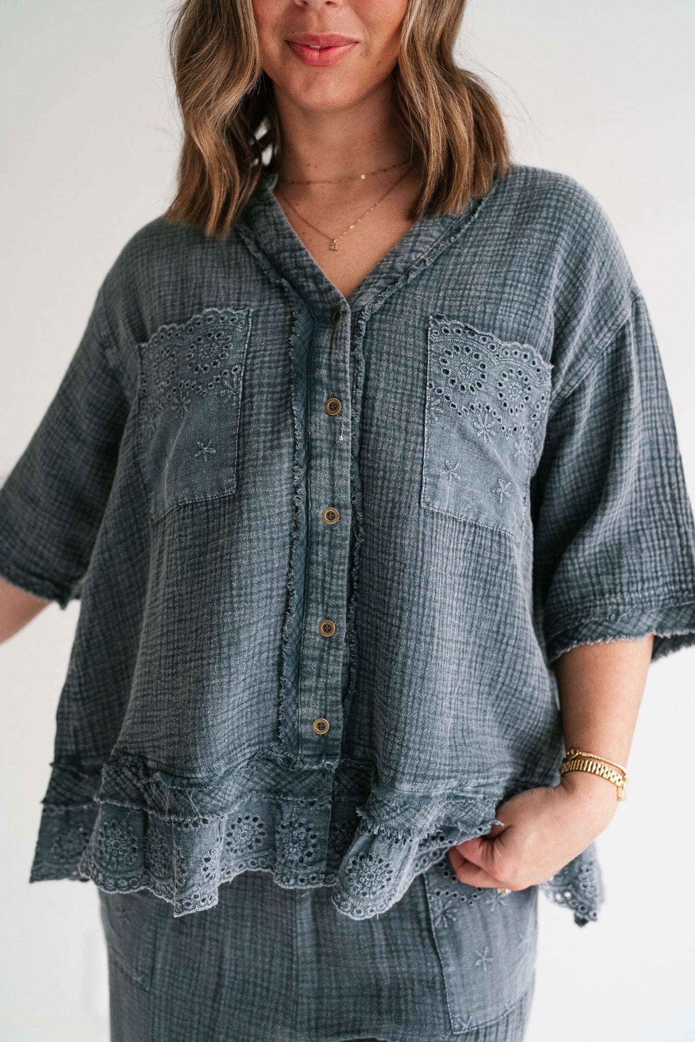 Embrace effortless style and comfort with our Women's Relaxed Fit Gauze Button-Down Shirt. Crafted from a soft, breathable gauze fabric in a versatile muted blue-grey, this top is designed for ultimate ease and chic appeal. Its relaxed silhouette offers a comfortable, flowy fit perfect for all-day wear, making it an essential addition to your casual wardrobe. This stylish shirt features delicate eyelet embroidery adorning the dual chest pockets and a subtly scalloped, lace-trimmed hem, adding a touch of bohemian charm. The classic V-neckline with a partial button-front closure allows for adjustable styling, while the short sleeves keep you cool and comfortable. Each detail is thoughtfully integrated to create a piece that feels both special and incredibly wearable. Whether you're heading to a casual brunch, enjoying a relaxed weekend, or looking for the perfect vacation top, this gauze shirt is your go-to. Pair it with your favorite denim shorts, linen trousers, or a flowy skirt for an effortlessly polished look. Experience comfort, quality, and unique style with this versatile piece.
