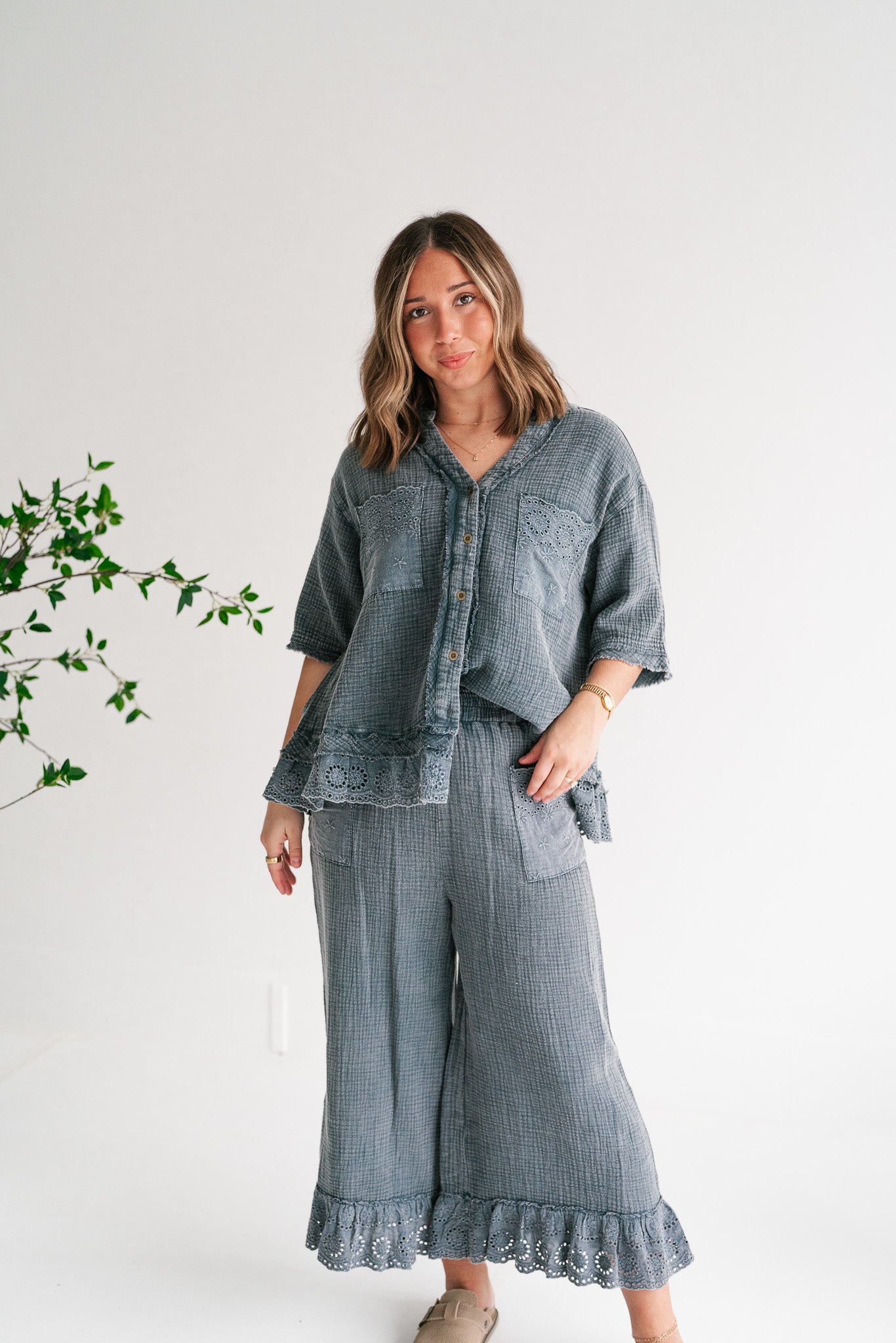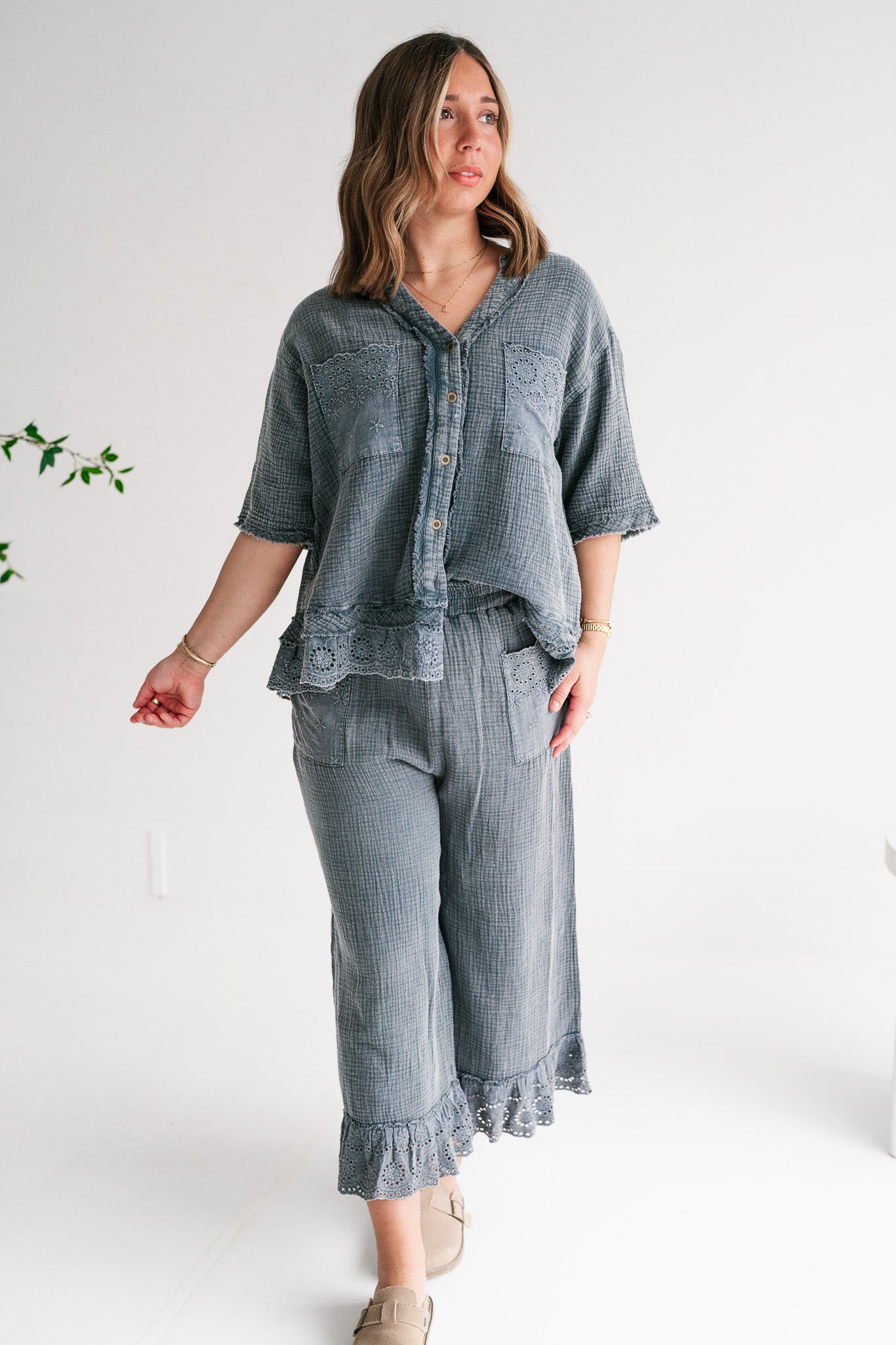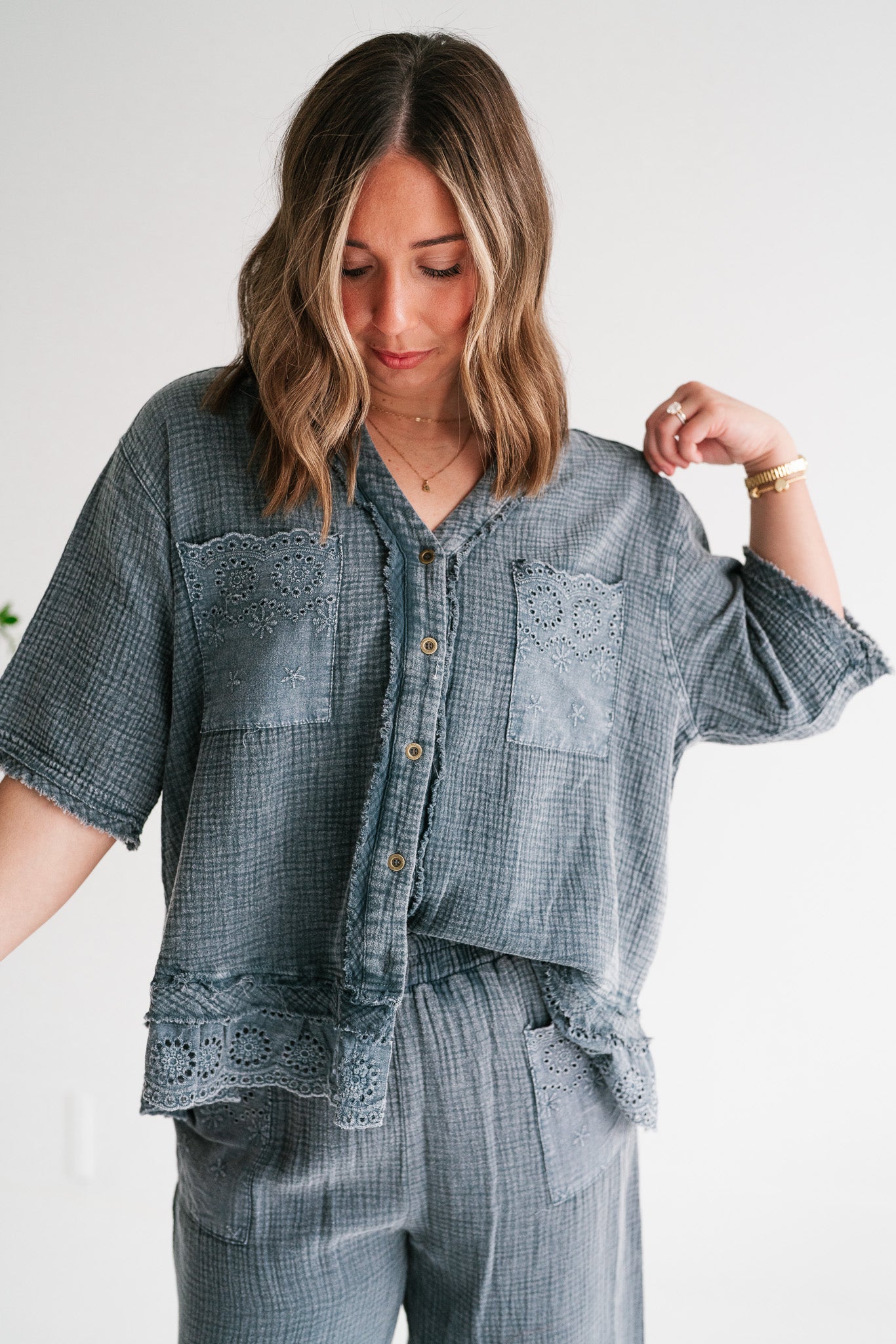 Embrace effortless style and comfort with our Women's Relaxed Fit Gauze Button-Down Shirt. Crafted from a soft, breathable gauze fabric in a versatile muted blue-grey, this top is designed for ultimate ease and chic appeal. Its relaxed silhouette offers a comfortable, flowy fit perfect for all-day wear, making it an essential addition to your casual wardrobe. This stylish shirt features delicate eyelet embroidery adorning the dual chest pockets and a subtly scalloped, lace-trimmed hem, adding a touch of bohemian charm. The classic V-neckline with a partial button-front closure allows for adjustable styling, while the short sleeves keep you cool and comfortable. Each detail is thoughtfully integrated to create a piece that feels both special and incredibly wearable. Whether you're heading to a casual brunch, enjoying a relaxed weekend, or looking for the perfect vacation top, this gauze shirt is your go-to. Pair it with your favorite denim shorts, linen trousers, or a flowy skirt for an effortlessly polished look. Experience comfort, quality, and unique style with this versatile piece.