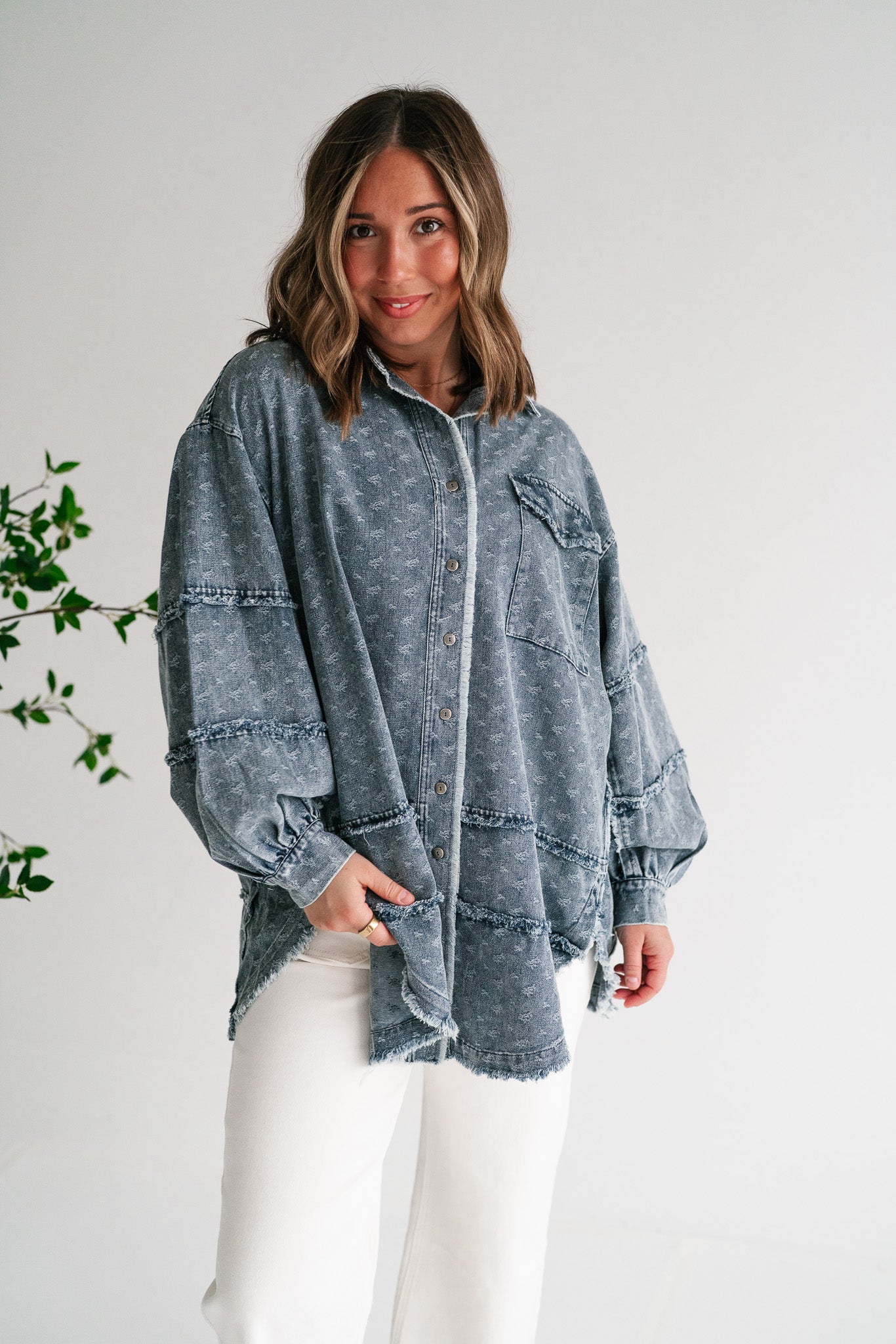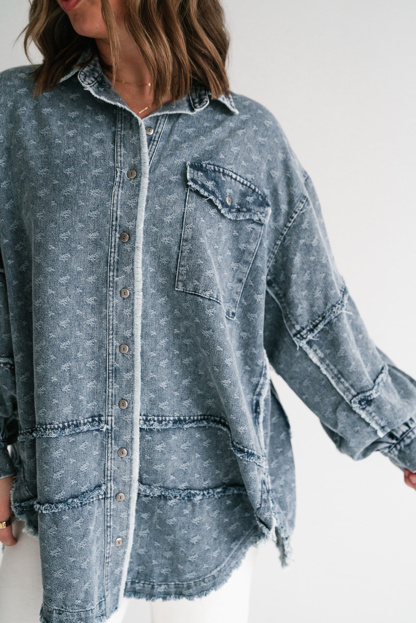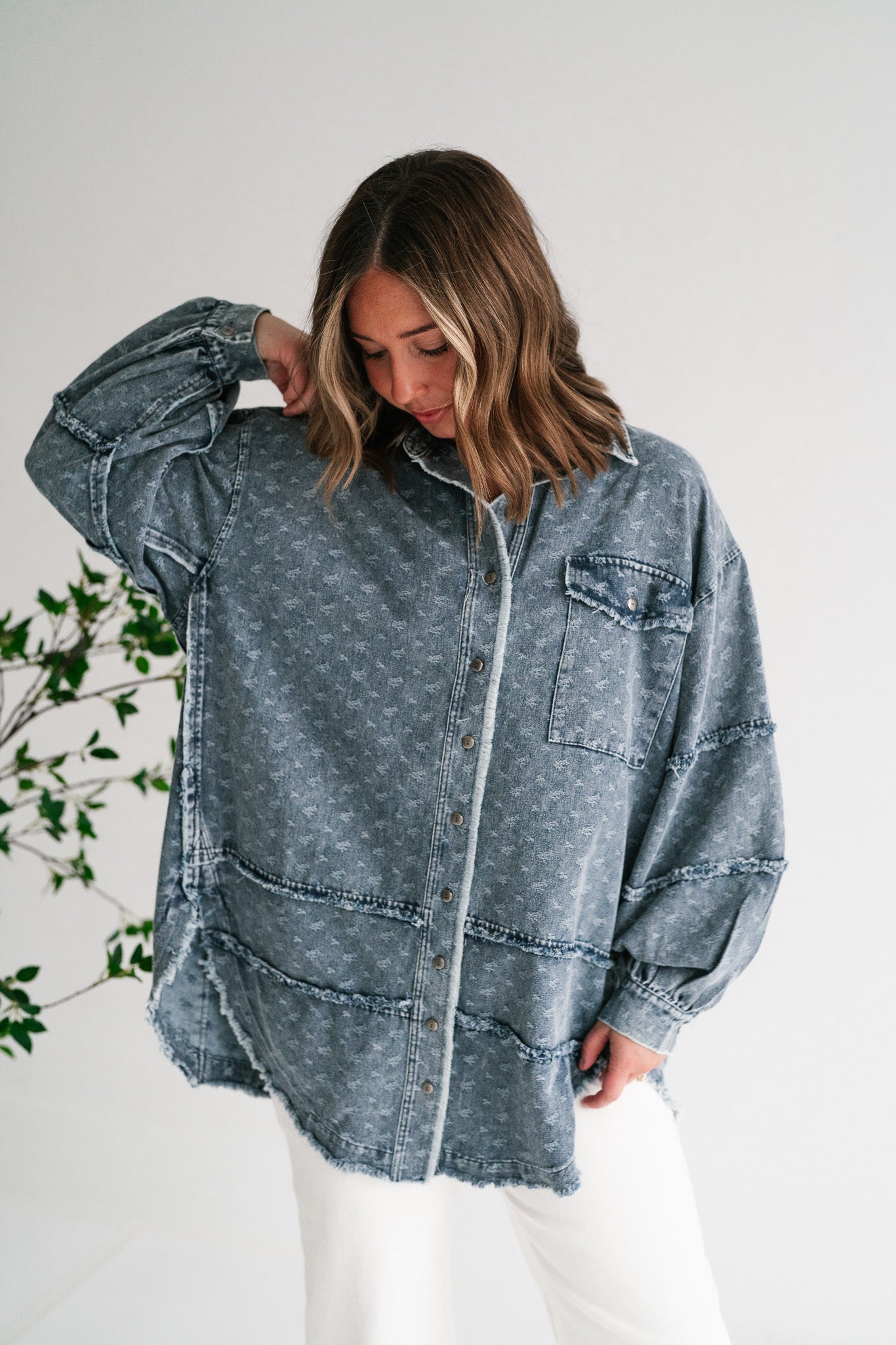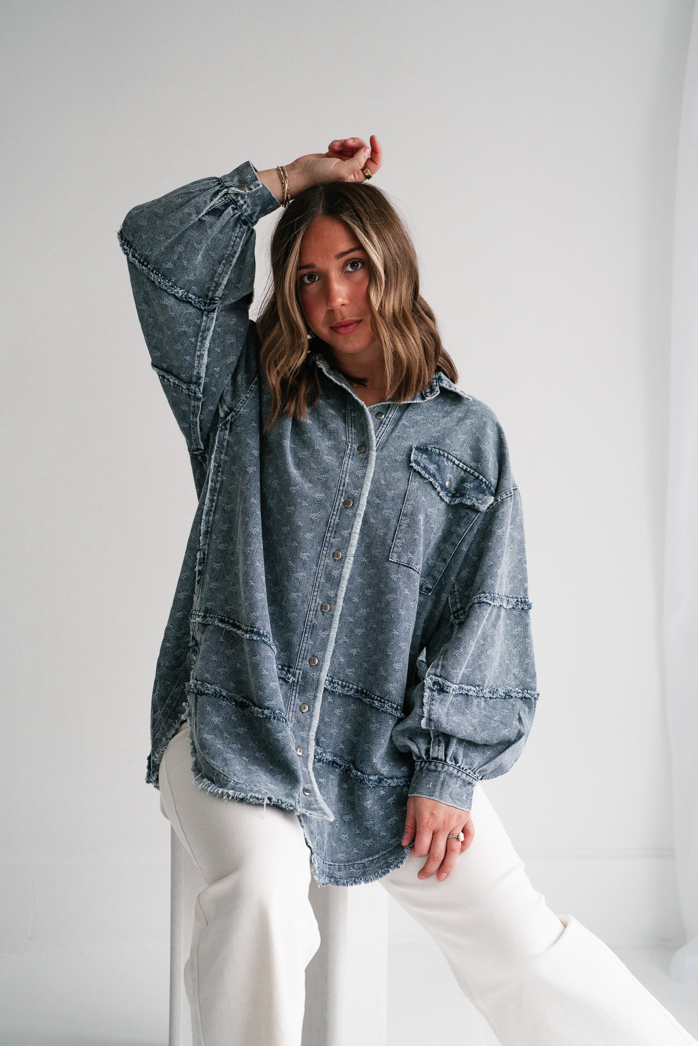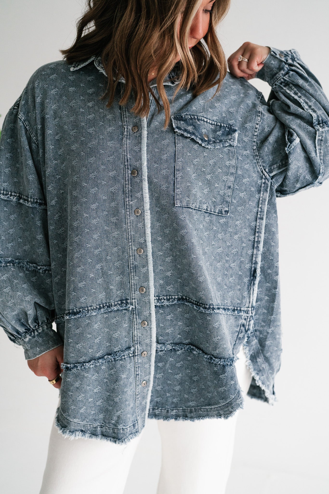 Designed with a relaxed oversized silhouette and a unique star print denim wash, this versatile layering piece blends casual ease with standout style. Perfectly balanced between a shirt and a jacket, it offers endless outfit possibilities—throw it on over a dress, pair with leggings, or style with denim for a chic double-denim look. With its raw hem and vintage-inspired details, this shacket is a true statement piece for the modern woman on the go.