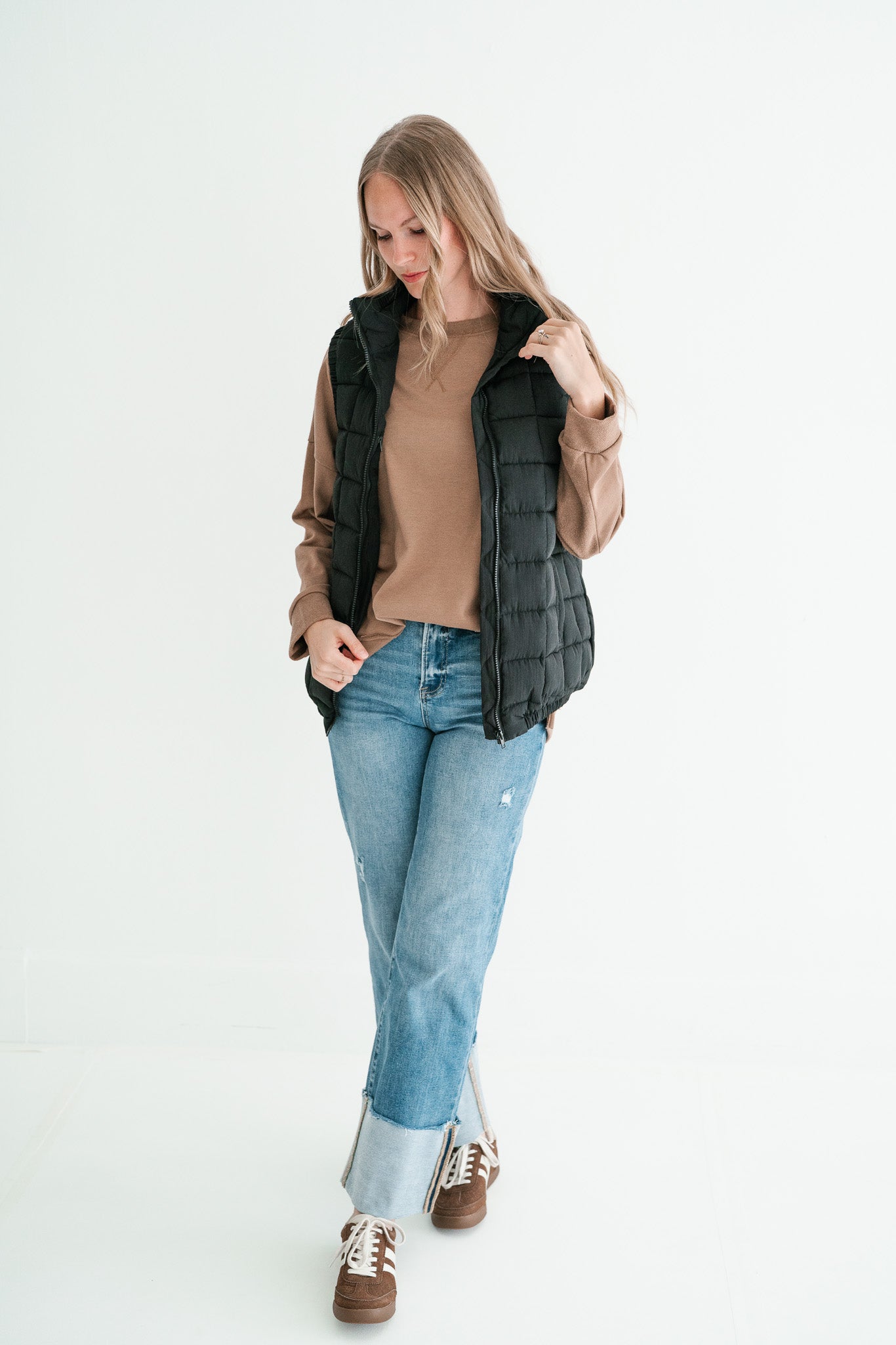 • The Midnight Quilted Puffer Vest is your ultimate layering piece for effortless warmth and style. Crafted with a sleek quilted design, this vest offers lightweight insulation without the bulk, making it perfect for chilly mornings, weekend adventures, or layering over your favorite sweaters. Its versatile midnight hue pairs seamlessly with jeans, leggings, or casual dresses, while the practical front zipper and pockets provide functionality on the go. Elevate your cold-weather wardrobe with this essential puffer vest that combines comfort, style, and everyday versatility.