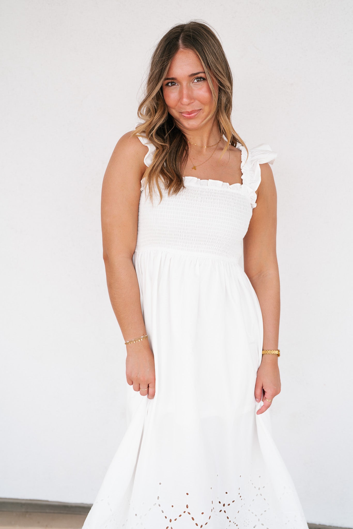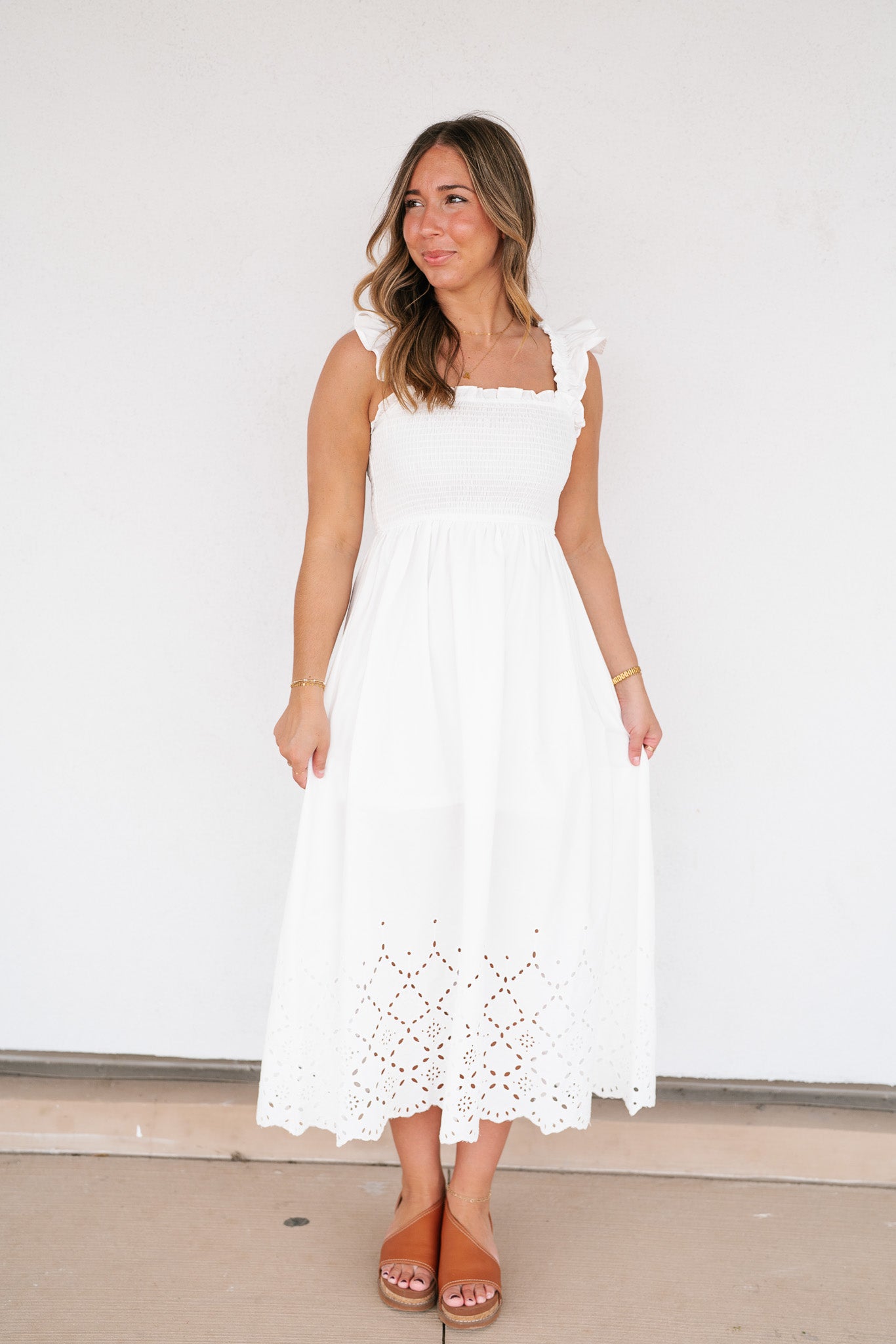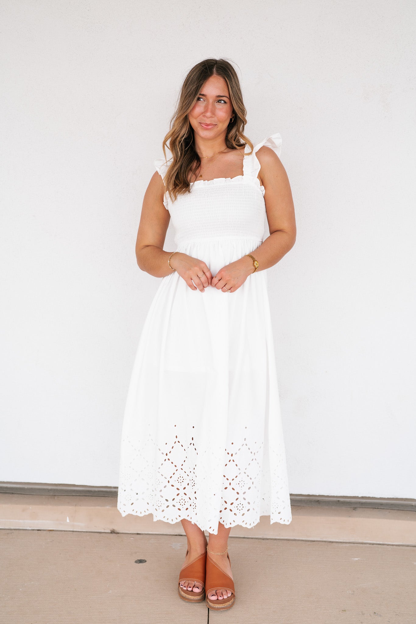 Graceful and timeless, the Rosemere Smocked Ruffle Sleeve Midi Dress brings a touch of romantic charm to every occasion. This elegant dress features a smocked bodice that offers a flattering, flexible fit, while two-inch ruffle sleeves add a feminine and playful finish. The midi-length skirt flows beautifully and is accented with delicate eyelet embroidery around the hem, creating soft movement and a vintage-inspired feel.