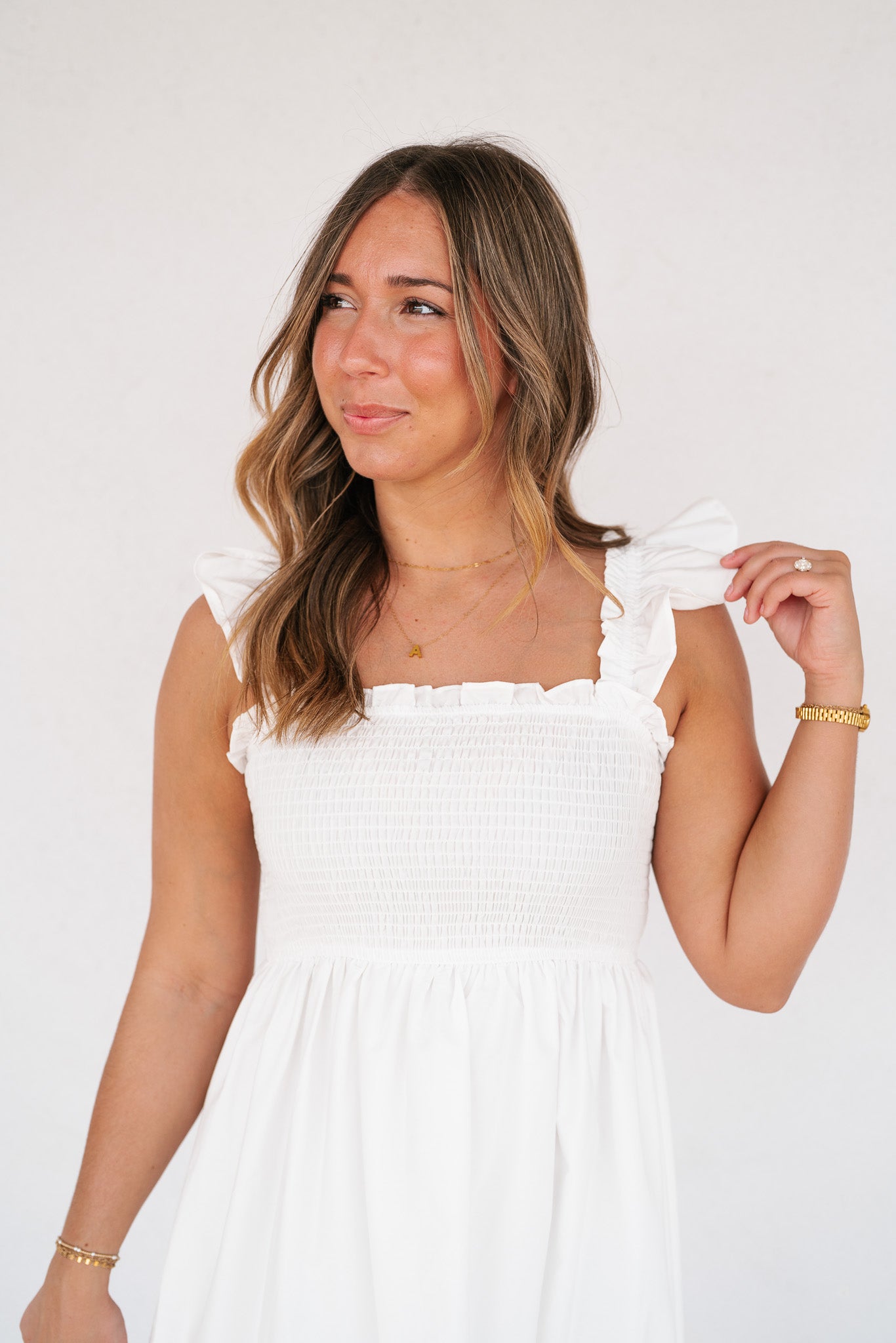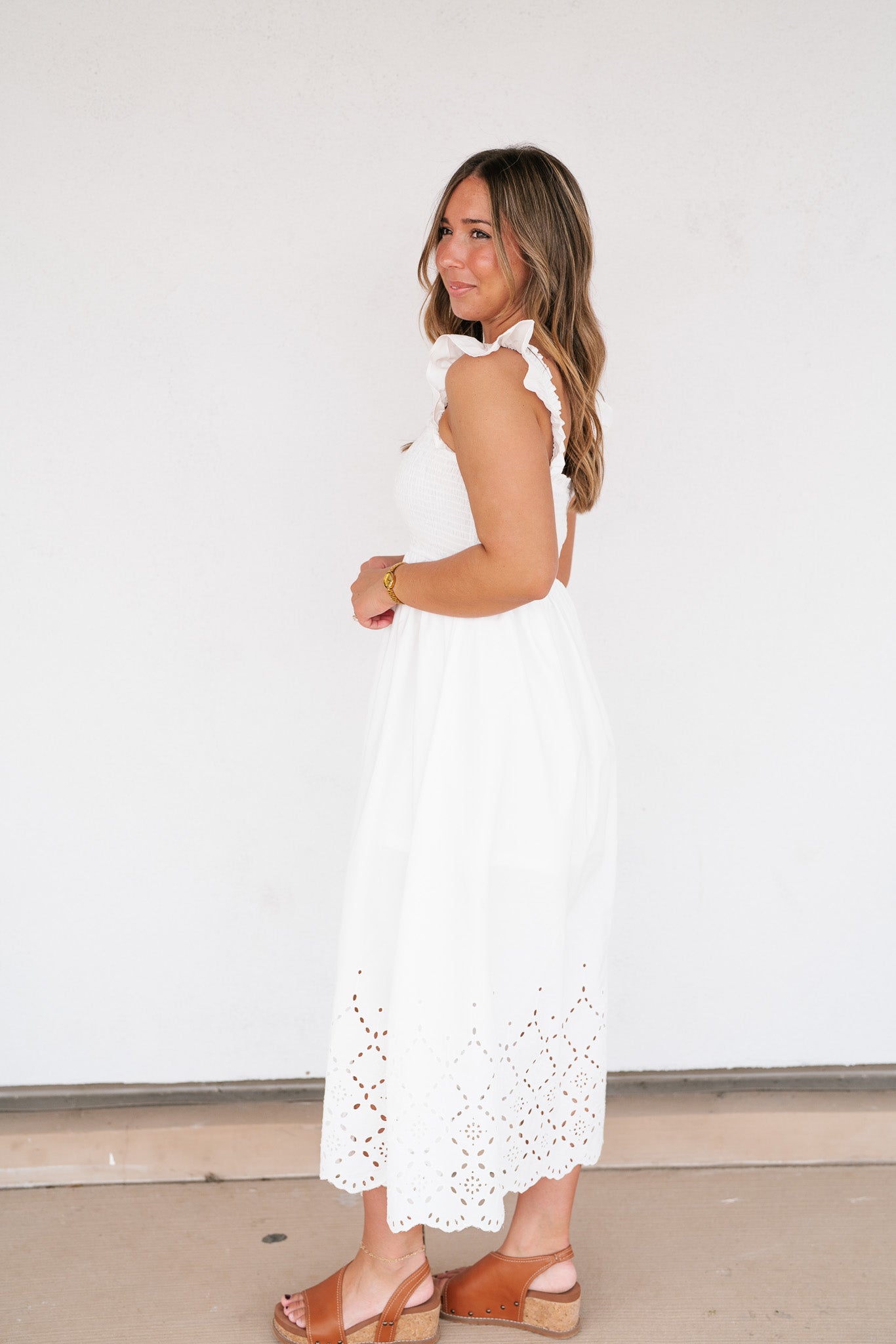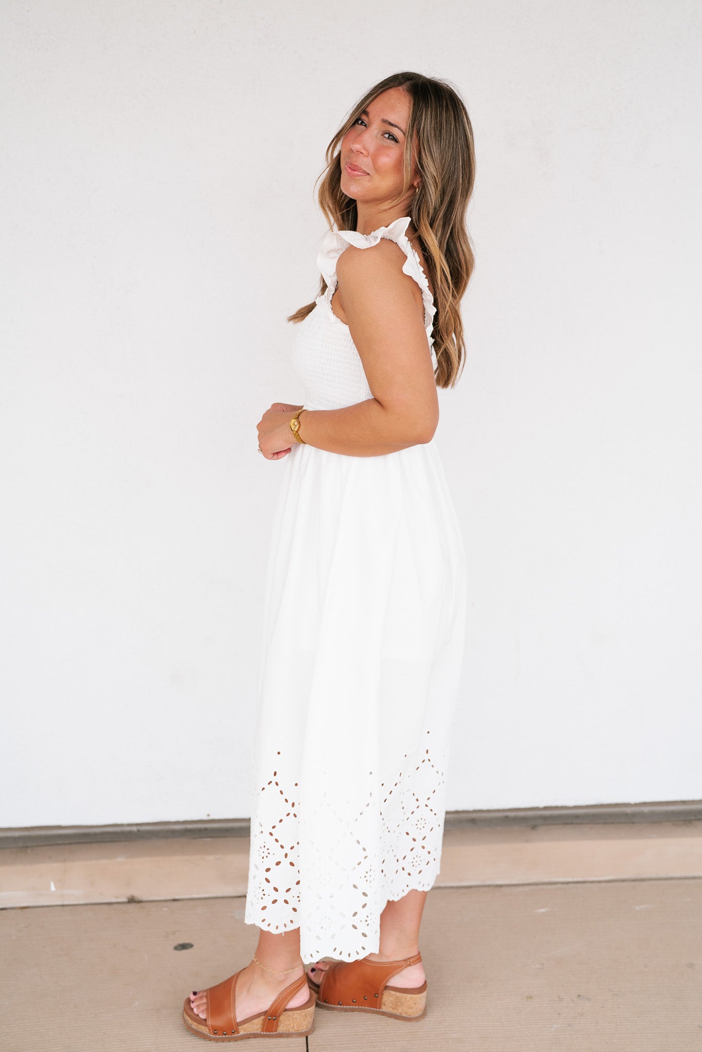Graceful and timeless, the Rosemere Smocked Ruffle Sleeve Midi Dress brings a touch of romantic charm to every occasion. This elegant dress features a smocked bodice that offers a flattering, flexible fit, while two-inch ruffle sleeves add a feminine and playful finish. The midi-length skirt flows beautifully and is accented with delicate eyelet embroidery around the hem, creating soft movement and a vintage-inspired feel.