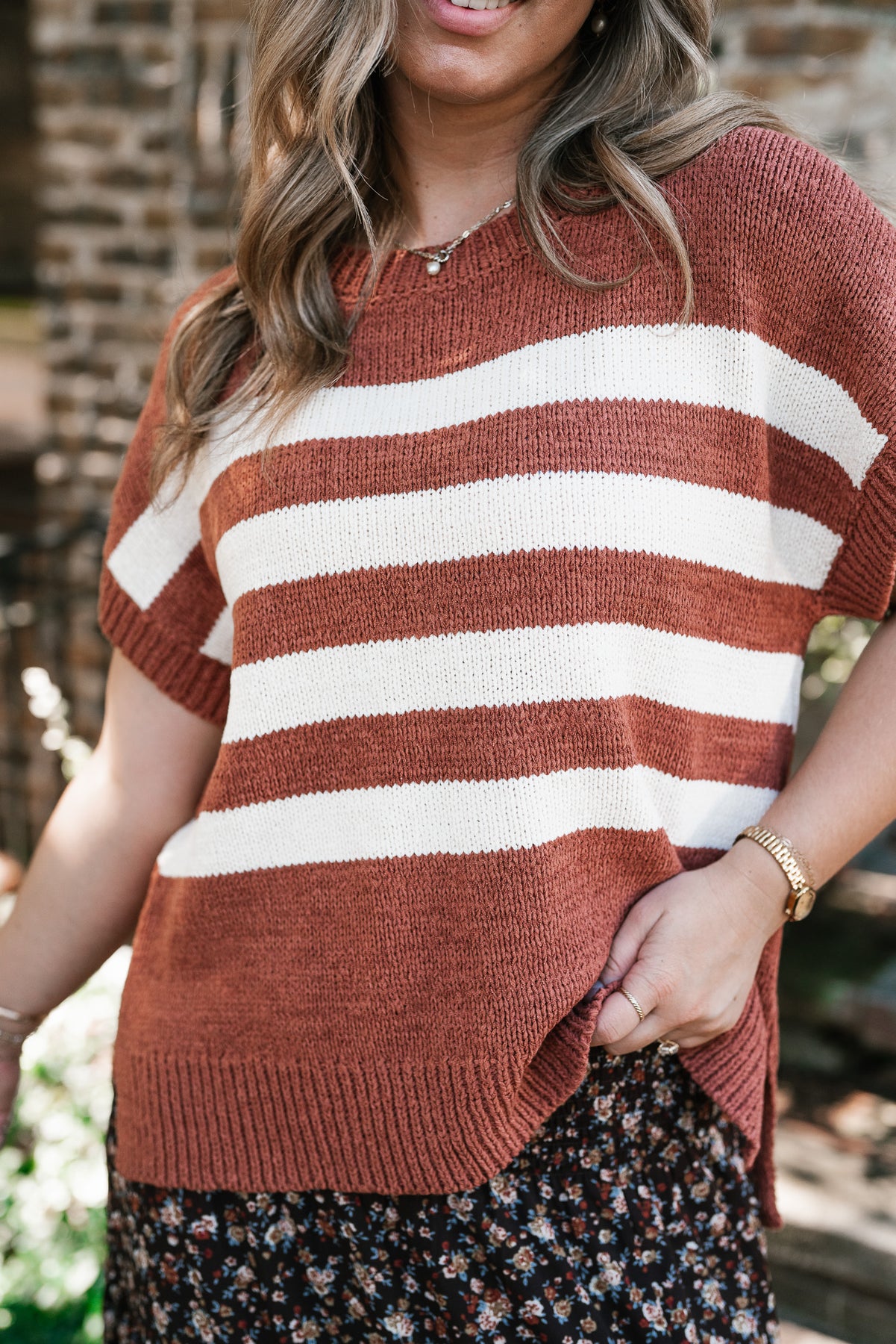 Featuring bold brick and cream stripes, this relaxed pullover blends comfort with timeless style. The short sleeves and lightweight knit make it perfect for layering across seasons, while the classic crew neckline keeps it polished.