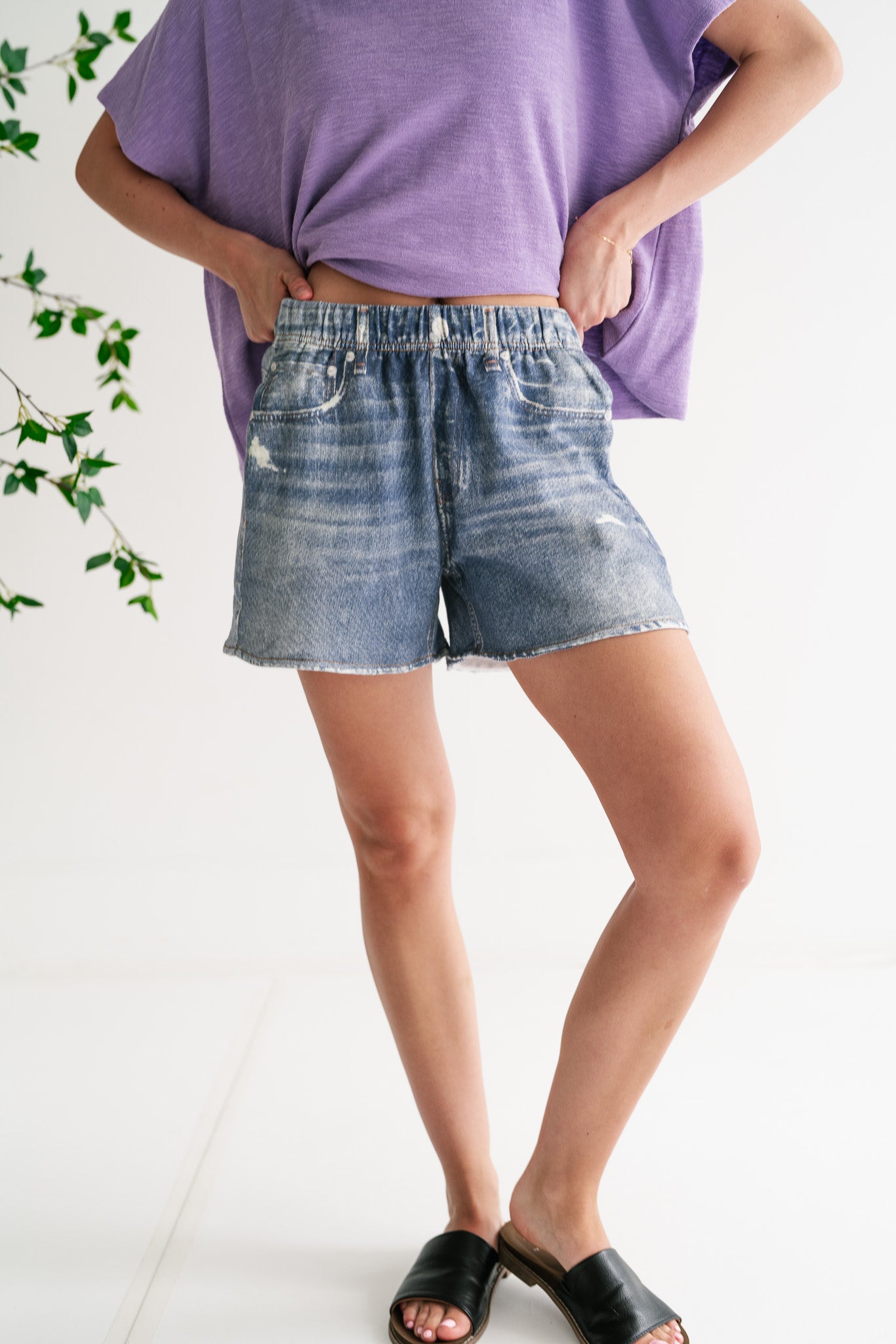 Meet your new go-to statement denim—without the weight of real denim. These relaxed-fit wide leg shorts are crafted from lightweight fabric with a realistic denim print, giving you that classic blue jean look with an ultra-soft, breathable feel.