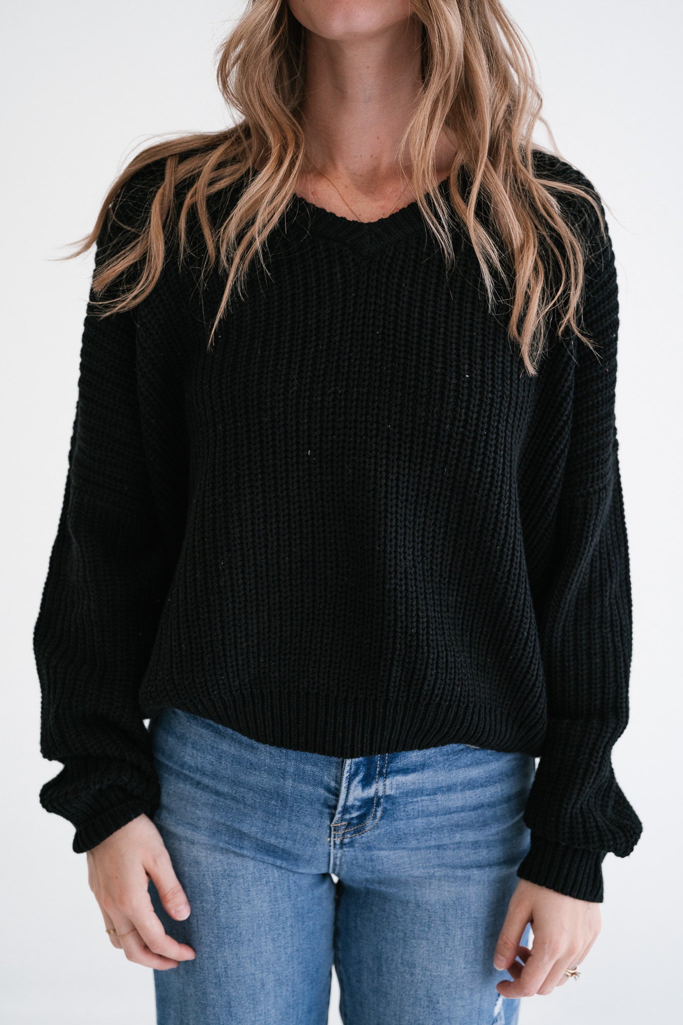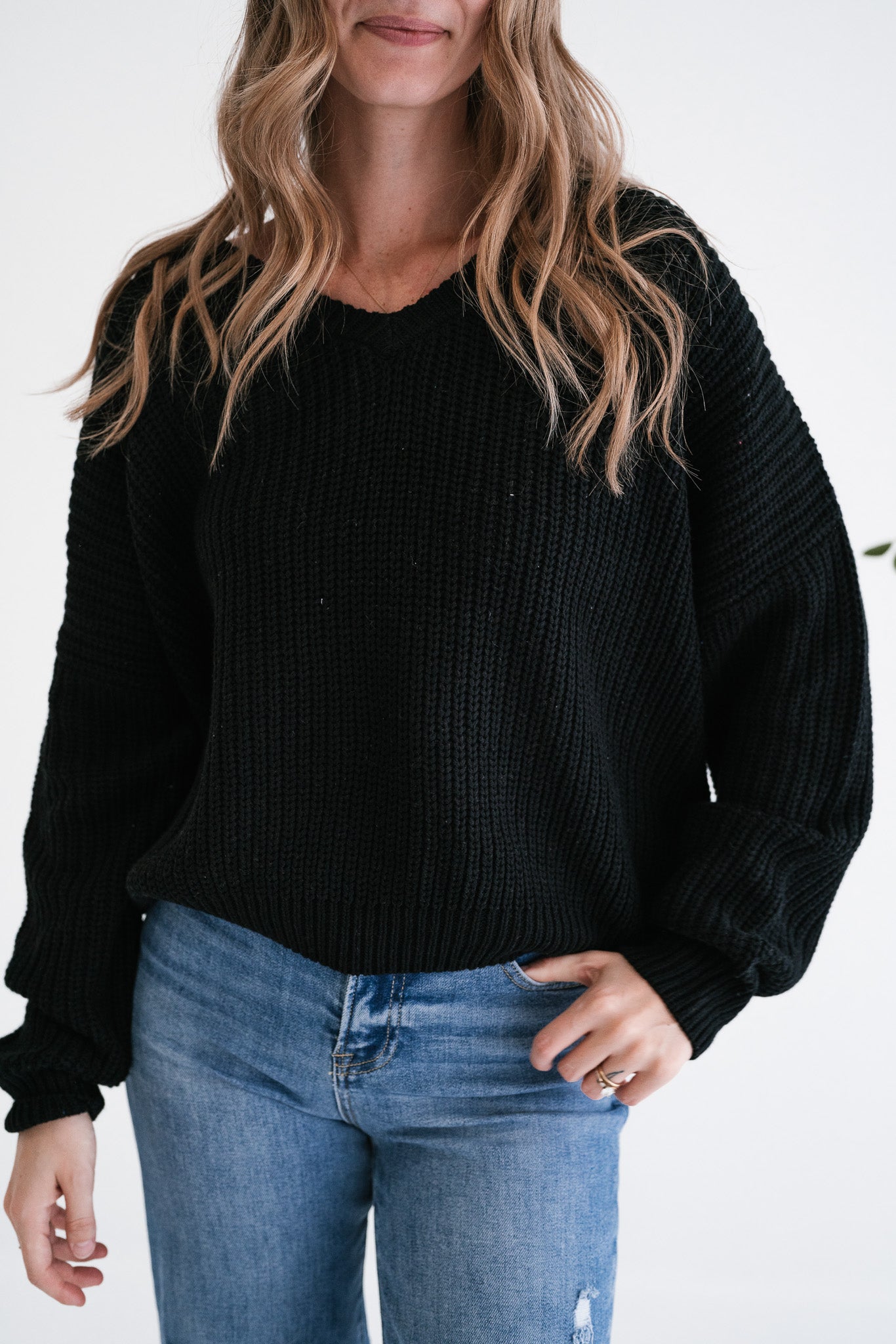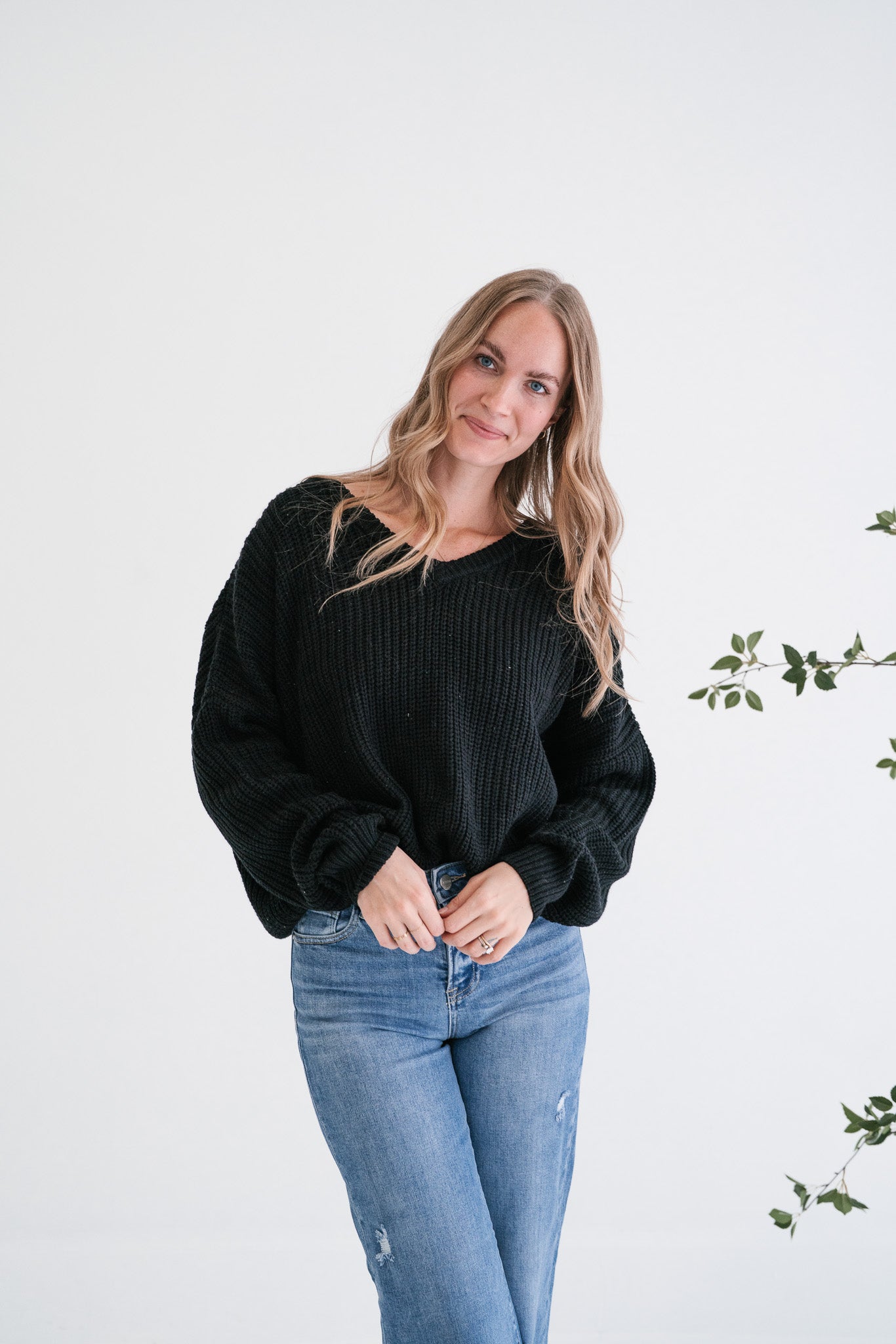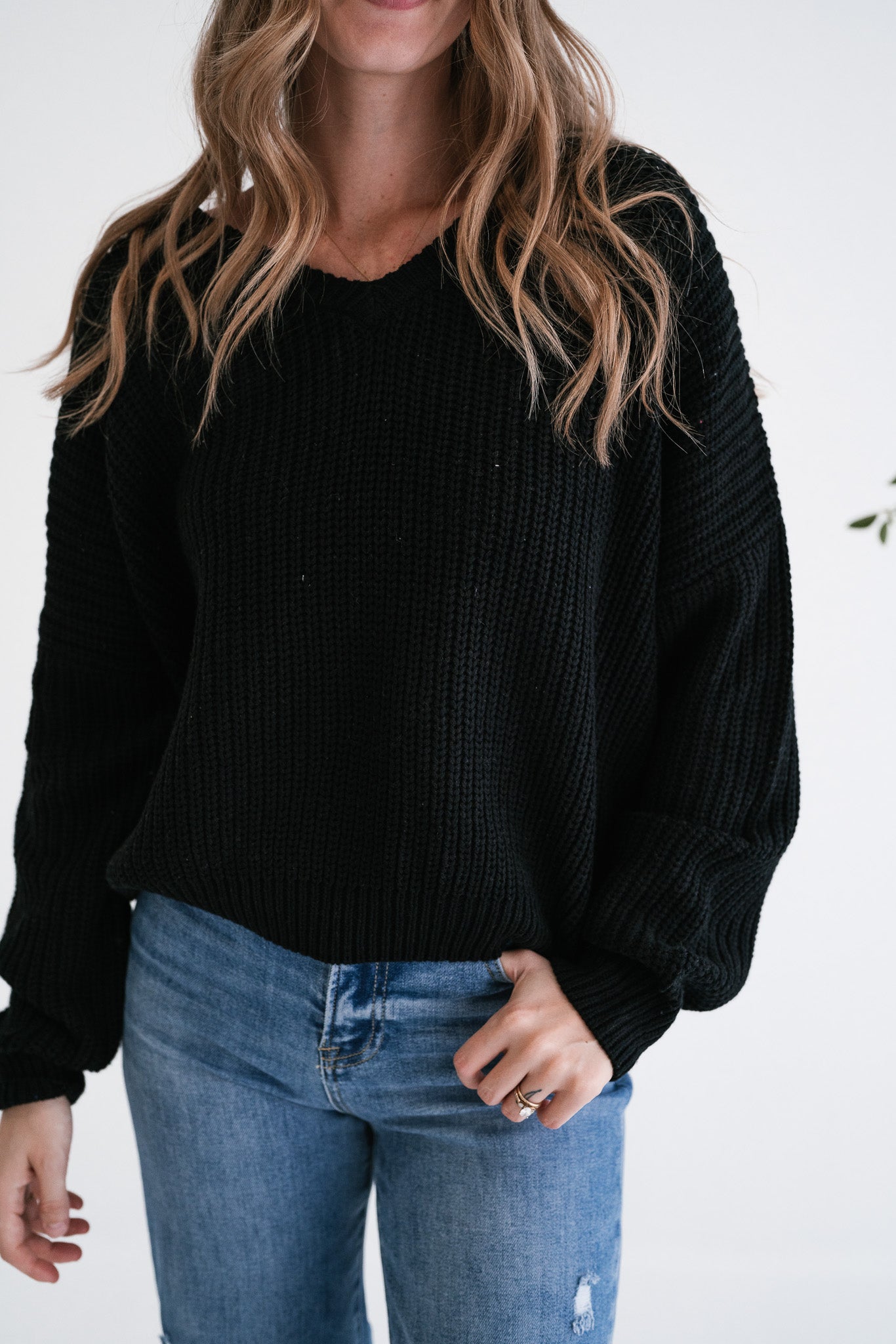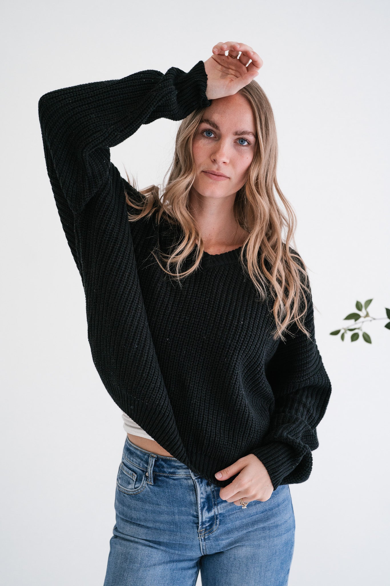 Embrace unparalleled comfort and style with our Blackstone Oversized Ribbed V-Neck Knit Sweater. This timeless black pullover is designed for the modern woman who values both fashion and ease. Its relaxed silhouette and soft, chunky ribbed knit fabric offer a luxurious feel, making it your go-to piece for cozy evenings or stylish daytime outings. The flattering V-neckline adds a touch of sophistication, perfect for showcasing a delicate necklace or layering over a collared shirt. With its spacious, oversized fit, this sweater provides ultimate comfort without compromising on elegance. The long, voluminous sleeves complete the contemporary look, ensuring you stay warm while looking effortlessly put-together. Pair this versatile black sweater with your favorite jeans for a casual weekend vibe, dress it up with tailored trousers for a smart-casual office look, or layer it over a slip dress for an evening out. A true wardrobe staple, it promises to elevate any outfit with its sophisticated simplicity and cozy charm. Discover your new favorite cold-weather essential.