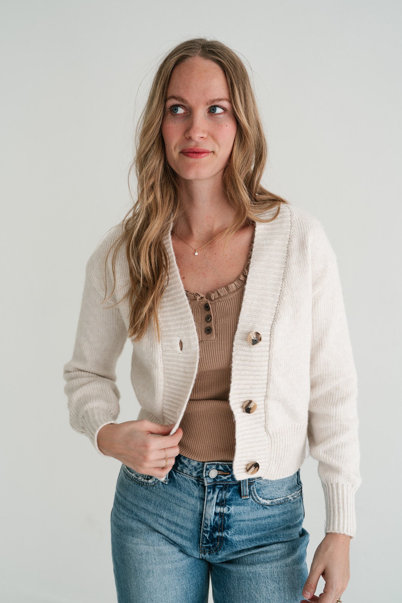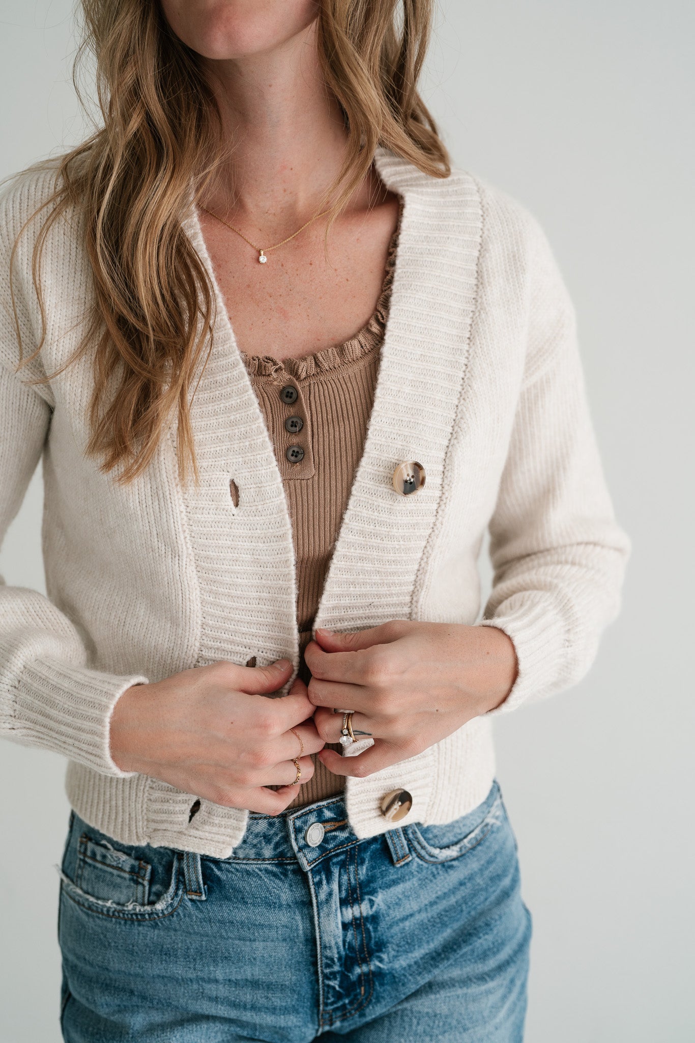 Elevate your everyday style with our essential Fireside Moments Ribbed Knit V-Neck Button-Up Cardigan. Crafted for comfort and versatility, this timeless piece in a beautiful neutral hue is perfect for effortlessly layering over any outfit, bringing a touch of sophisticated ease to your look. Experience the luxurious softness of its ribbed knit texture, designed to provide cozy warmth without compromising on style. Featuring a flattering V-neckline and classic button-up front, this cardigan offers a relaxed fit that drapes beautifully, making it an ideal choice for both casual outings and more polished ensembles. Whether you pair it with jeans for a laid-back weekend vibe, layer it over a dress for a chic office look, or wear it open with a tank top, this versatile cardigan is a wardrobe staple. Its durable construction ensures lasting comfort and style, making it a go-to piece for transitional weather and beyond.