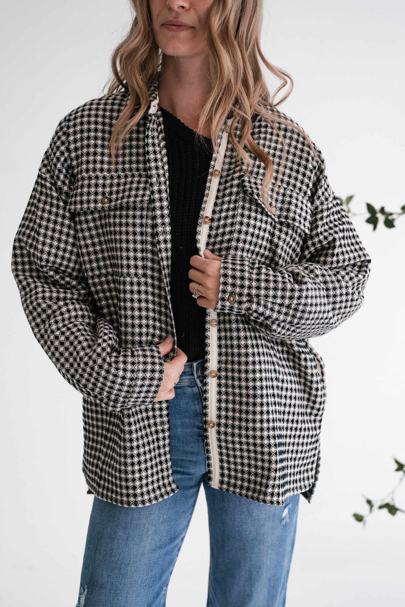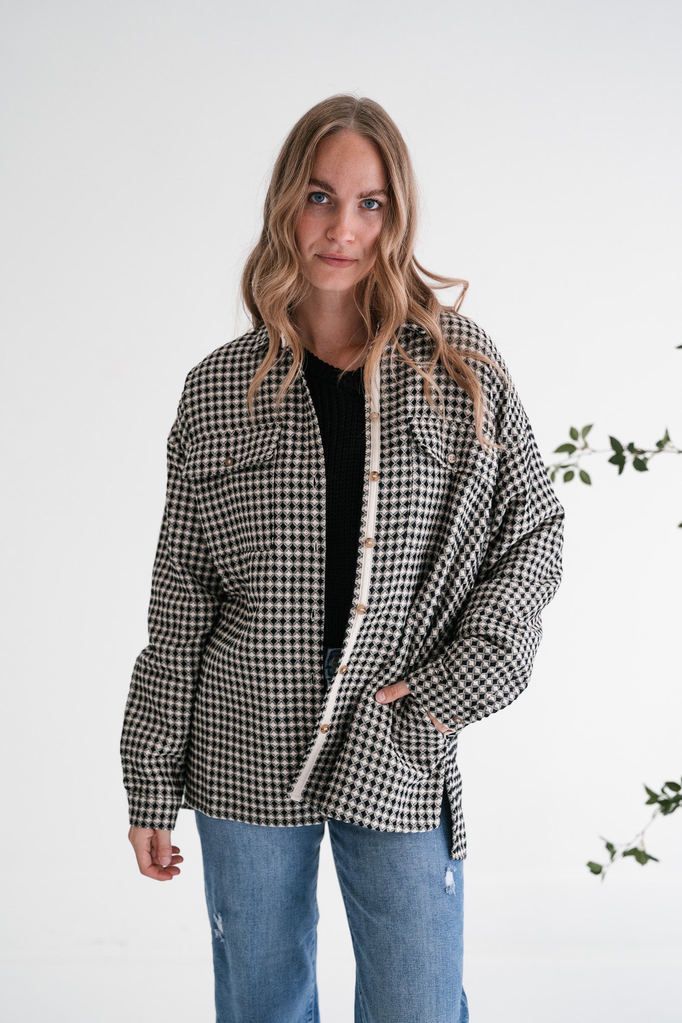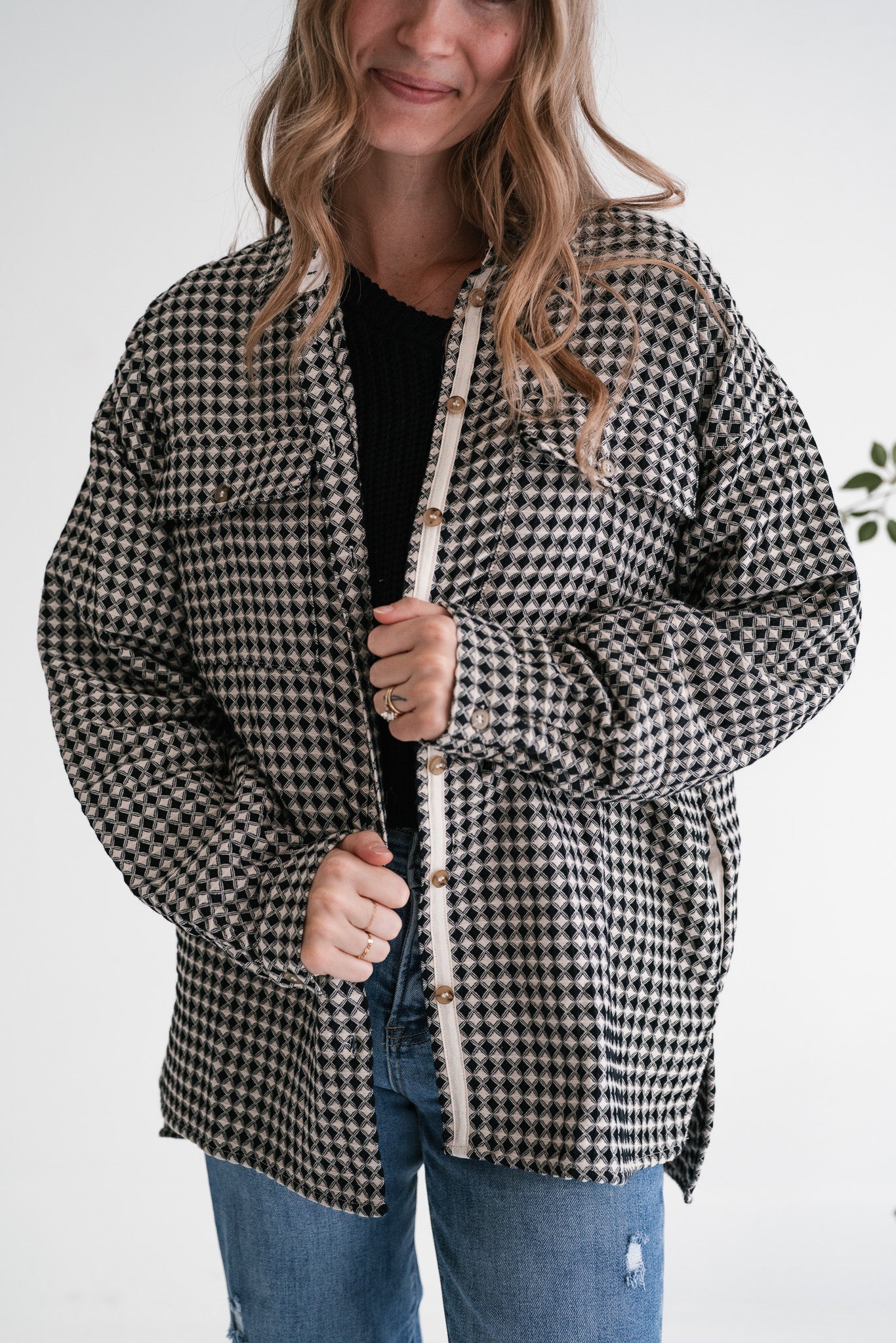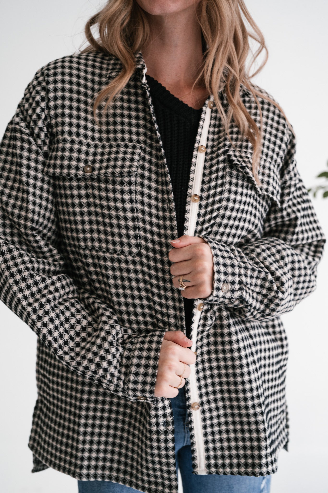 Elevate your everyday style with our stunning City Grid Textured Button-Front Shacket. This unique piece features a captivating black and beige diamond-like pattern that adds a sophisticated touch to any outfit. Designed with a comfortable, oversized fit and a classic collar, it perfectly blends modern trends with timeless appeal, making it an essential addition to your wardrobe.