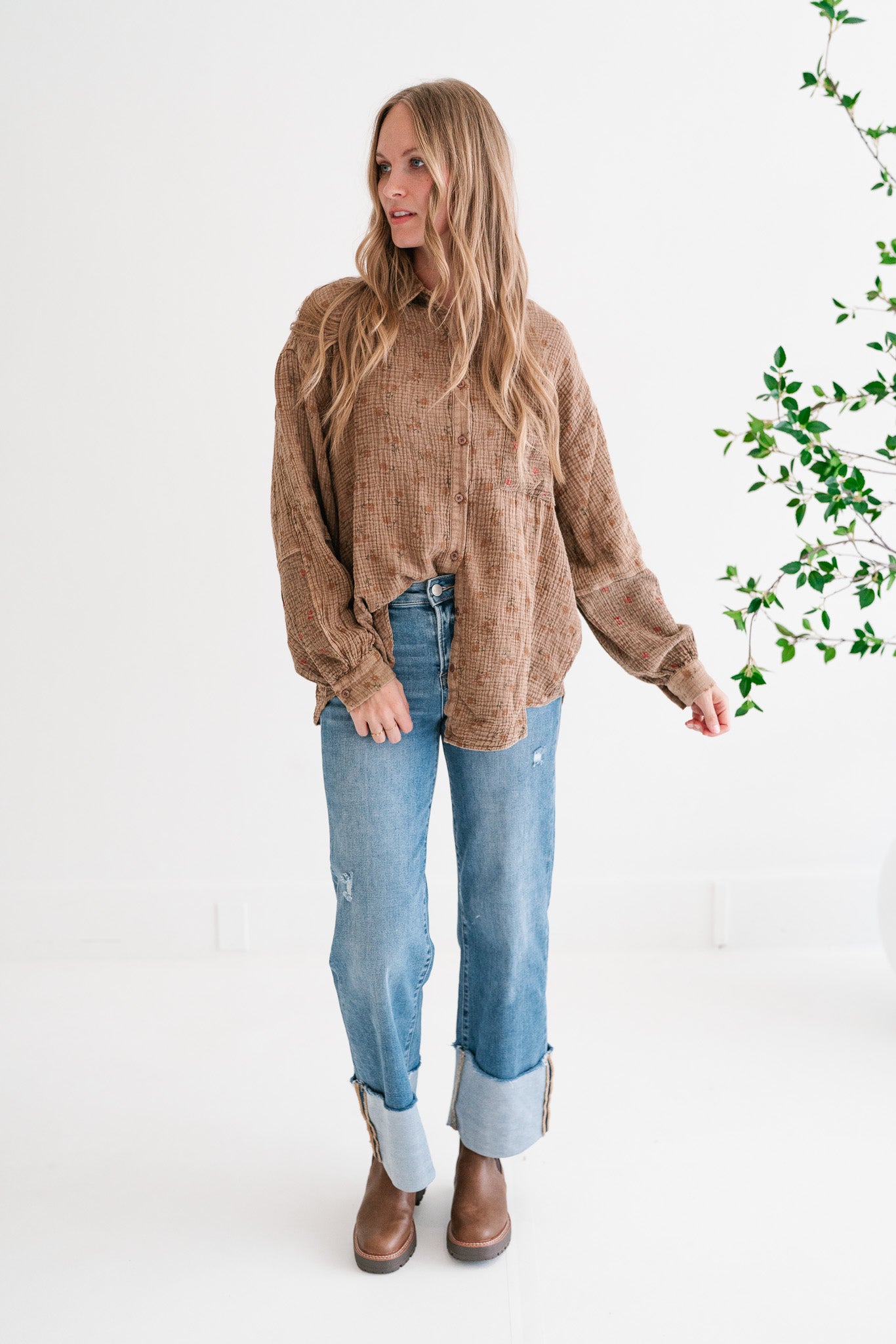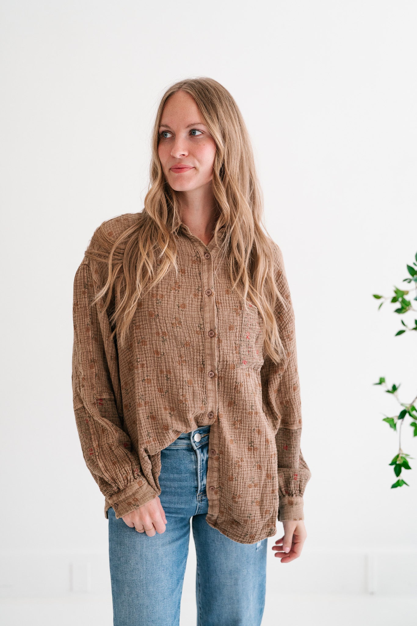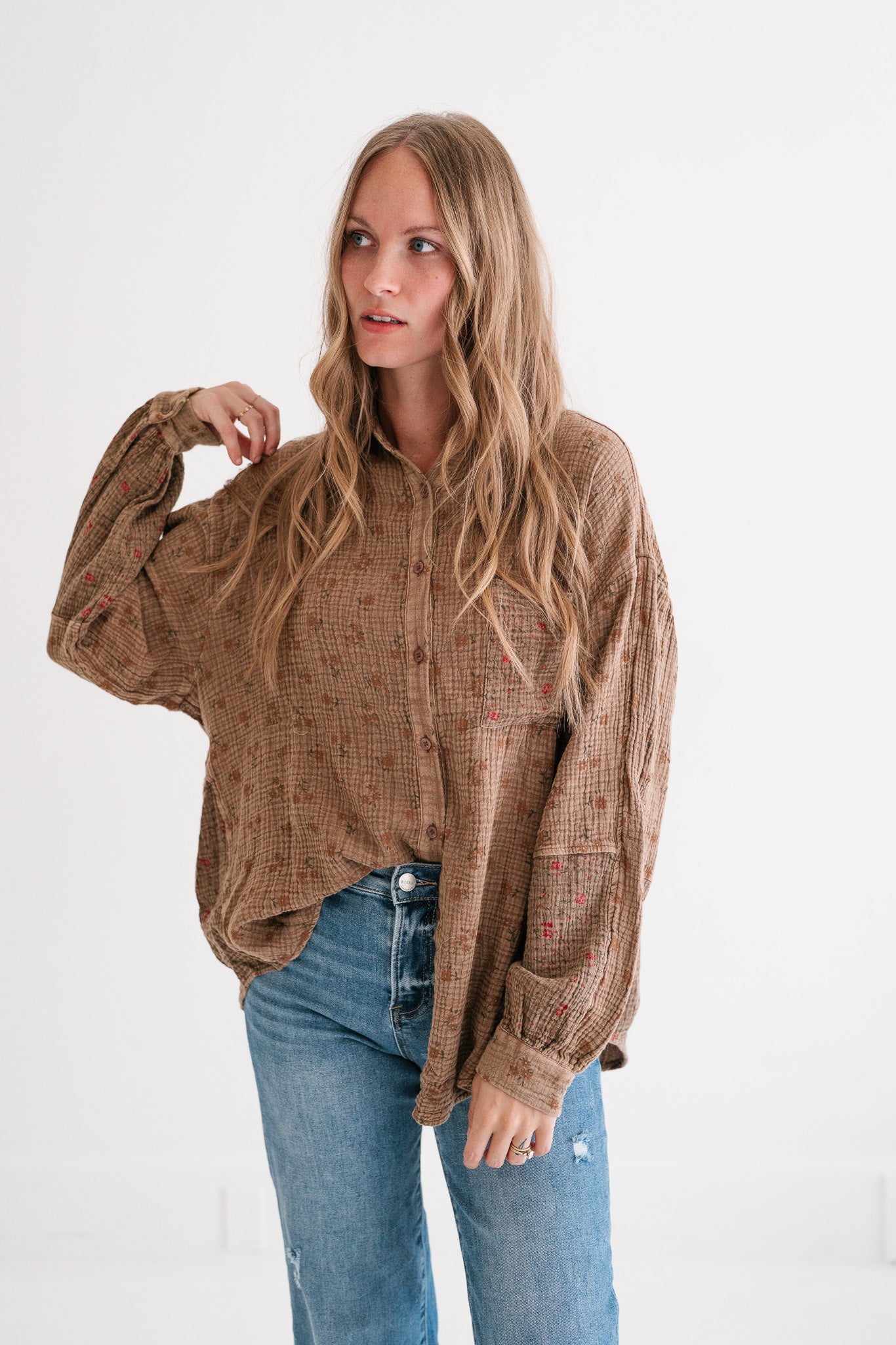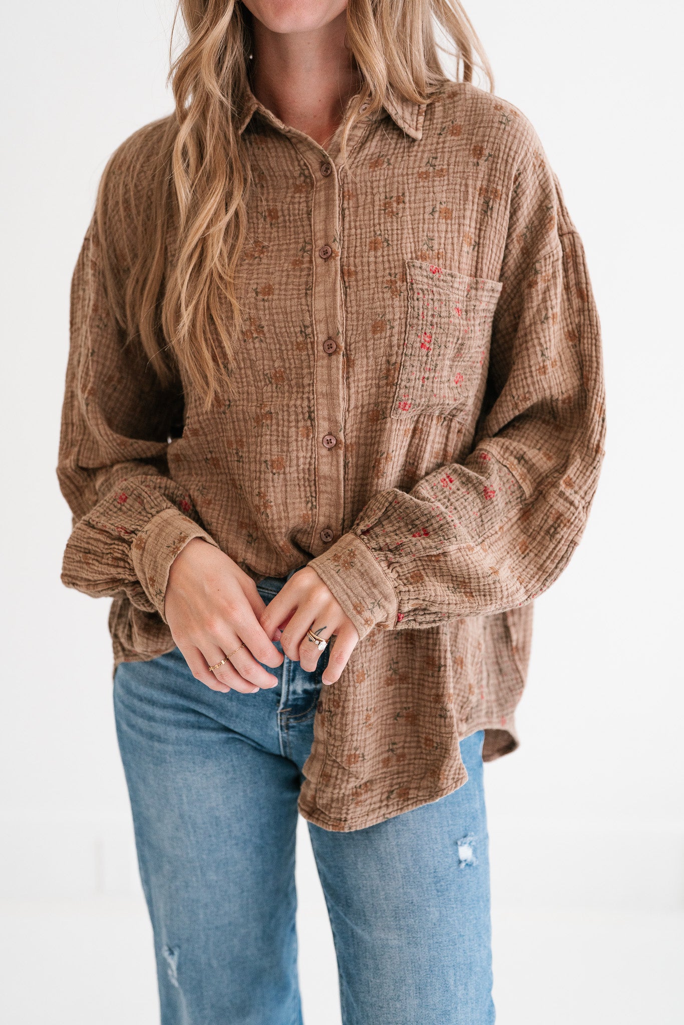 Embrace effortless style and comfort with our Rustic Relaxed Boho Floral Crinkle Gauze Button-Up Shirt. This charming blouse features a beautiful brown hue adorned with a subtle, all-over floral pattern, perfect for adding a touch of nature-inspired elegance to your everyday wardrobe. Crafted from a lightweight, textured crinkle gauze fabric, it offers unmatched breathability and a relaxed, breezy feel that's ideal for transitional weather.