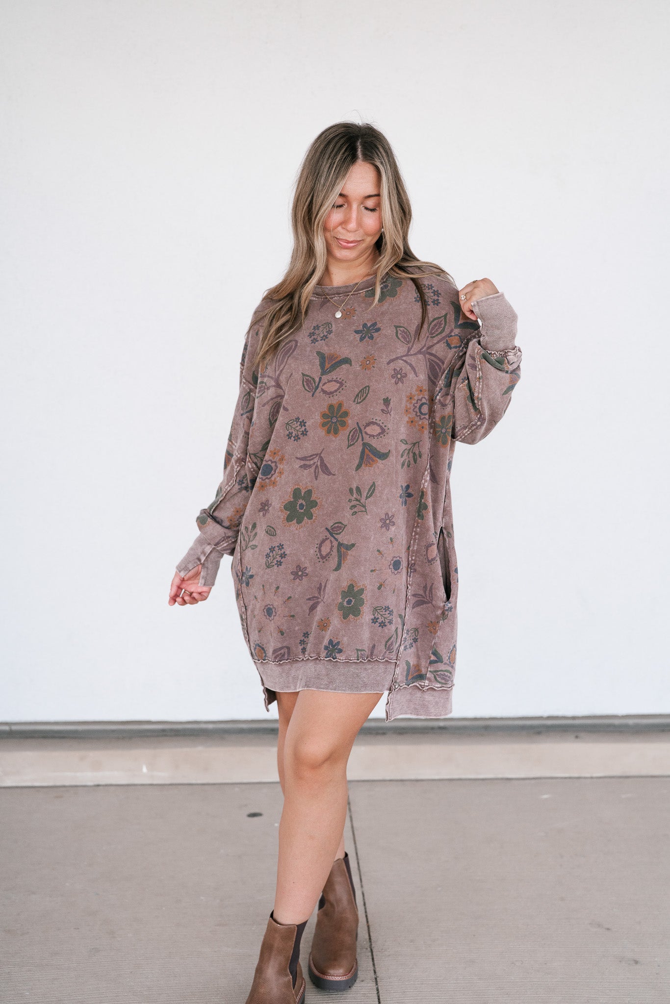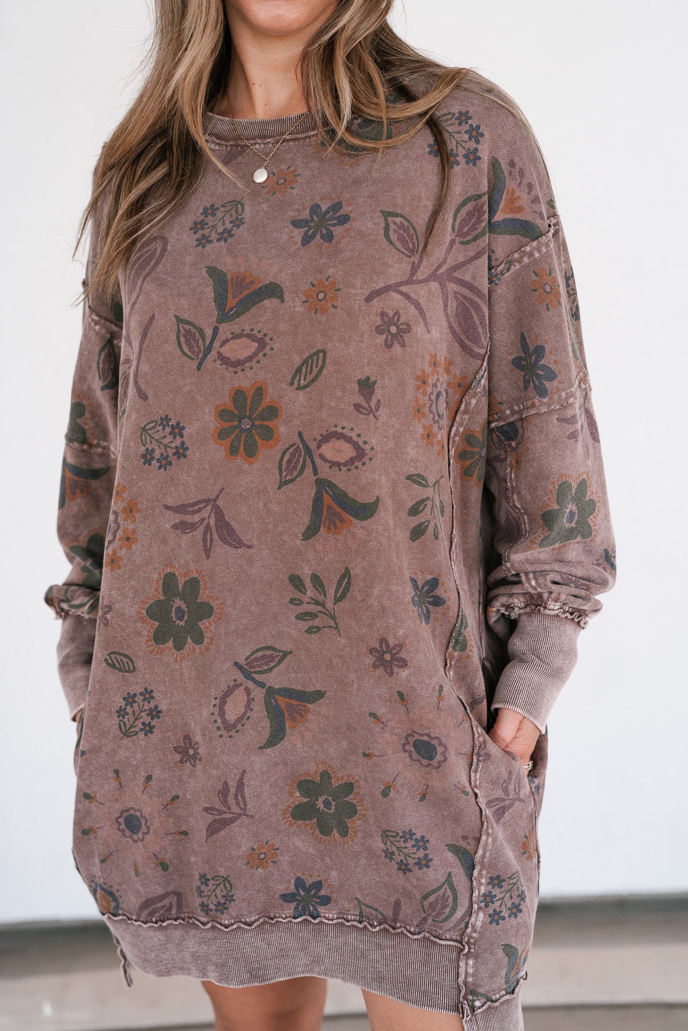 Meadow Muse Long Sleeve Mineral Wash Tunic Top – Floral Washed Oversized Top