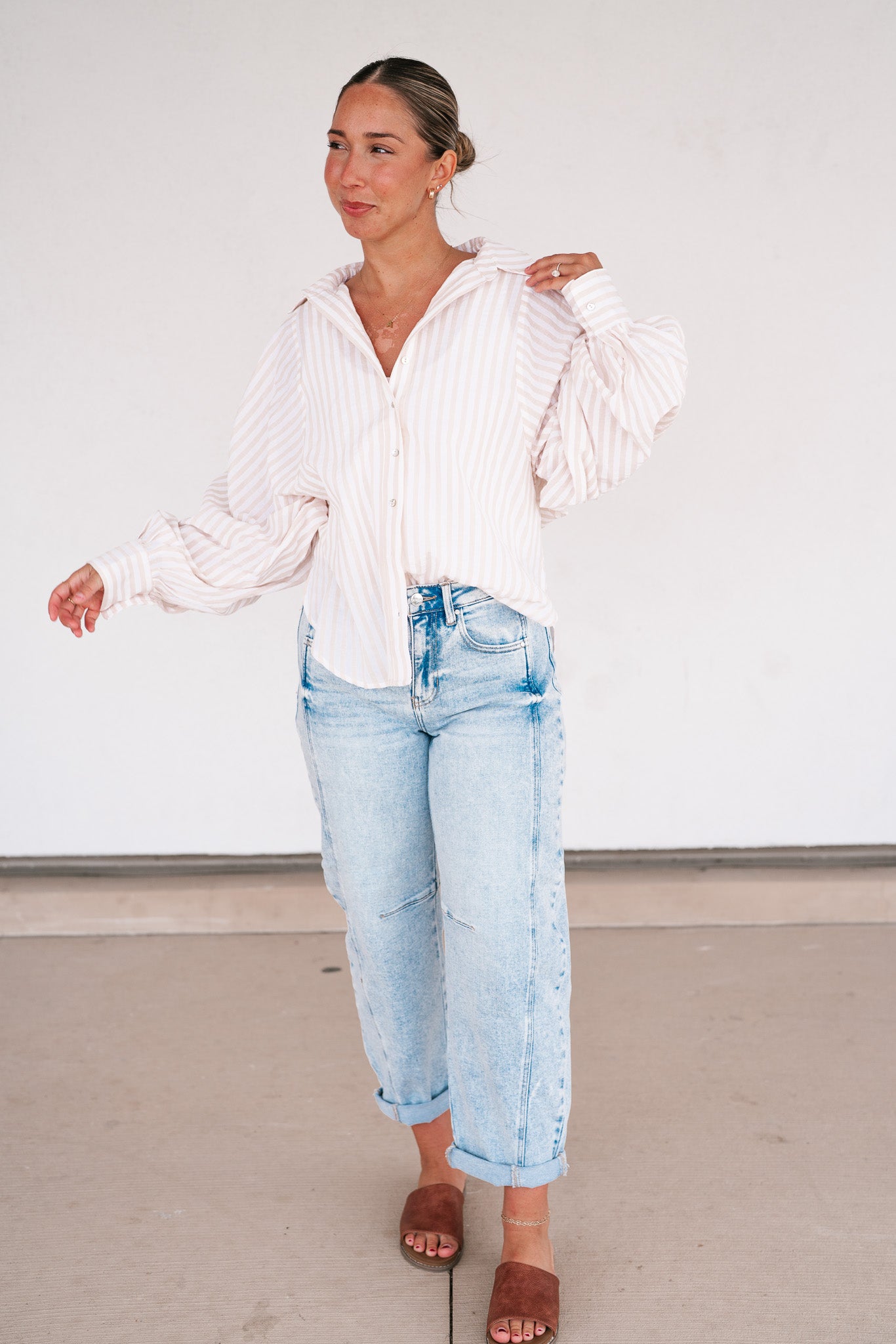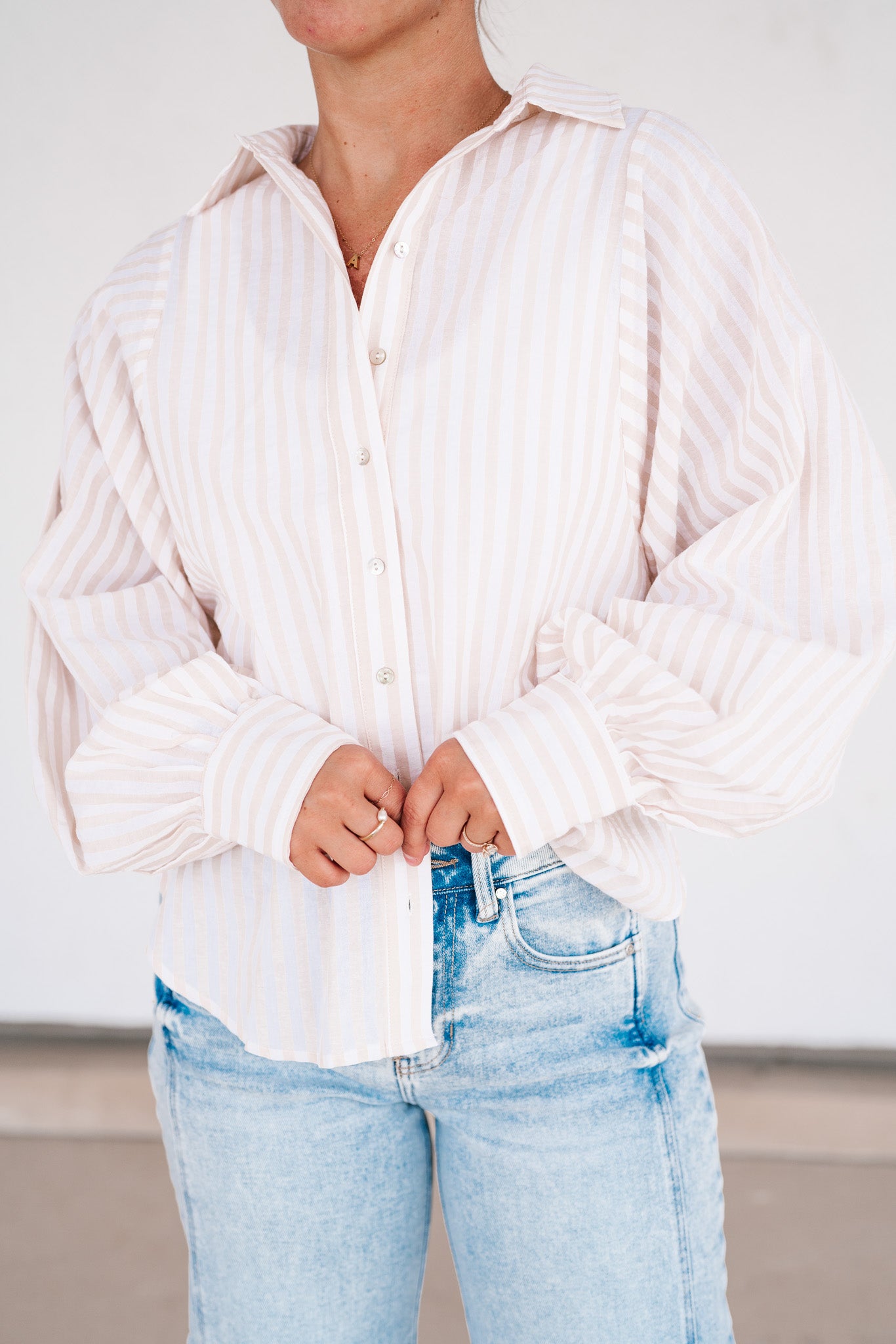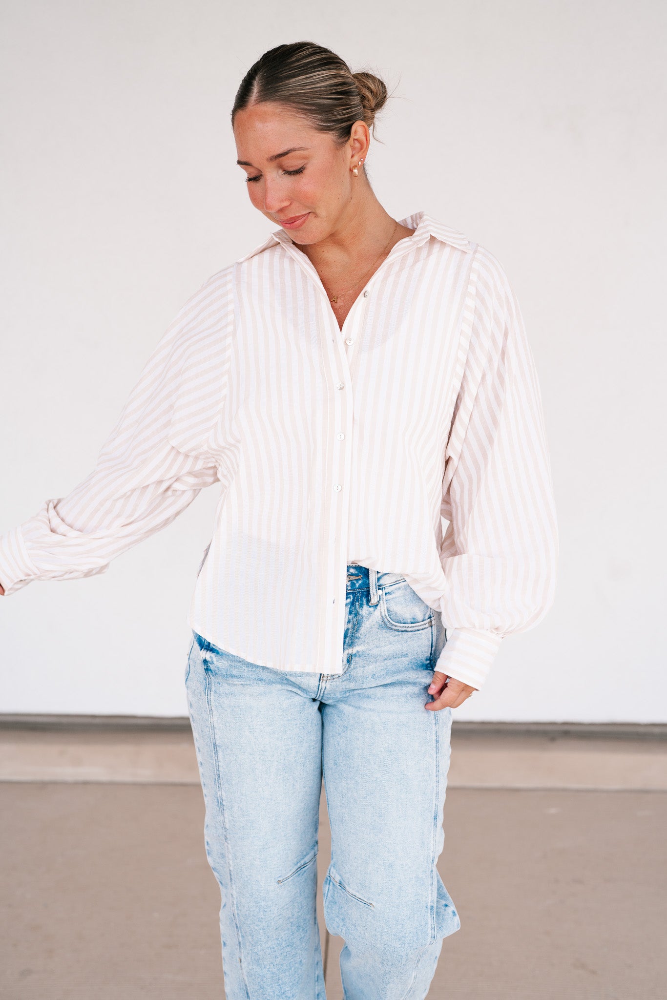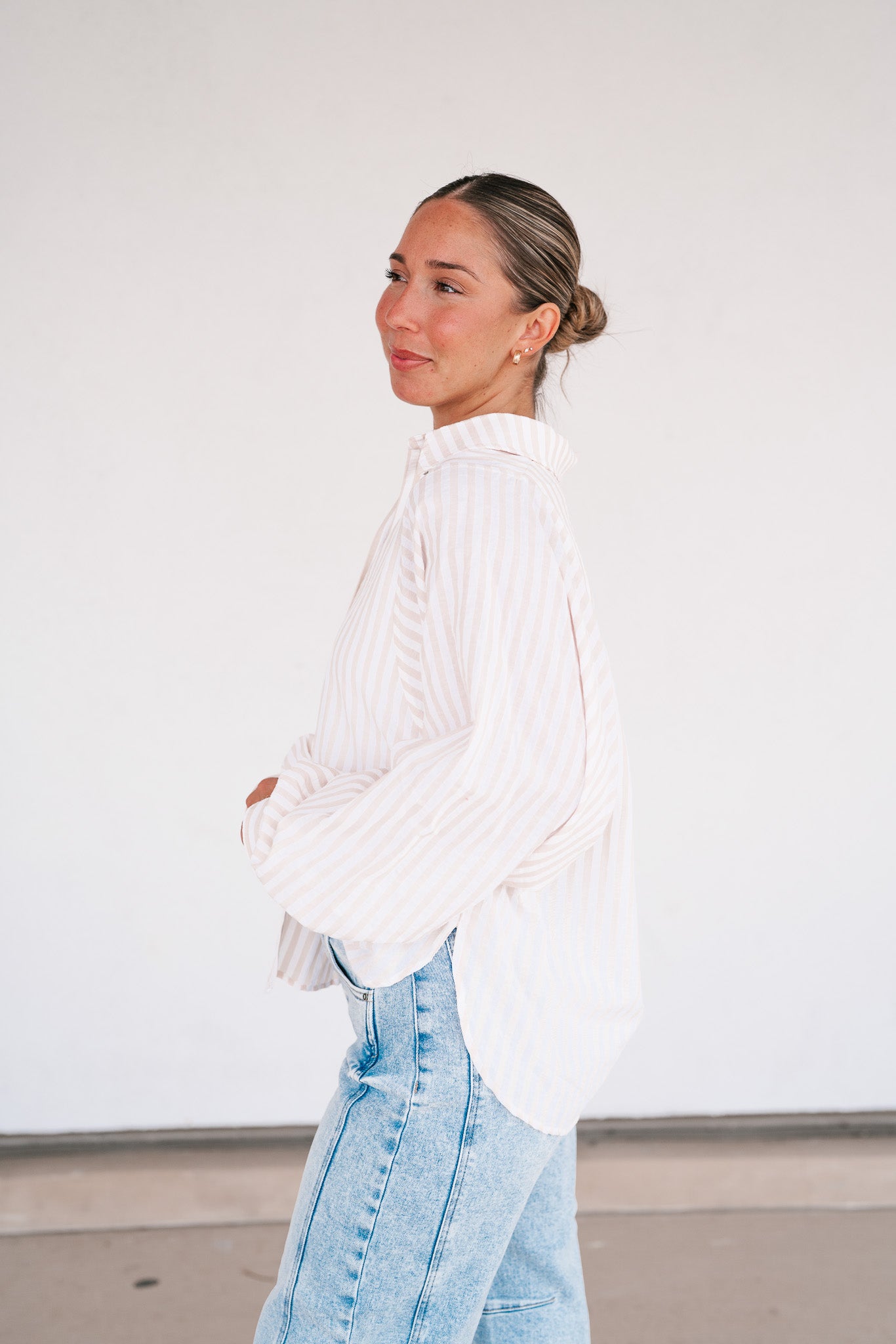 Meet your new go-to for effortless style—the Natural & White Striped Button-Up Shirt. Designed for the modern woman on the go, this lightweight, breathable blouse offers a relaxed fit with a soft, airy fabric that drapes beautifully. Featuring a classic collared neckline, button-front closure, and long sleeves with cuffed detailing, this timeless piece can be styled in endless ways—wear it loose for a casual, breezy look or tuck it in for a polished finish. Whether paired with denim for a laid-back weekend vibe or layered over a tank for an effortless coastal aesthetic, this striped shirt is a versatile wardrobe essential.