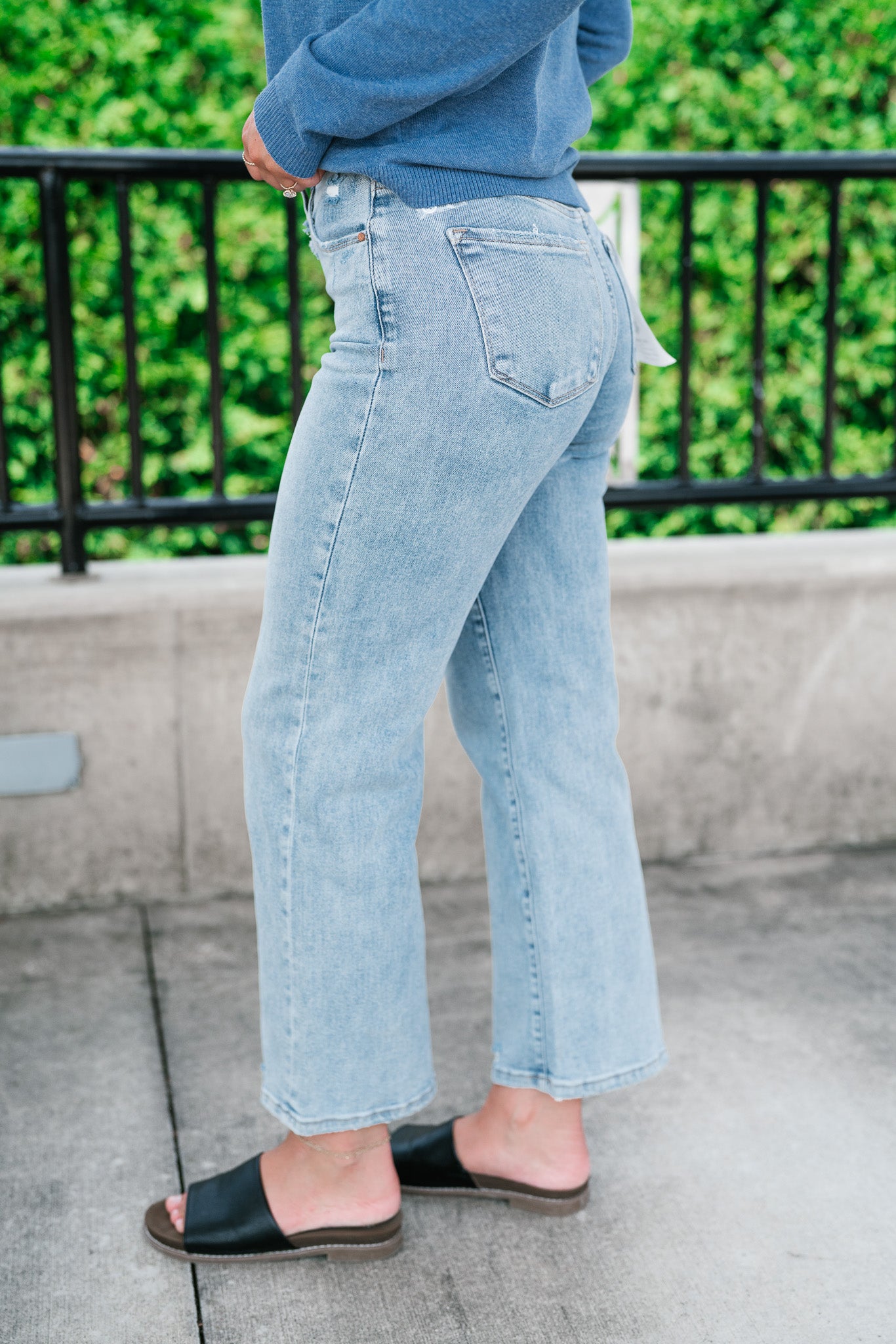 Introducing the Risen Nova High Rise Tummy Control Wide Leg Jean, a stylish and comfortable addition to your wardrobe. These jeans feature a high-rise fit, designed to provide excellent tummy control for a flattering silhouette. The light wash denim has subtle fading and whiskering, adding a trendy vintage-inspired look. With a wide-leg cut, these jeans offer a relaxed and fashion-forward fit, perfect for pairing with boots or sneakers. The slight distressing around the pockets adds a casual, worn-in vibe, making these jeans both versatile and chic. Whether you're dressing them up or down, the Nova Wide Leg Jeans are perfect for the modern woman seeking both comfort and style.