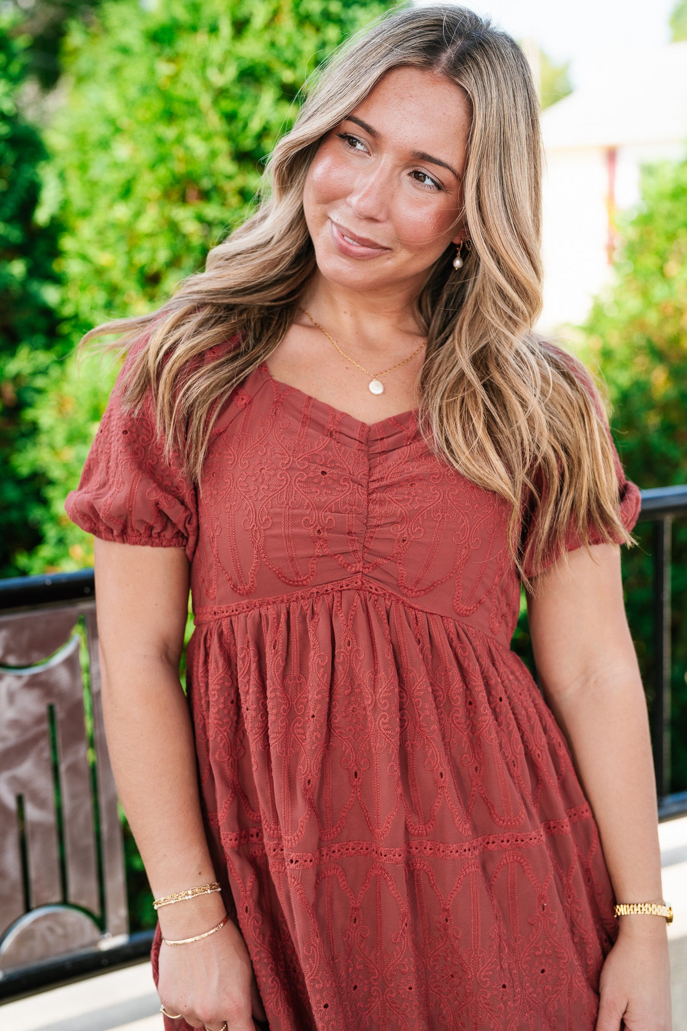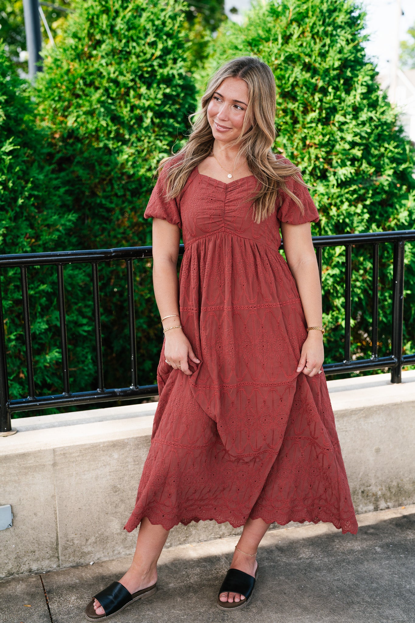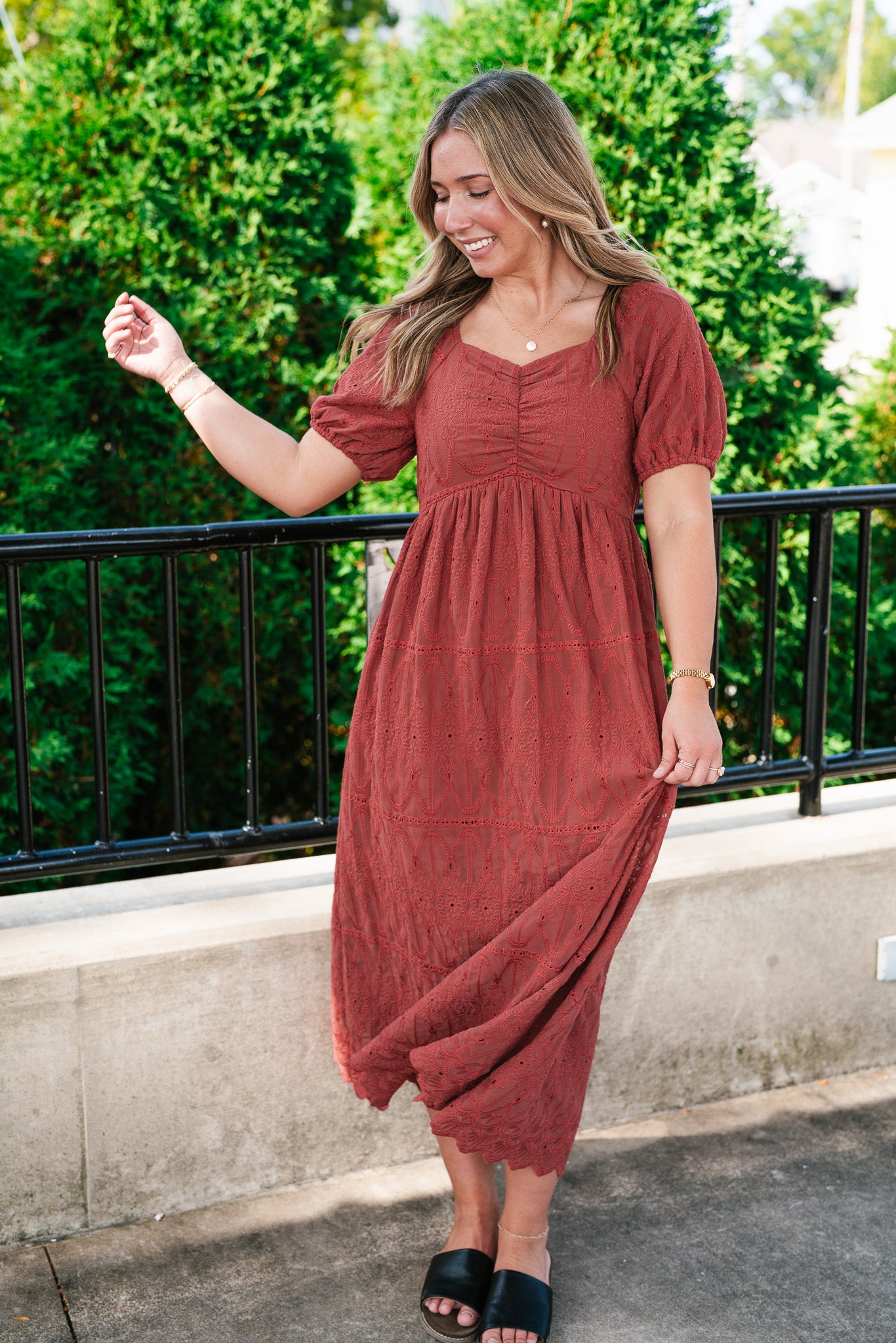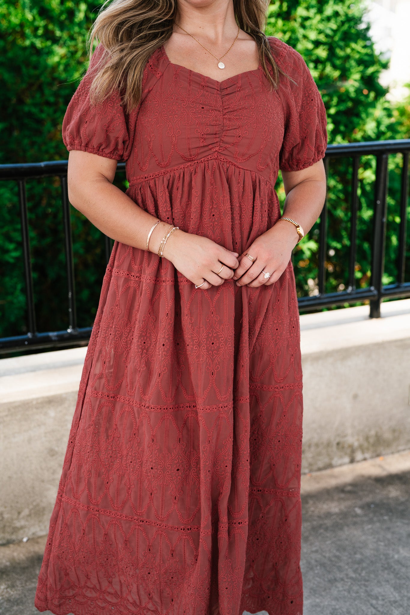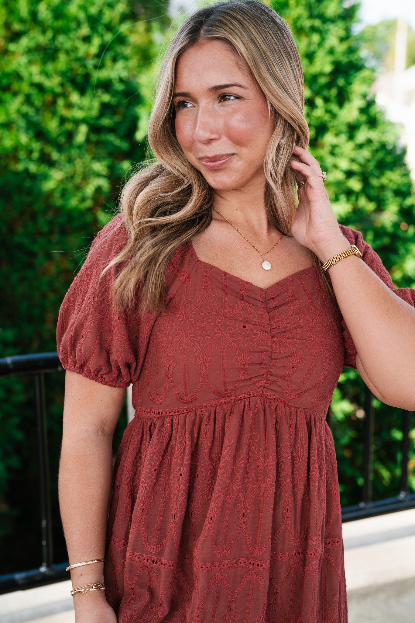 This rich rust-toned beauty is crafted with intricate embroidered detailing that adds depth and texture to its feminine silhouette. The puff sleeves bring a soft, romantic touch, while the square neckline and empire waist create a flattering shape that works for any occasion. Perfect for seasonal gatherings, date nights, or casual afternoons, this dress is a statement piece that blends comfort with sophistication.