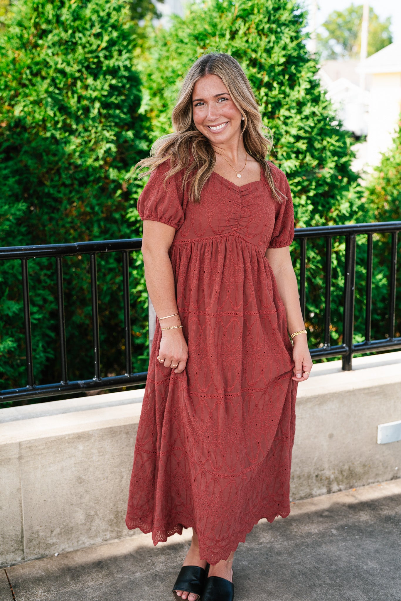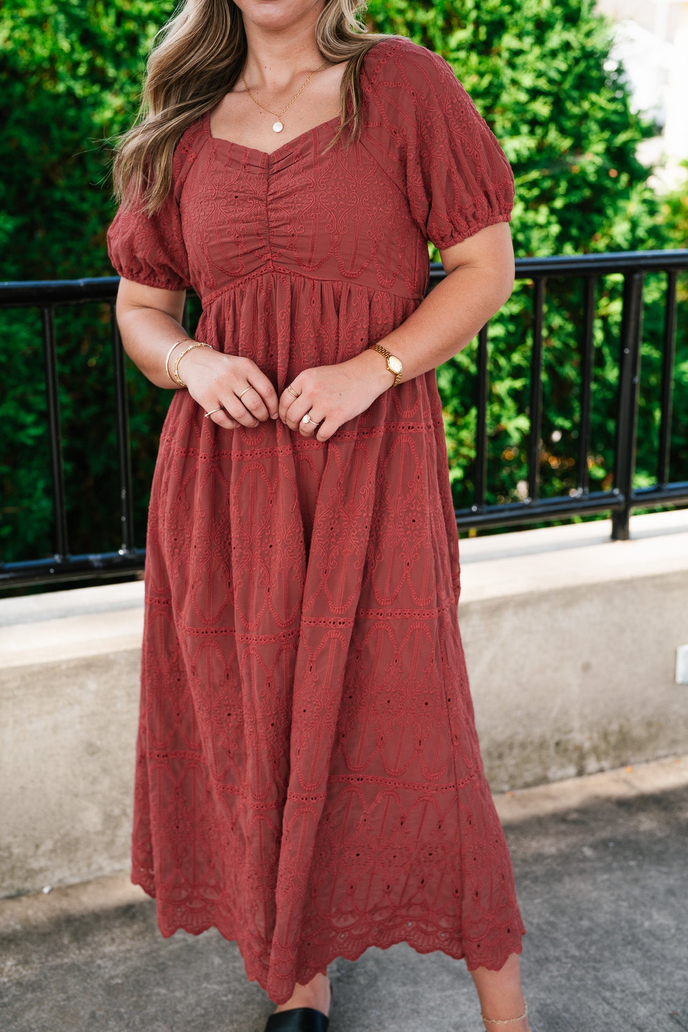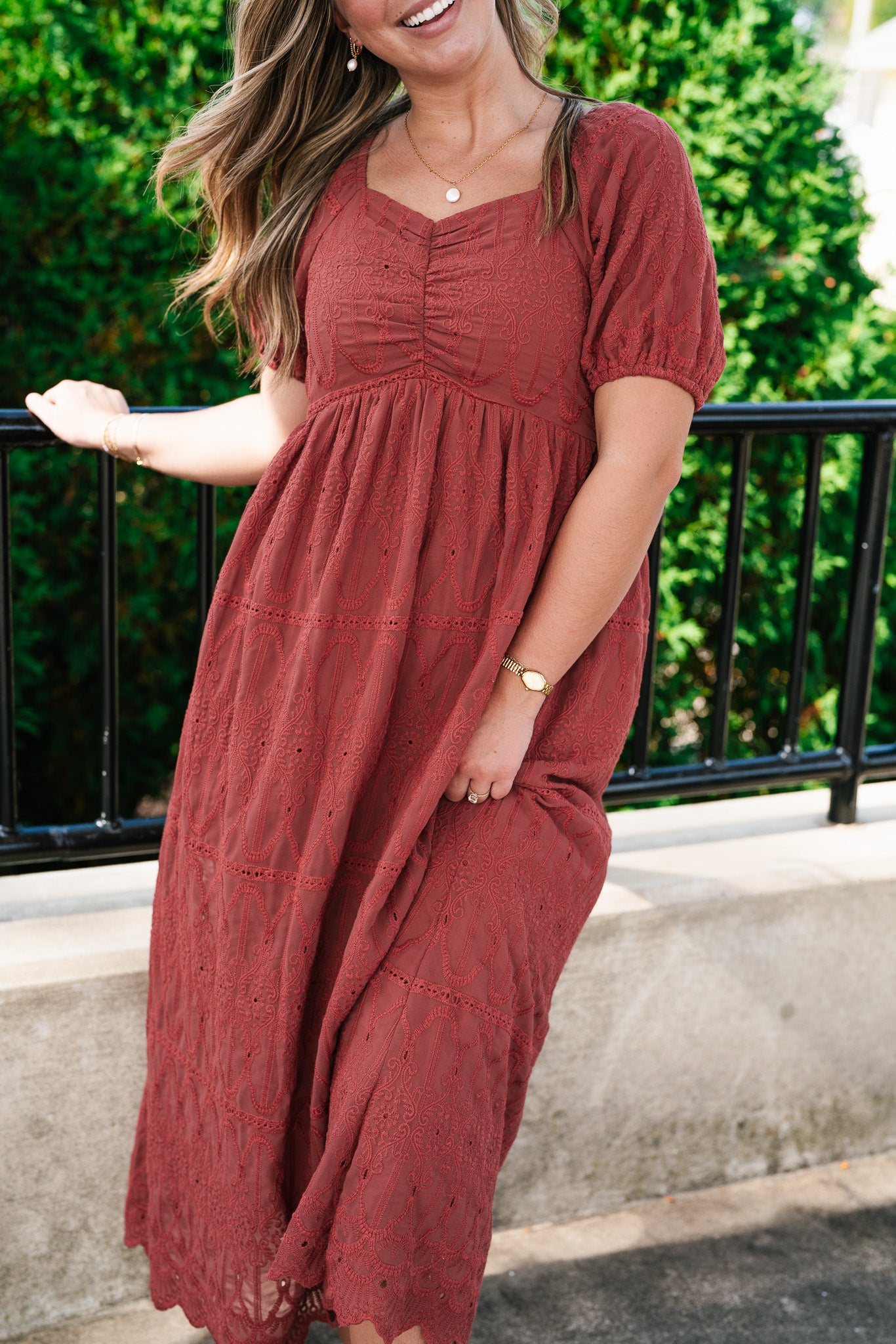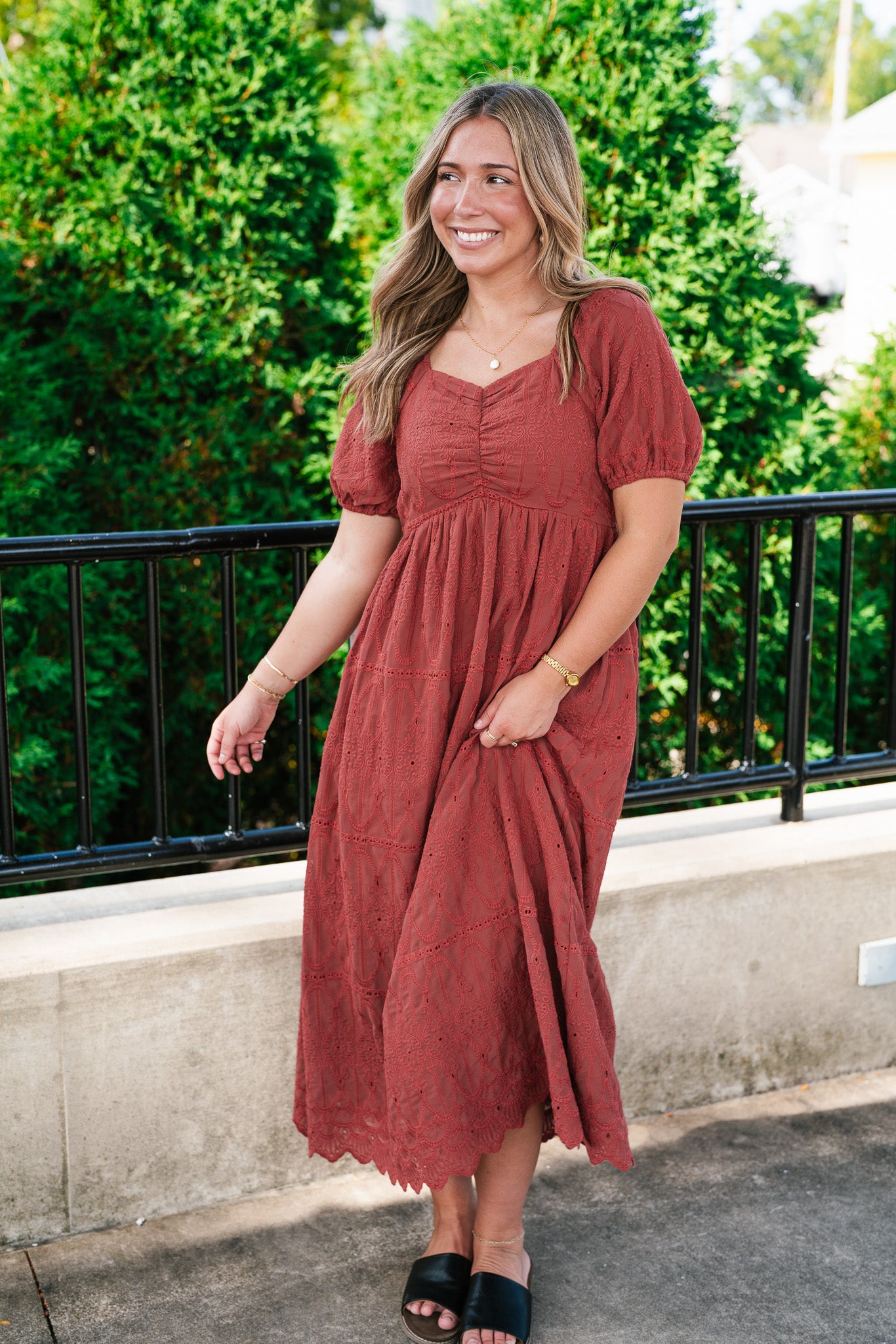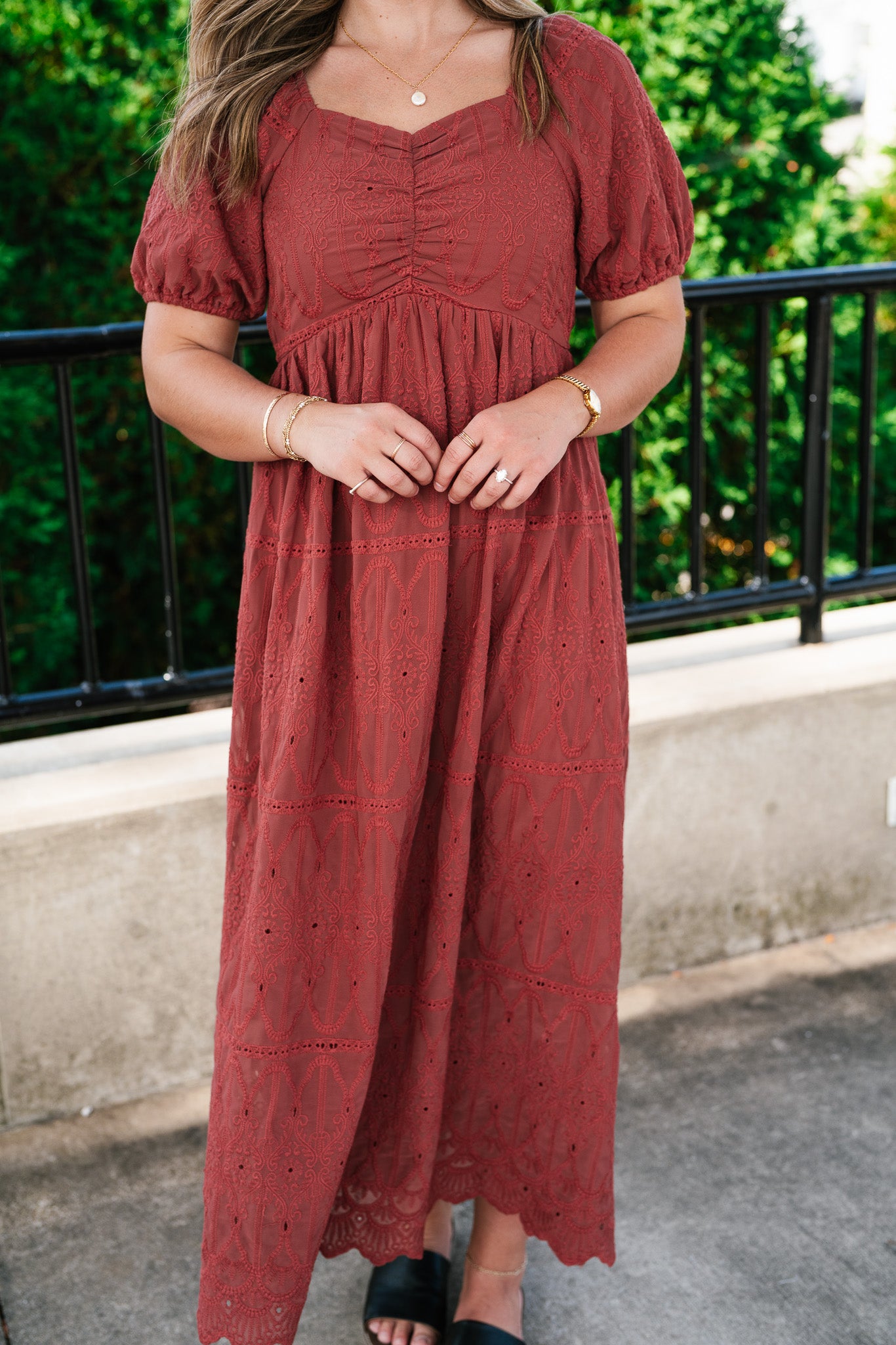 This rich rust-toned beauty is crafted with intricate embroidered detailing that adds depth and texture to its feminine silhouette. The puff sleeves bring a soft, romantic touch, while the square neckline and empire waist create a flattering shape that works for any occasion. Perfect for seasonal gatherings, date nights, or casual afternoons, this dress is a statement piece that blends comfort with sophistication.