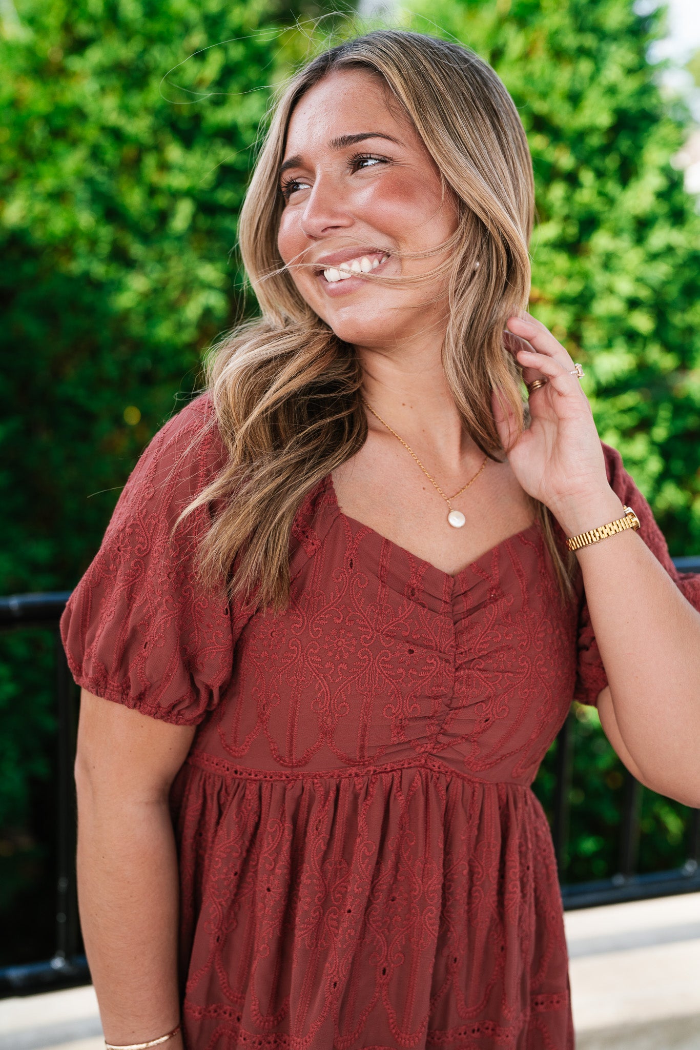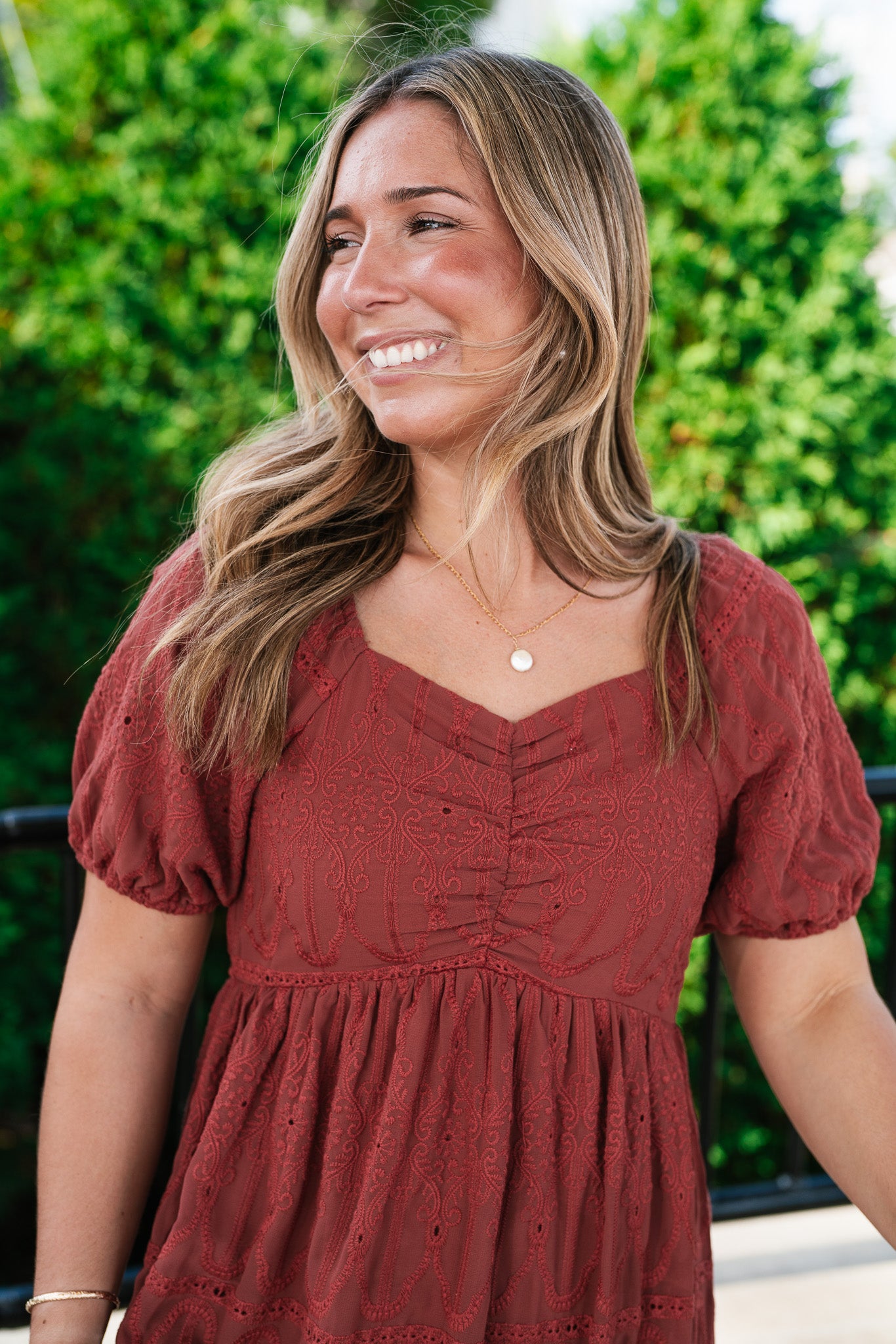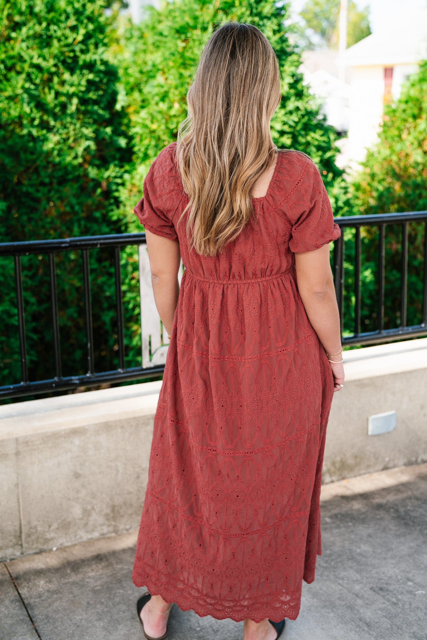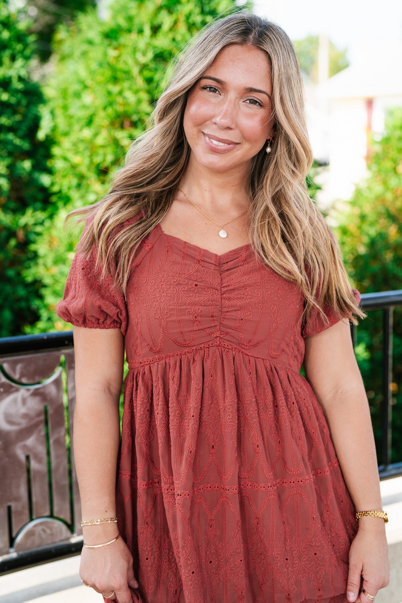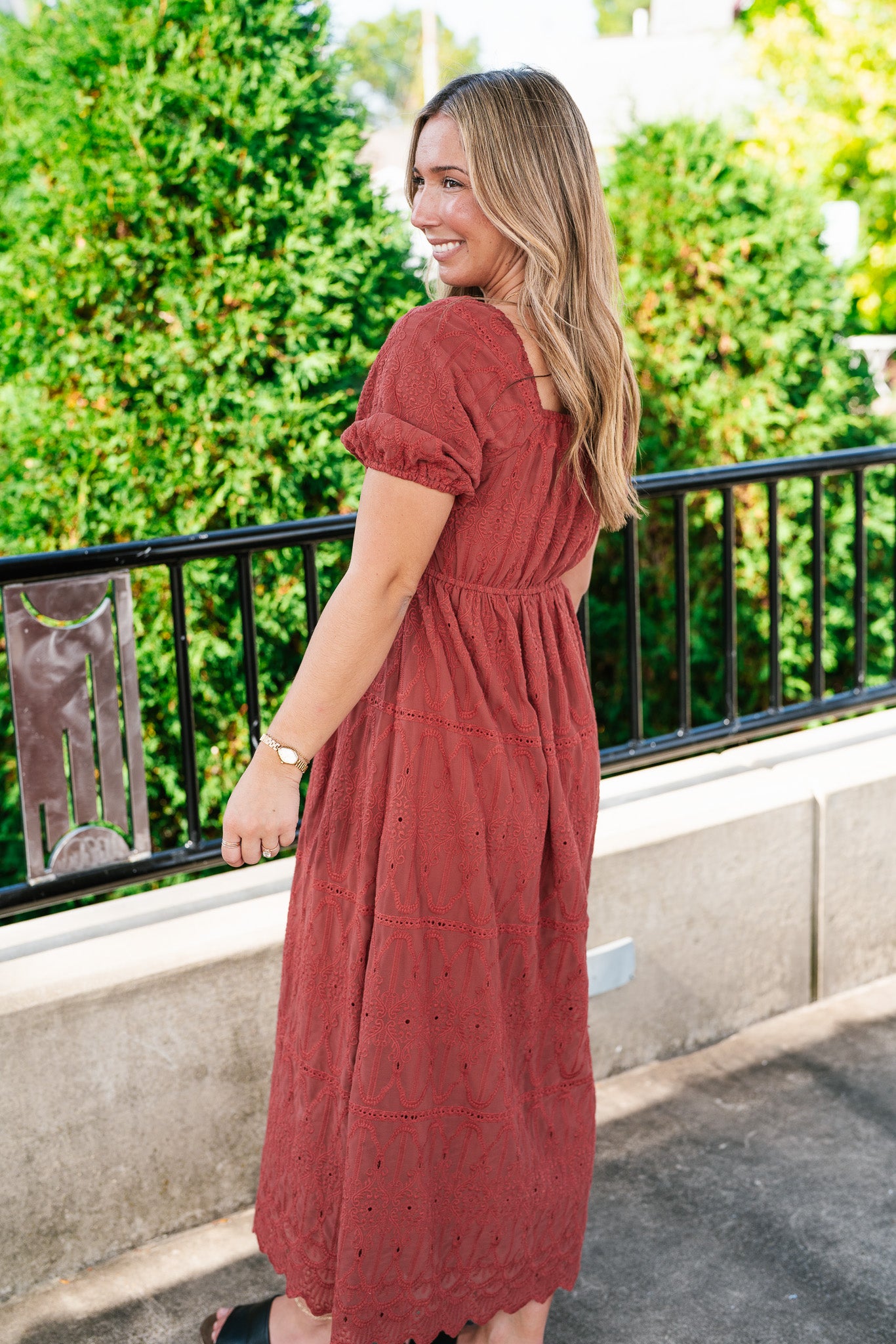 This rich rust-toned beauty is crafted with intricate embroidered detailing that adds depth and texture to its feminine silhouette. The puff sleeves bring a soft, romantic touch, while the square neckline and empire waist create a flattering shape that works for any occasion. Perfect for seasonal gatherings, date nights, or casual afternoons, this dress is a statement piece that blends comfort with sophistication.