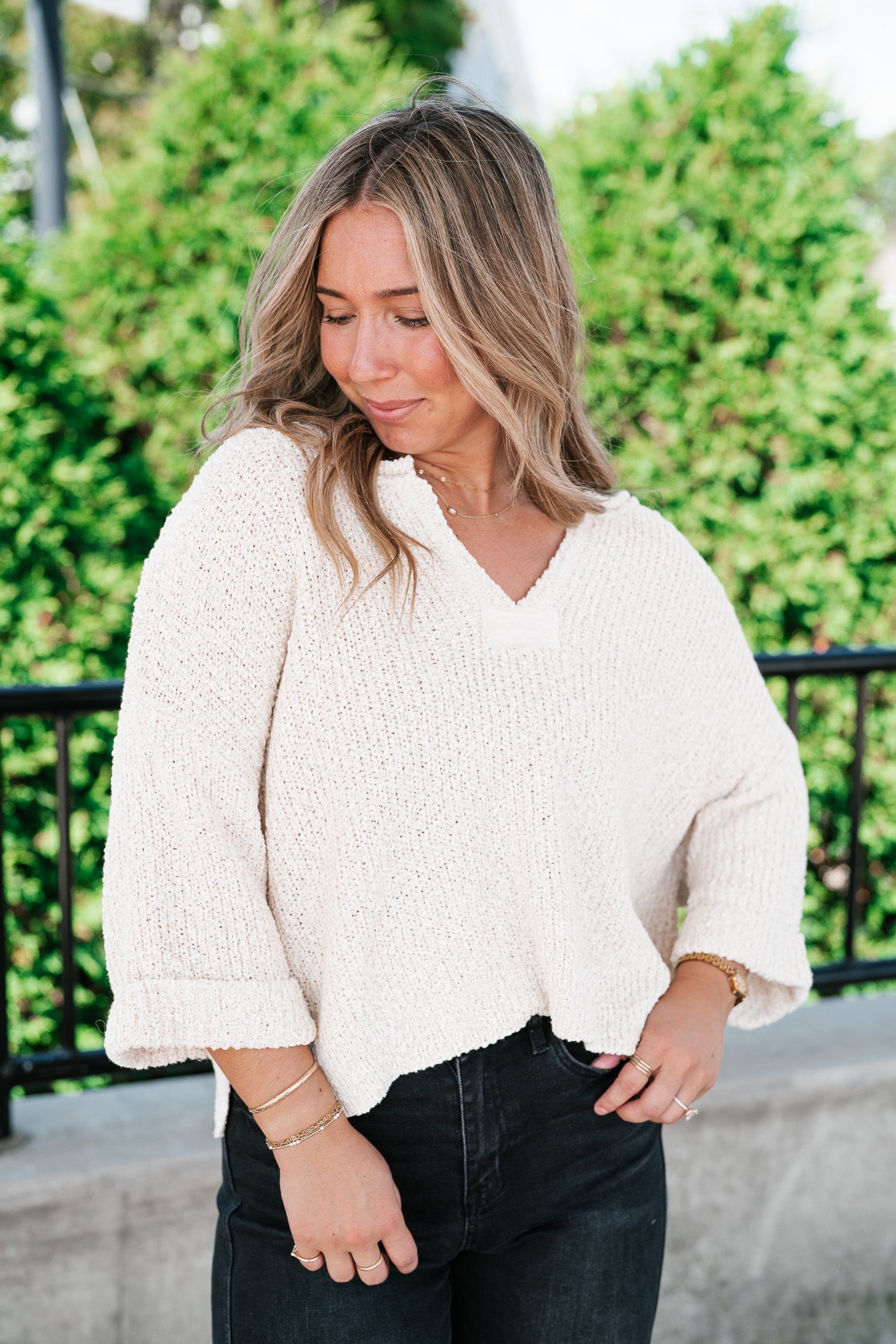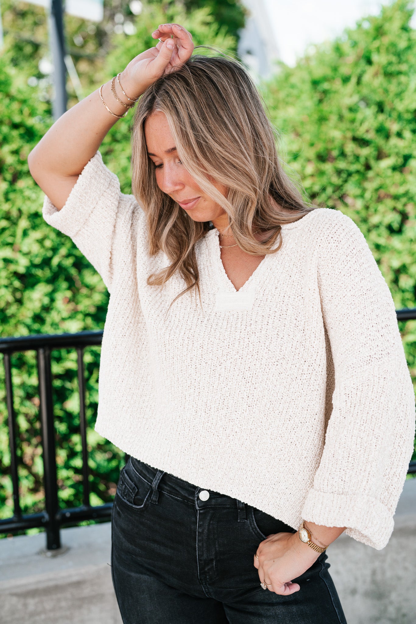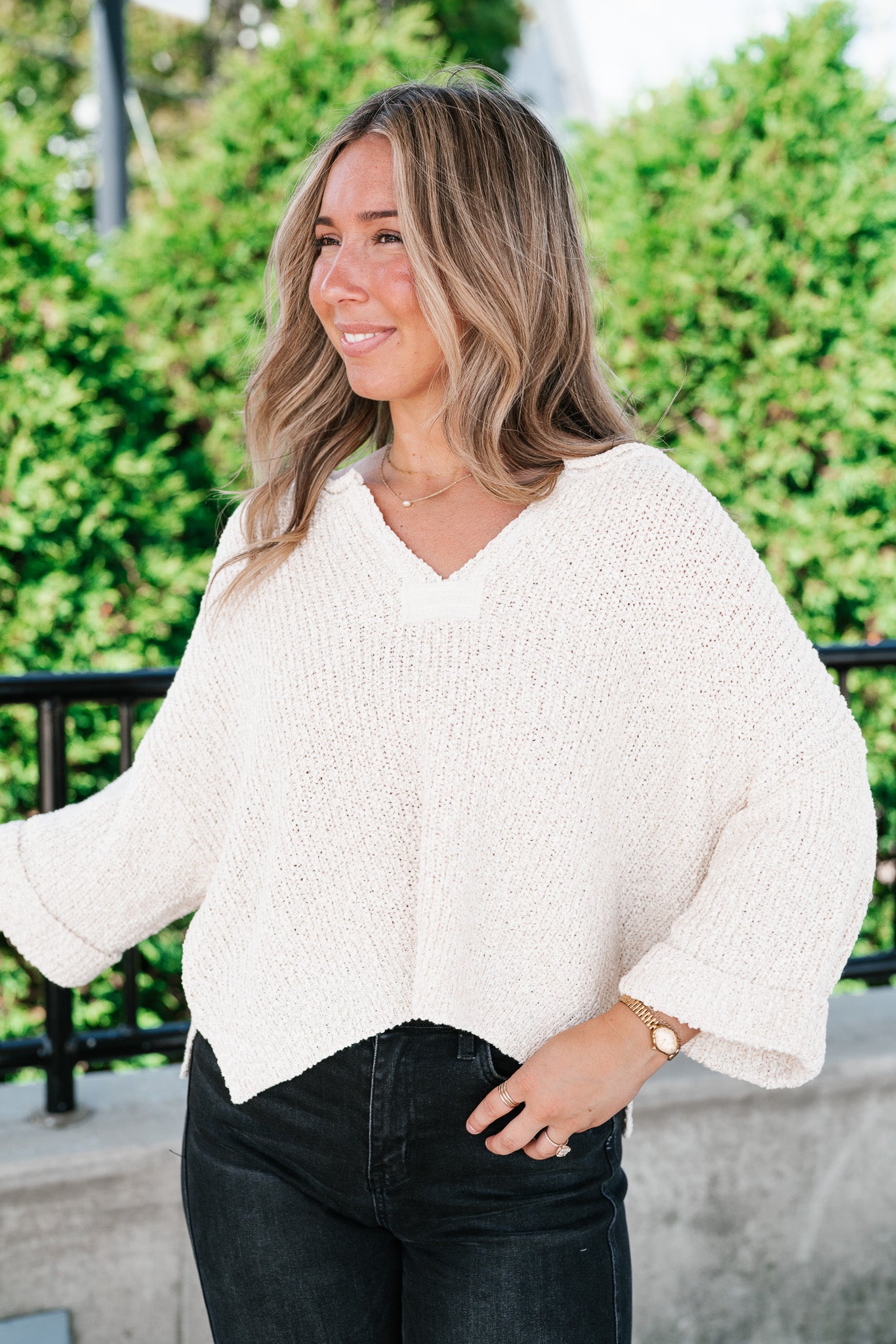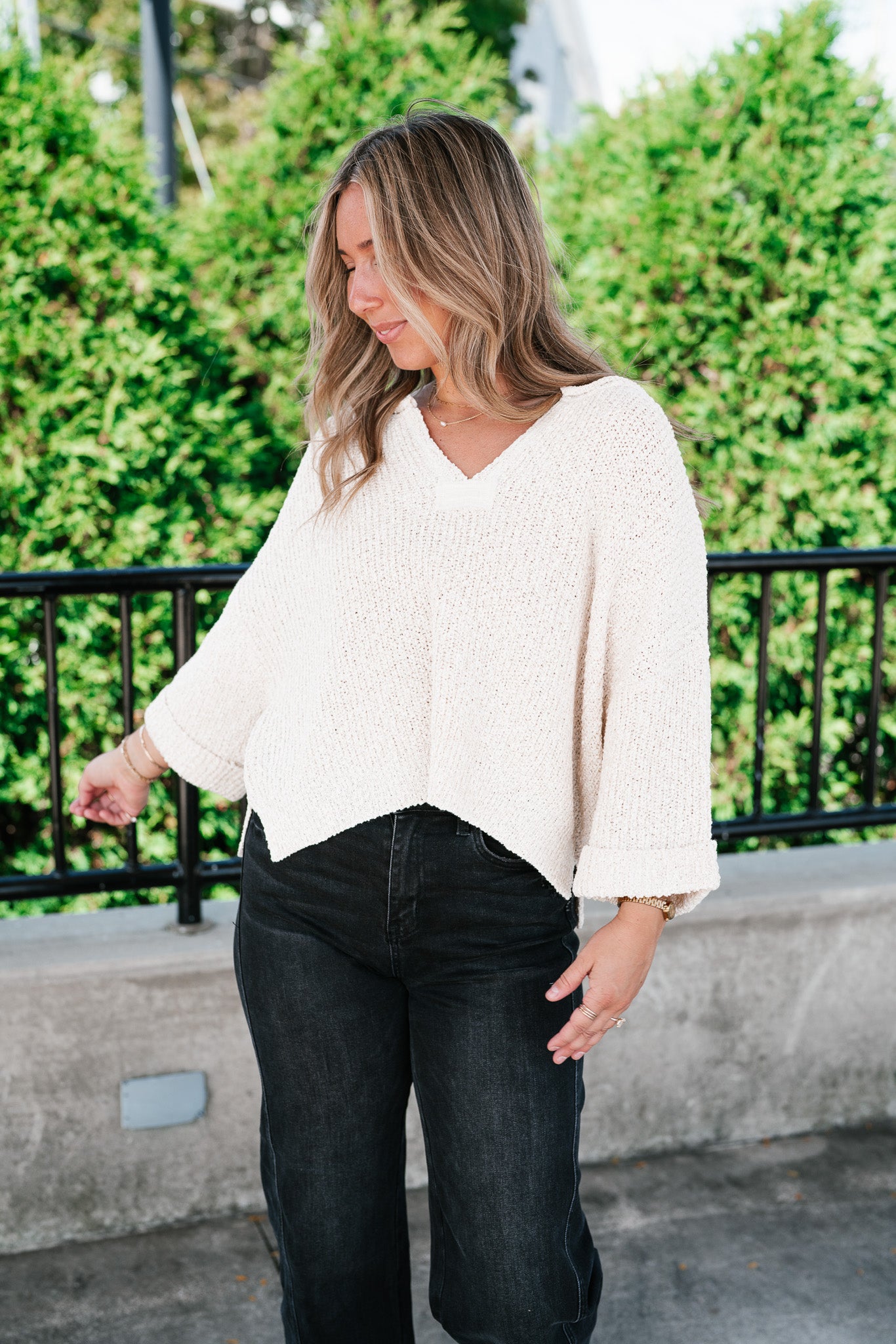 Featuring a soft cream knit, this sweater is designed with a relaxed silhouette, a notched neckline, and wide cuffed quarter sleeves for a touch of effortless charm. Its textured knit gives it dimension, while the slightly cropped hemline makes it perfect for pairing with denim, skirts, or trousers. Whether for crisp fall mornings or layering through cooler days, this piece adds just the right amount of warmth and sophistication.