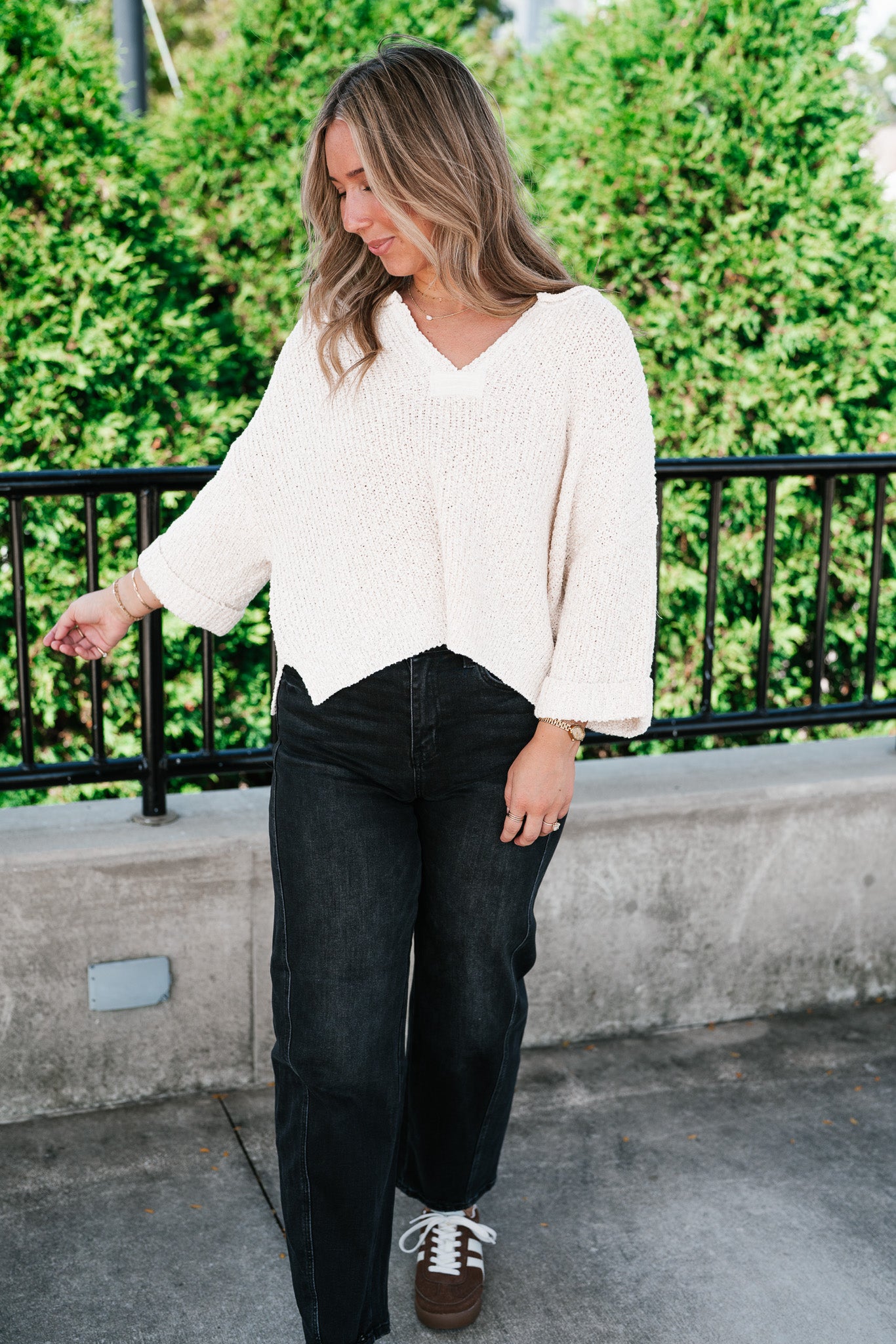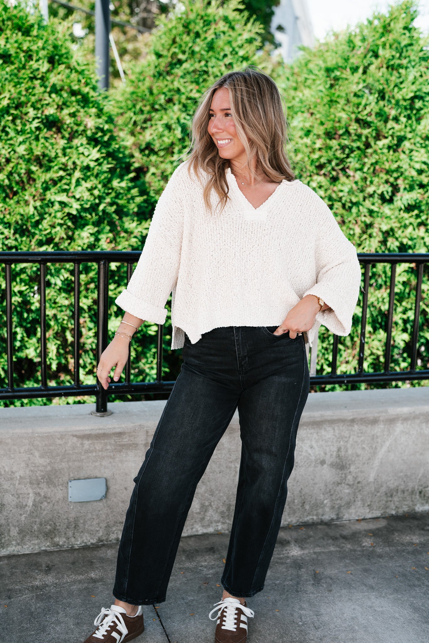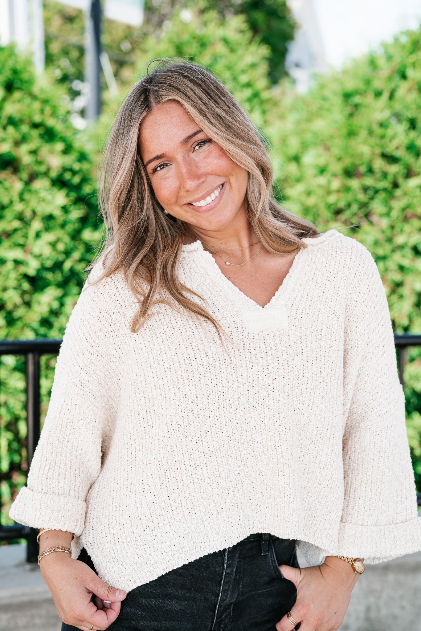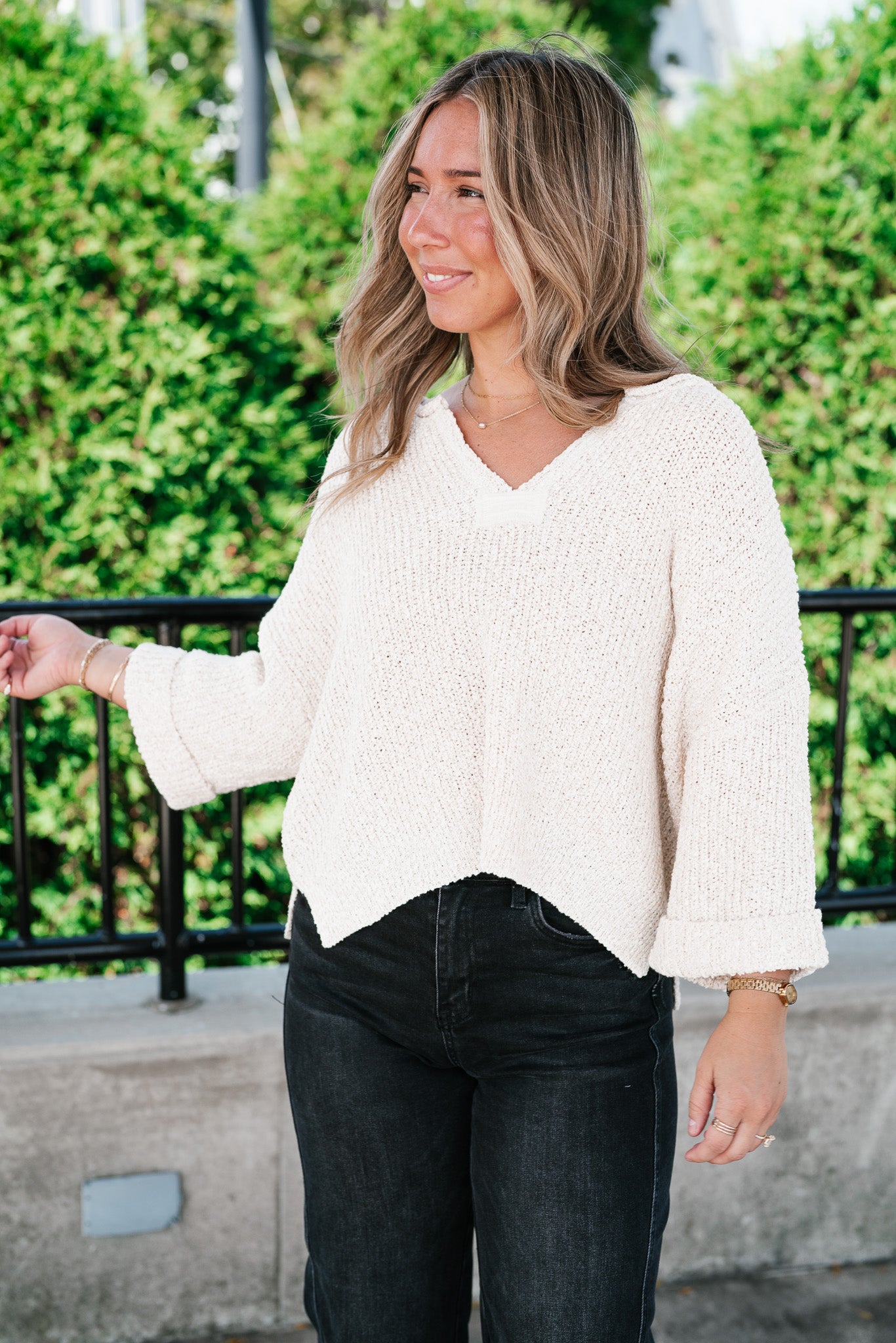Featuring a soft cream knit, this sweater is designed with a relaxed silhouette, a notched neckline, and wide cuffed quarter sleeves for a touch of effortless charm. Its textured knit gives it dimension, while the slightly cropped hemline makes it perfect for pairing with denim, skirts, or trousers. Whether for crisp fall mornings or layering through cooler days, this piece adds just the right amount of warmth and sophistication.