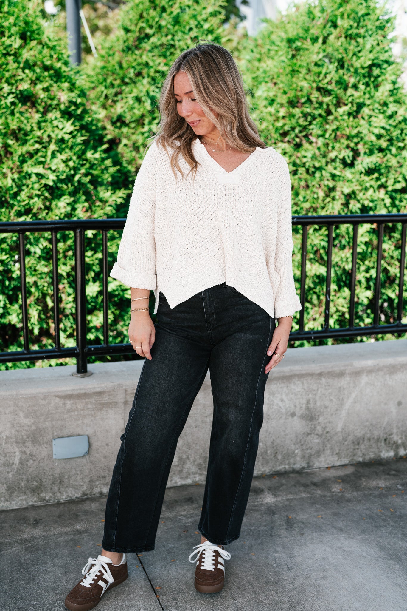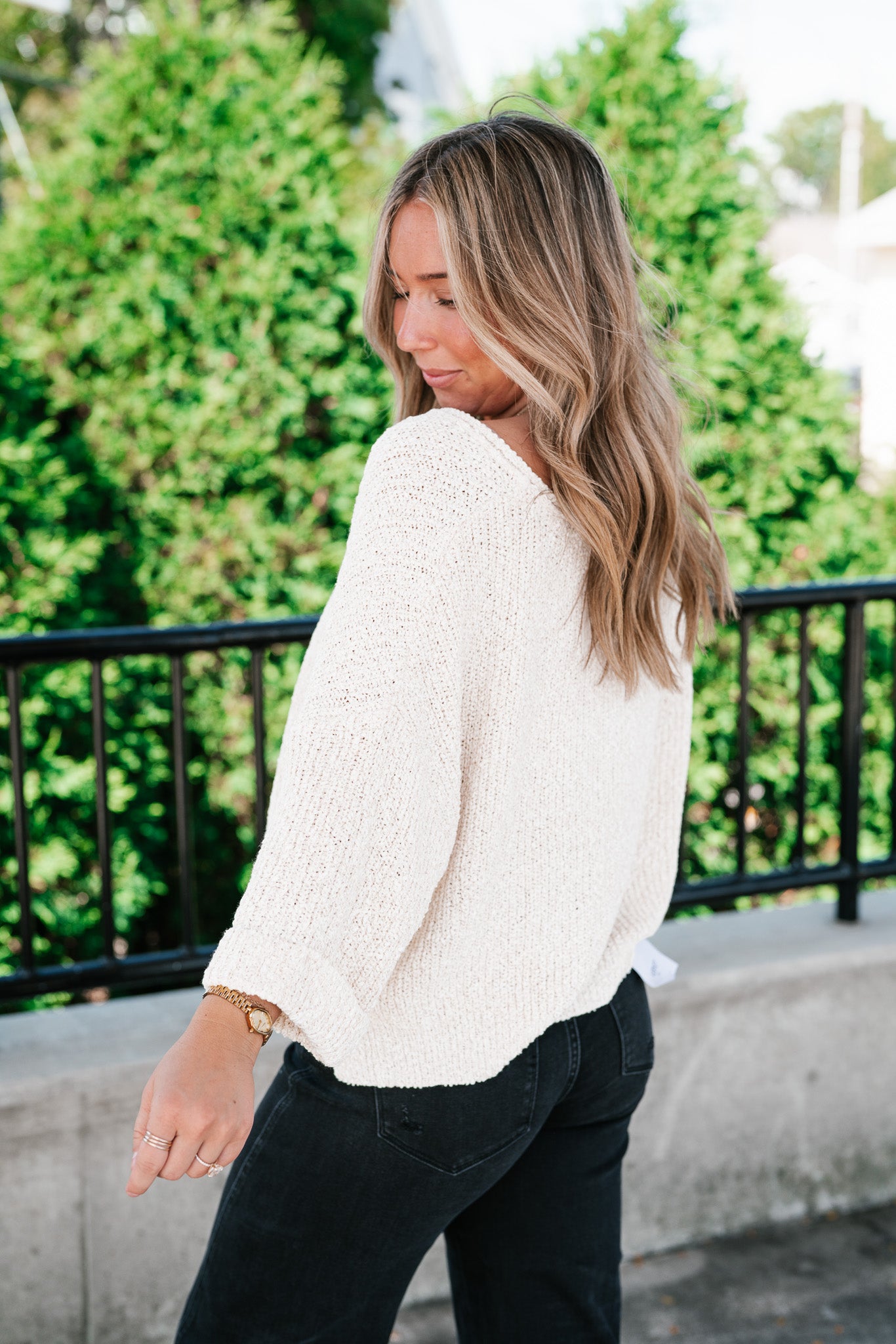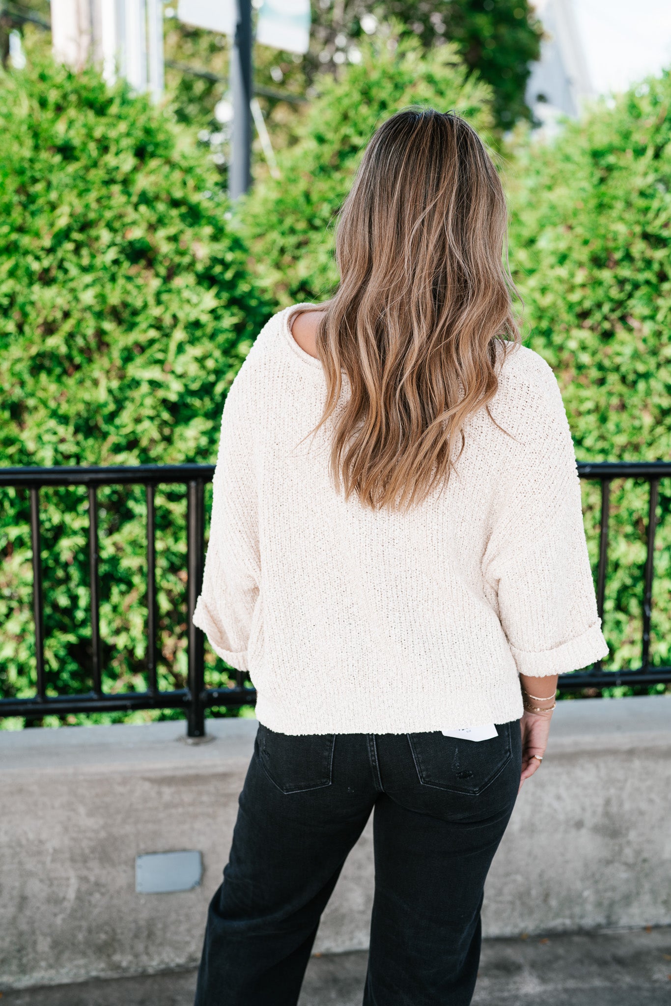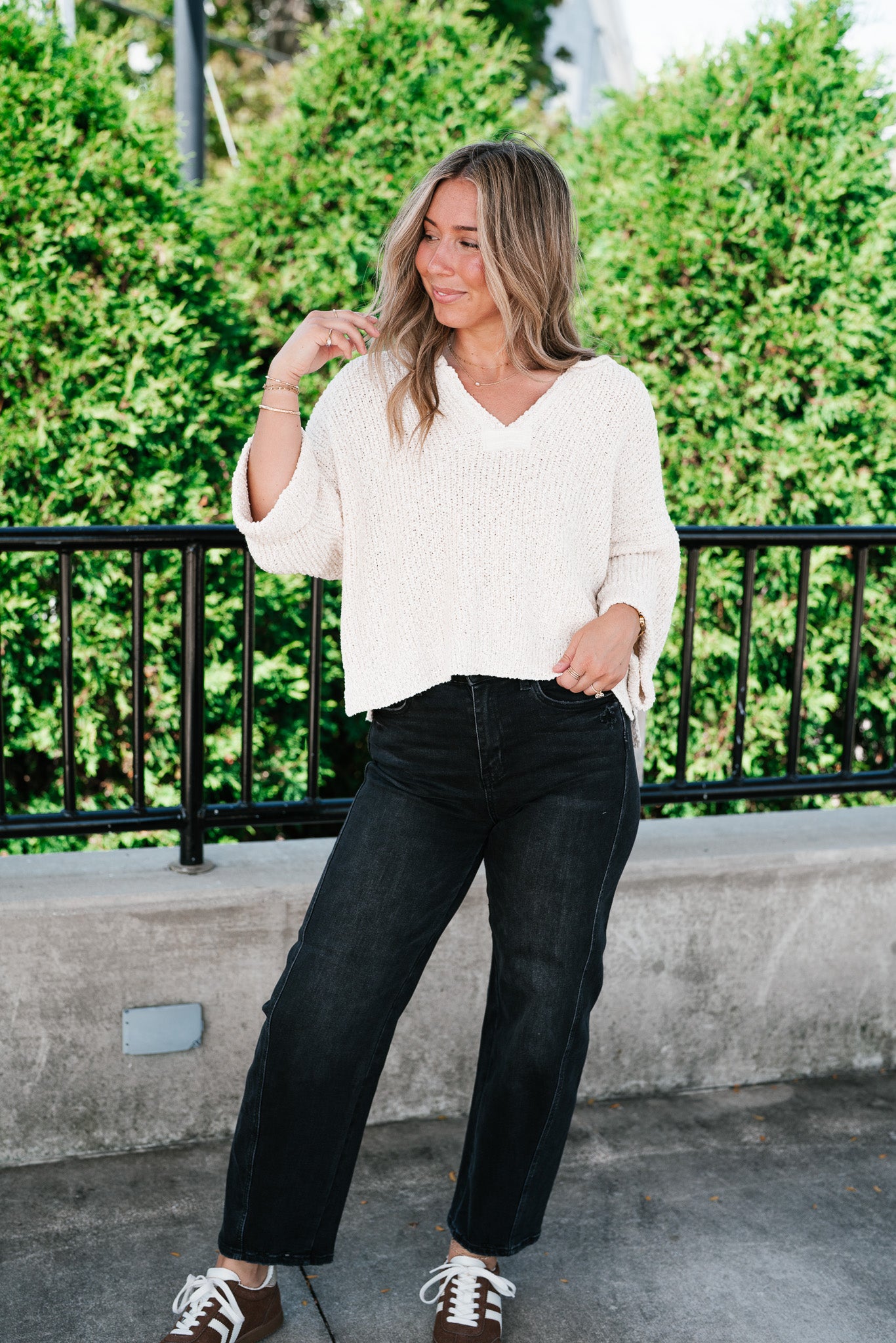 Featuring a soft cream knit, this sweater is designed with a relaxed silhouette, a notched neckline, and wide cuffed quarter sleeves for a touch of effortless charm. Its textured knit gives it dimension, while the slightly cropped hemline makes it perfect for pairing with denim, skirts, or trousers. Whether for crisp fall mornings or layering through cooler days, this piece adds just the right amount of warmth and sophistication.