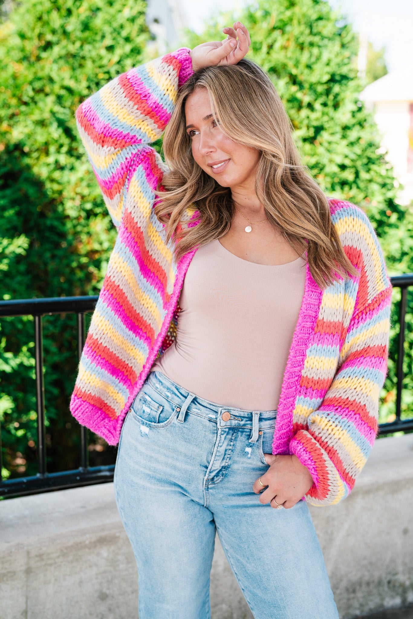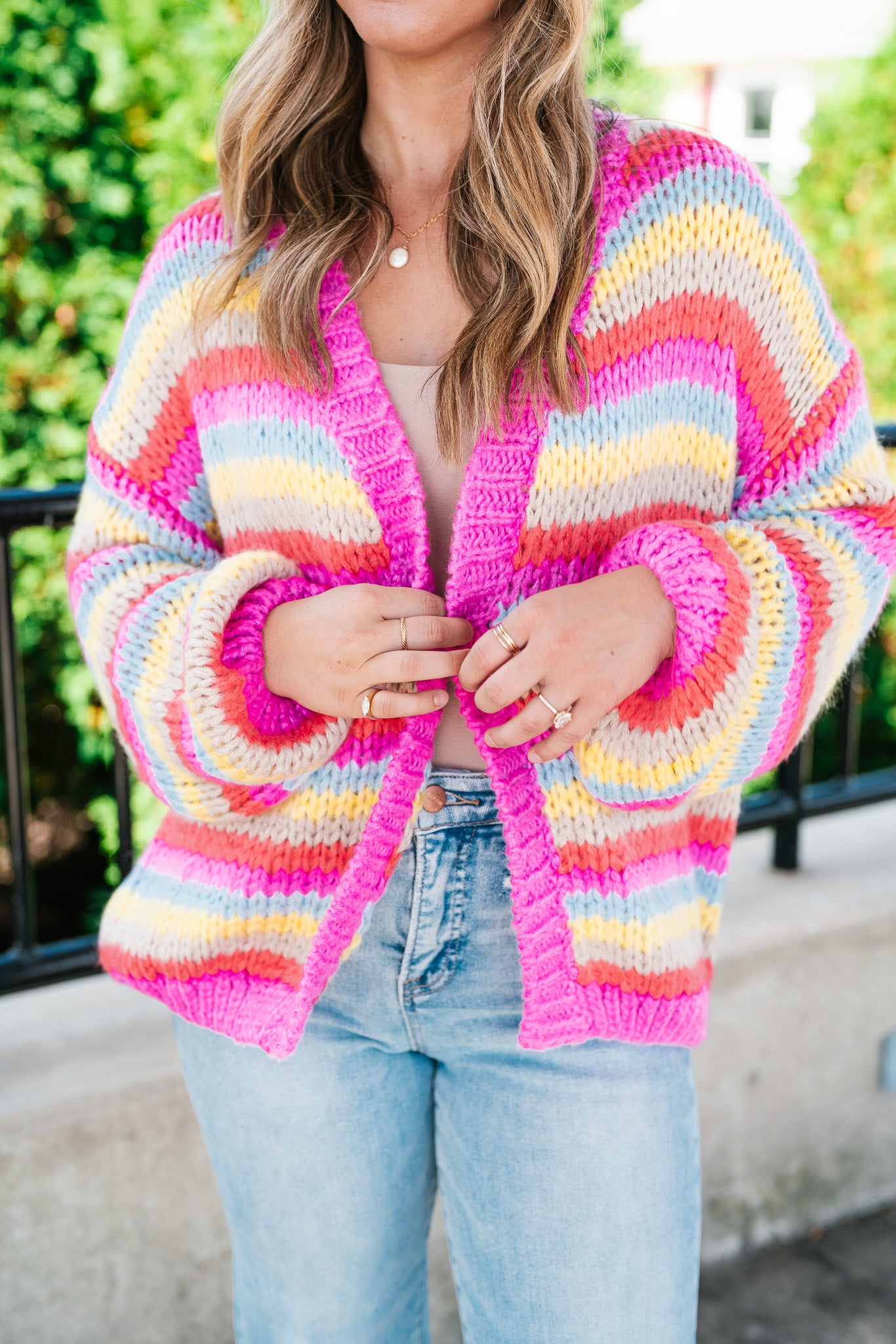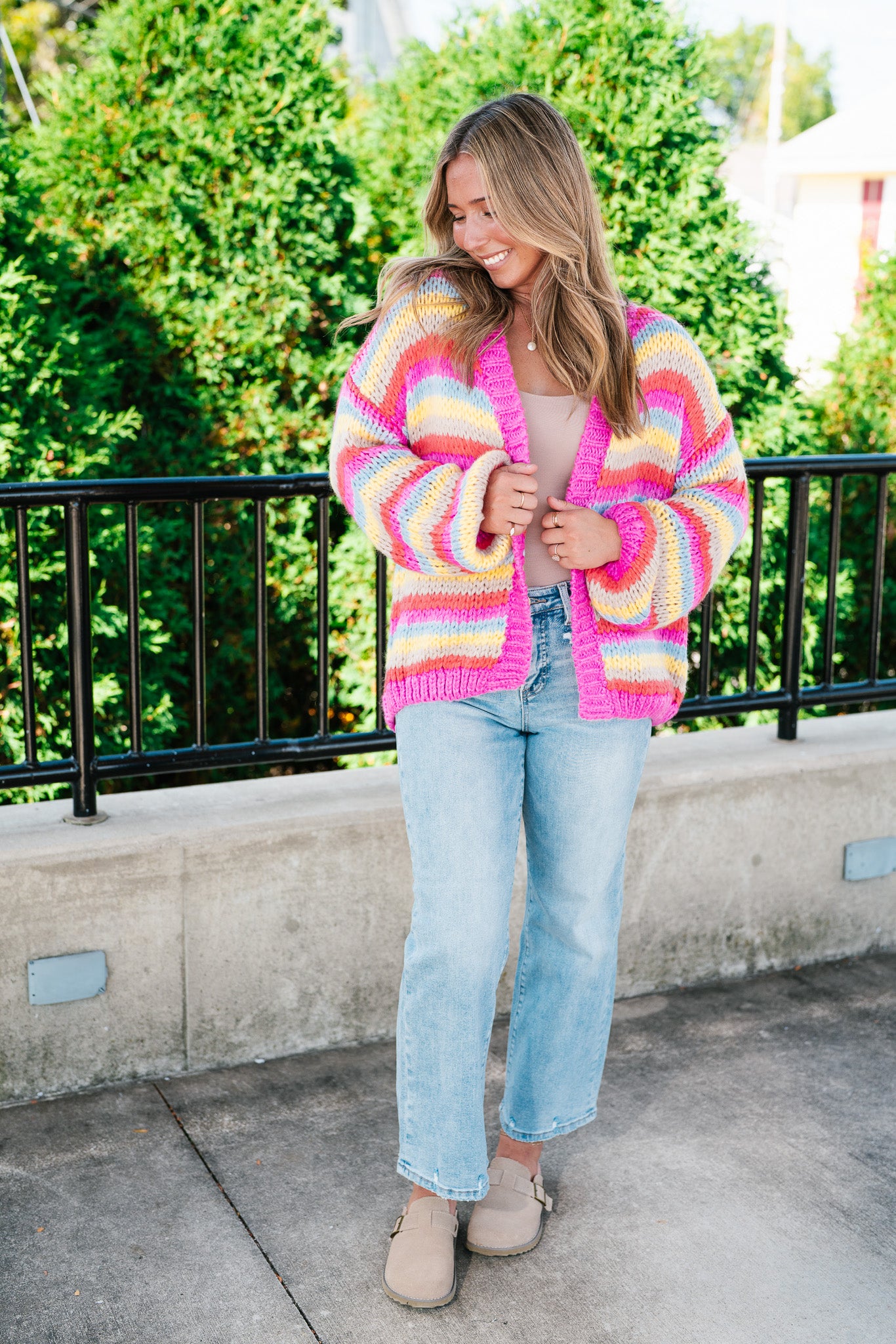 Featuring bold rainbow-inspired stripes in vibrant hues, this open-knit cardigan is playful, cozy, and designed to make a statement. With a relaxed fit and soft texture, it’s perfect for layering over basics to instantly elevate your look.
