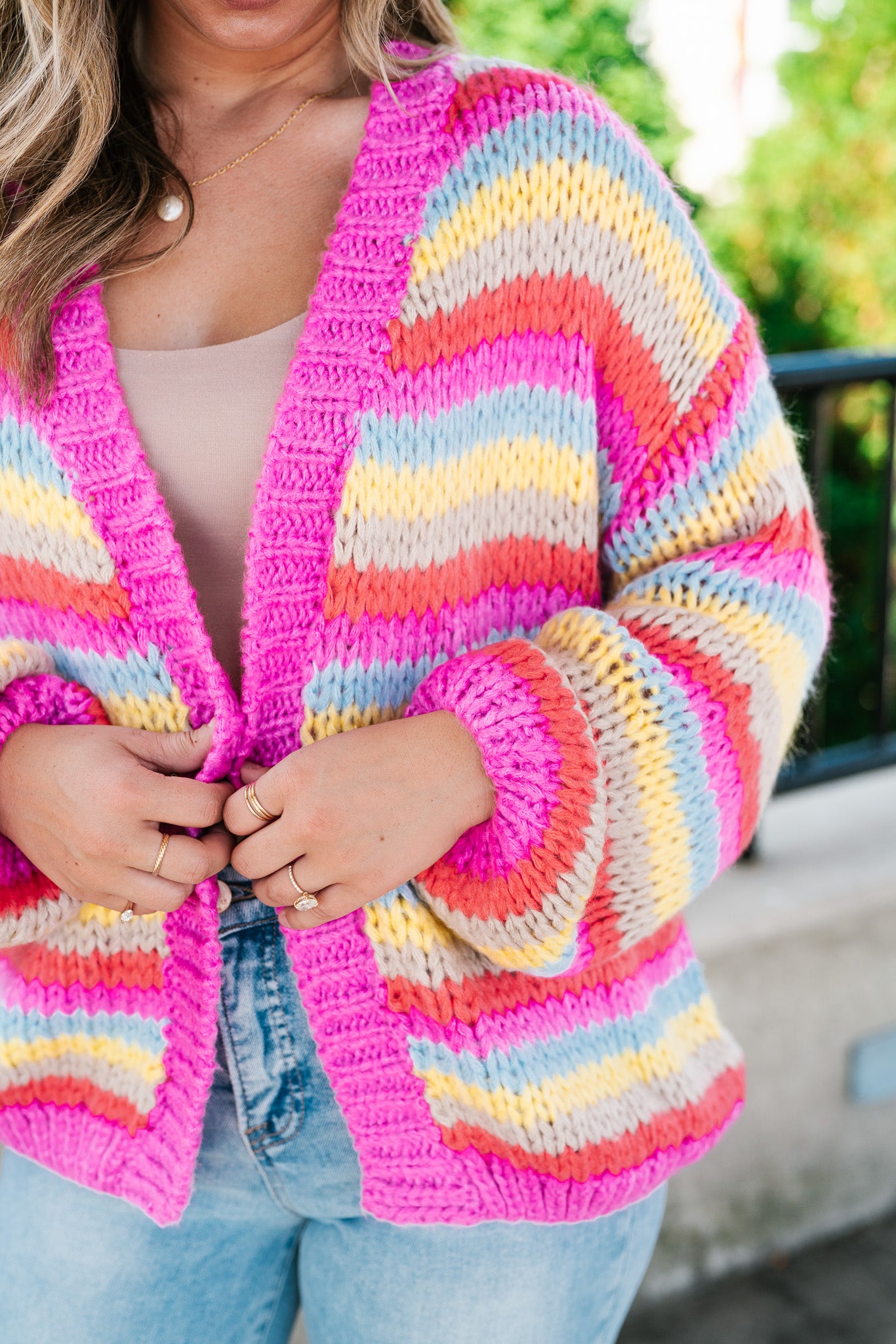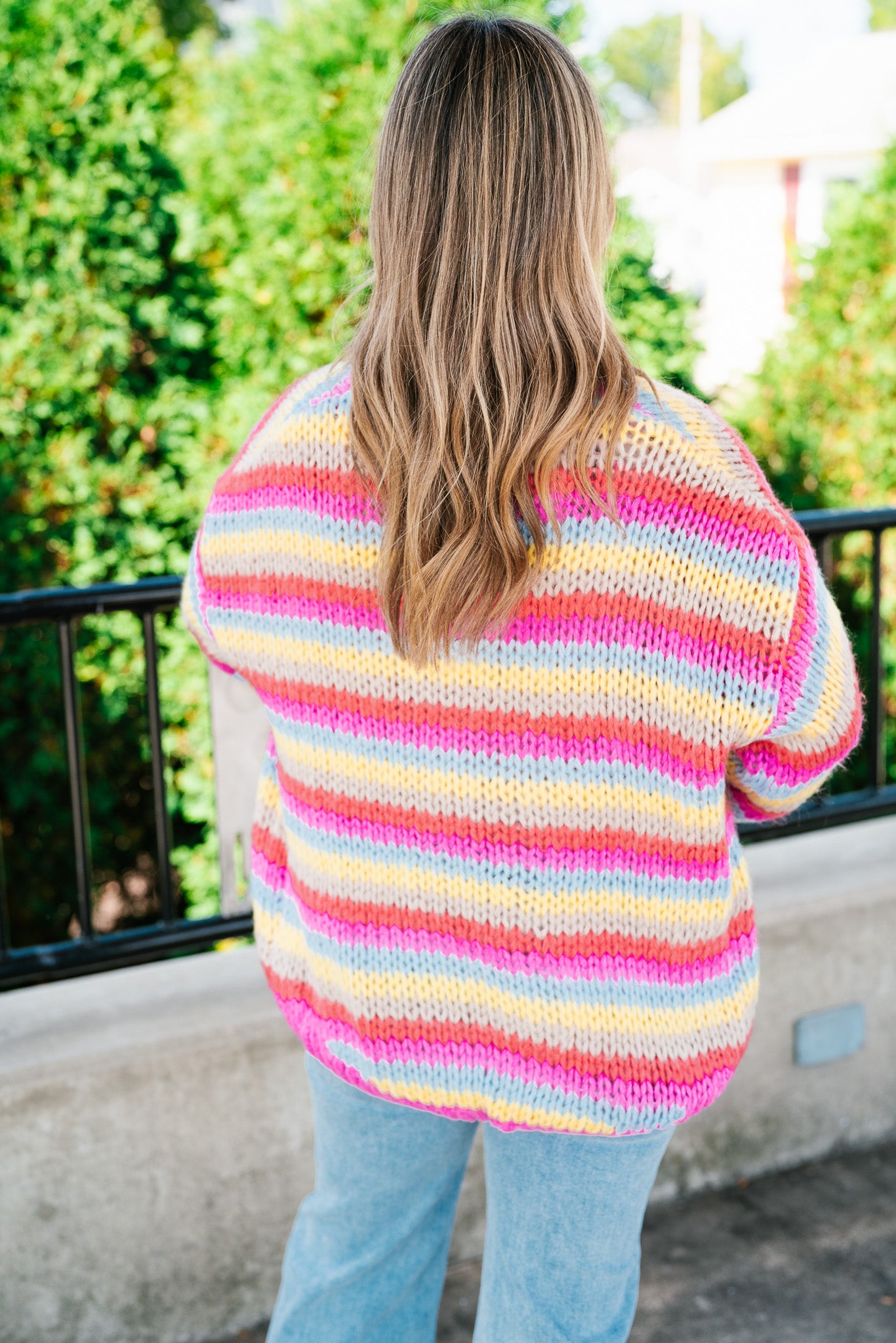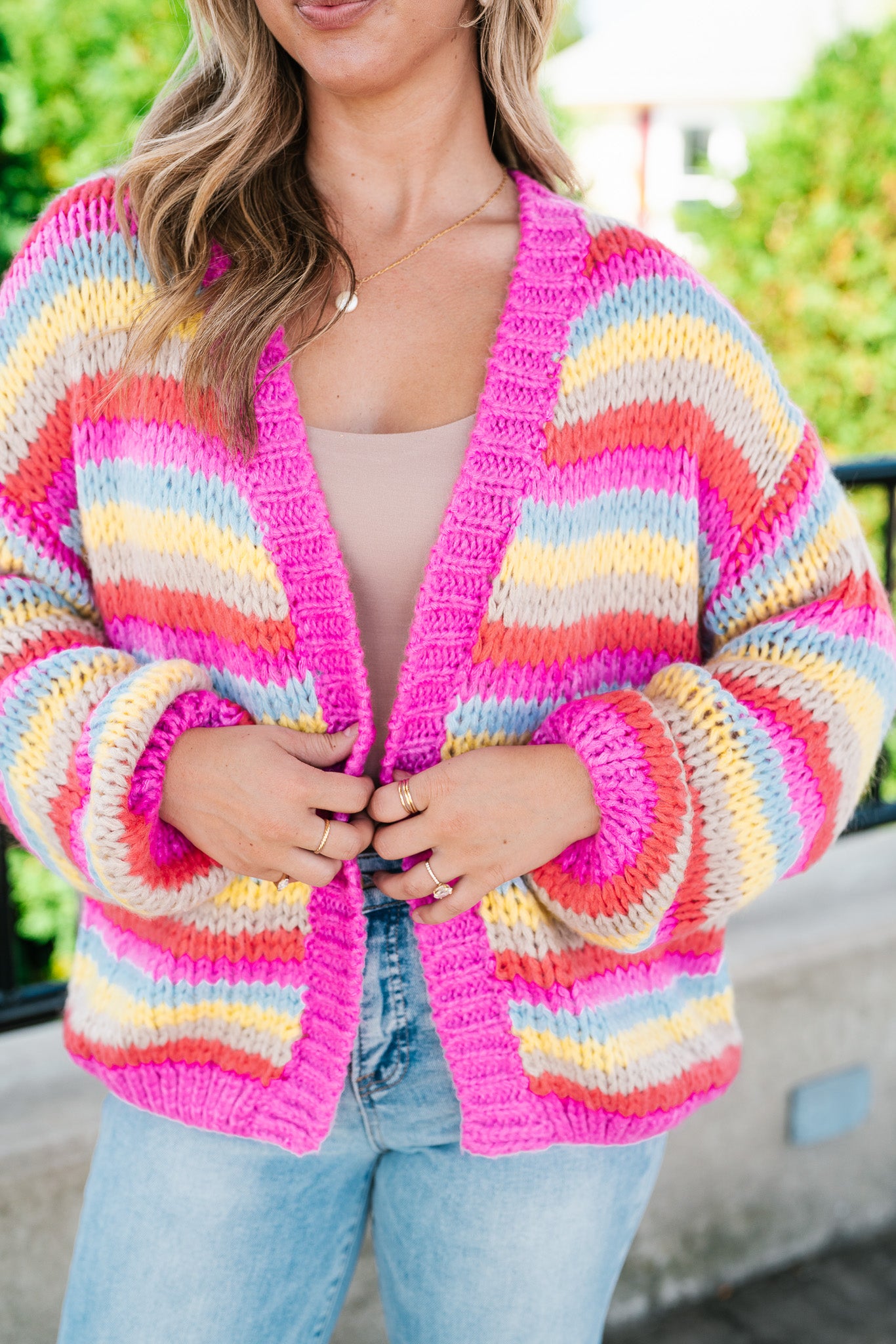 Featuring bold rainbow-inspired stripes in vibrant hues, this open-knit cardigan is playful, cozy, and designed to make a statement. With a relaxed fit and soft texture, it’s perfect for layering over basics to instantly elevate your look.