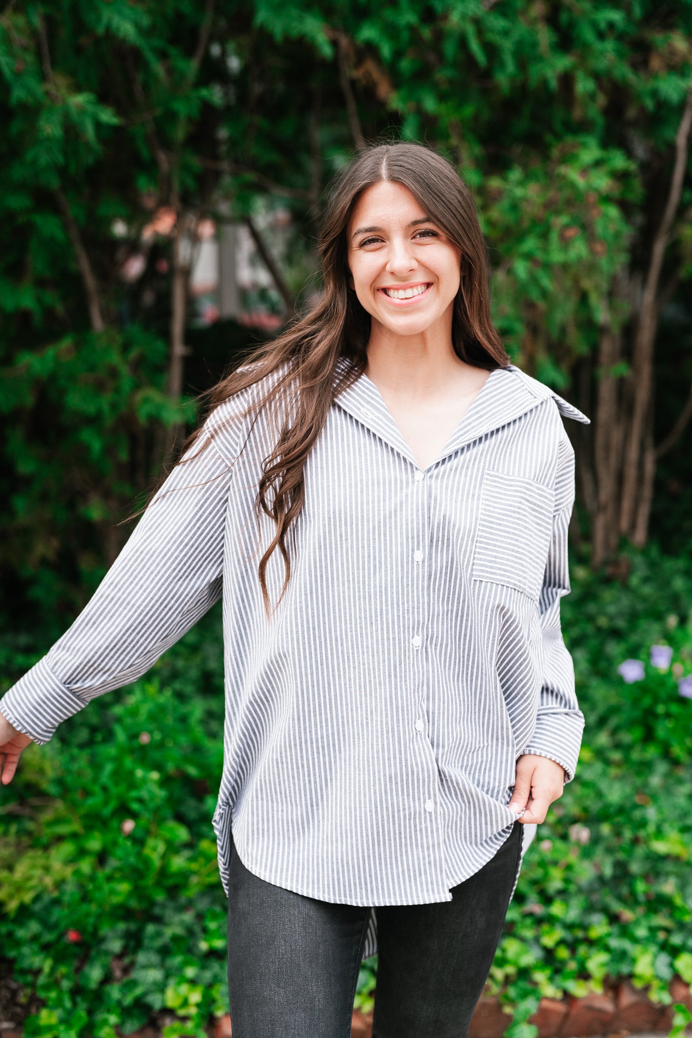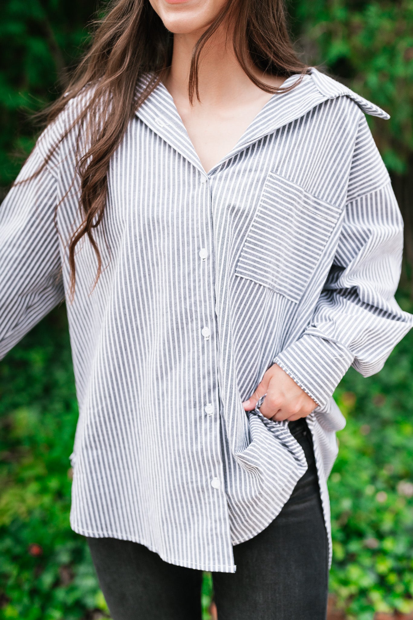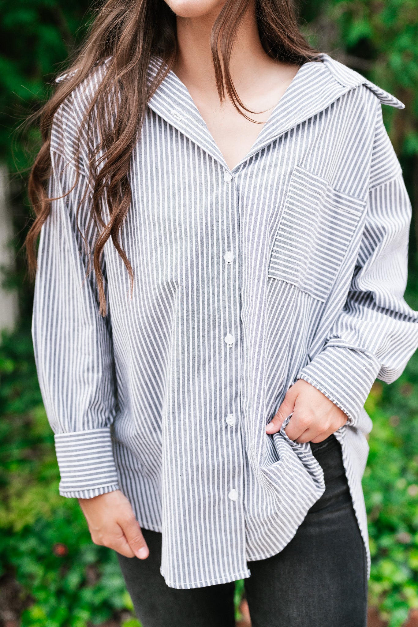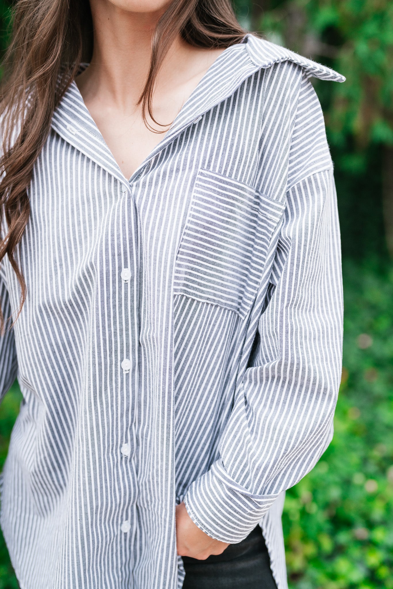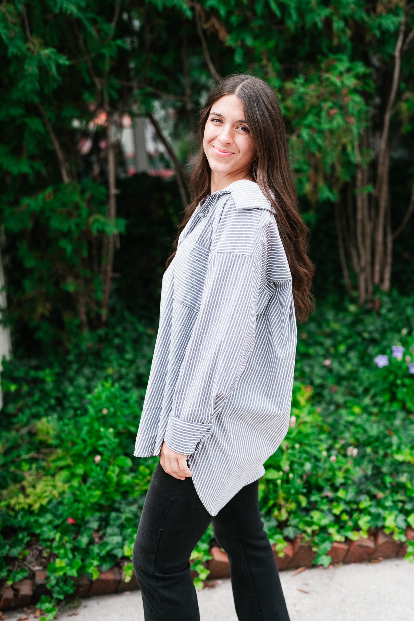 Complete your look with the Coastal Pinstripe Top, designed to match perfectly with our Coastal Pinstripe Bottoms. Featuring the same chic black and white pinstripe pattern, this top offers a polished yet relaxed vibe. With its flattering, slightly boxy silhouette and soft, breathable fabric, it’s the ideal balance of comfort and sophistication. Whether you're dressing it up for work or down for a casual day out, this top is a versatile staple for the modern woman on the go.