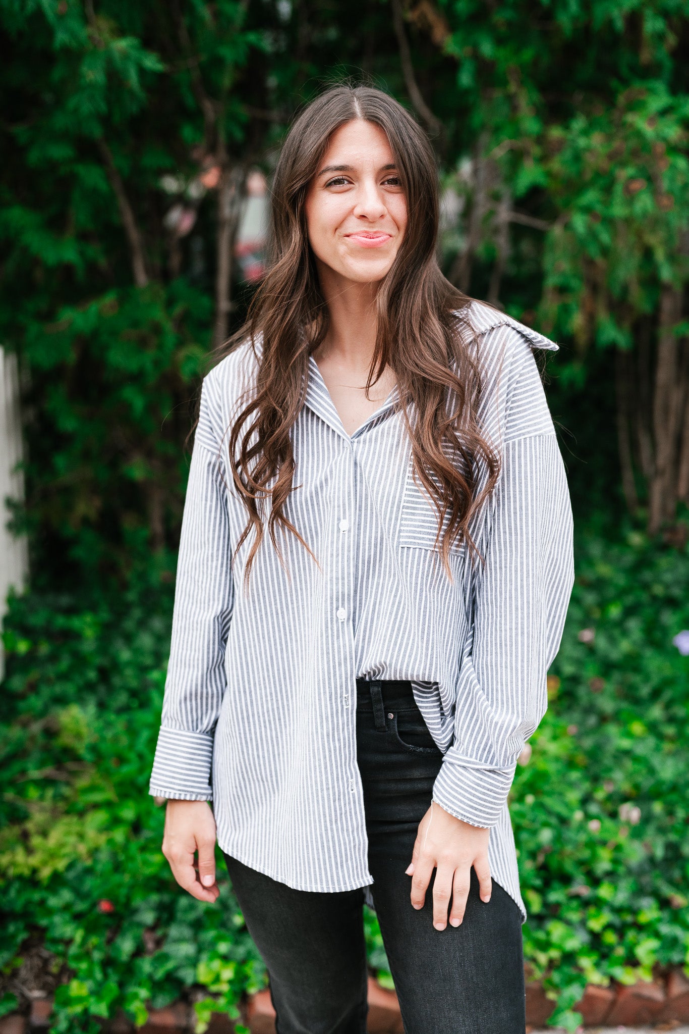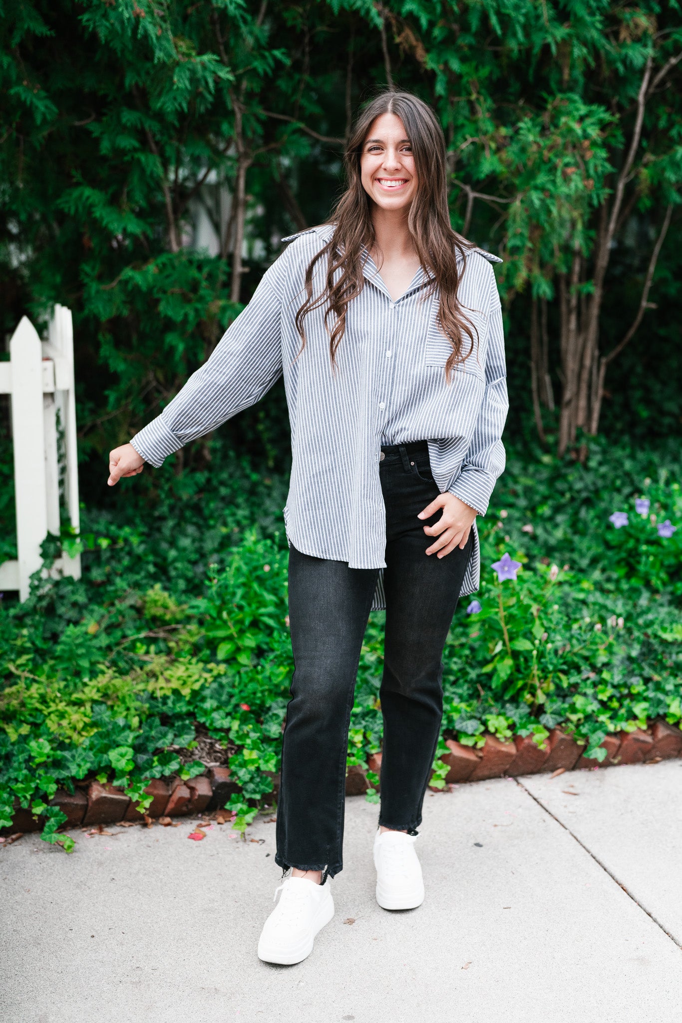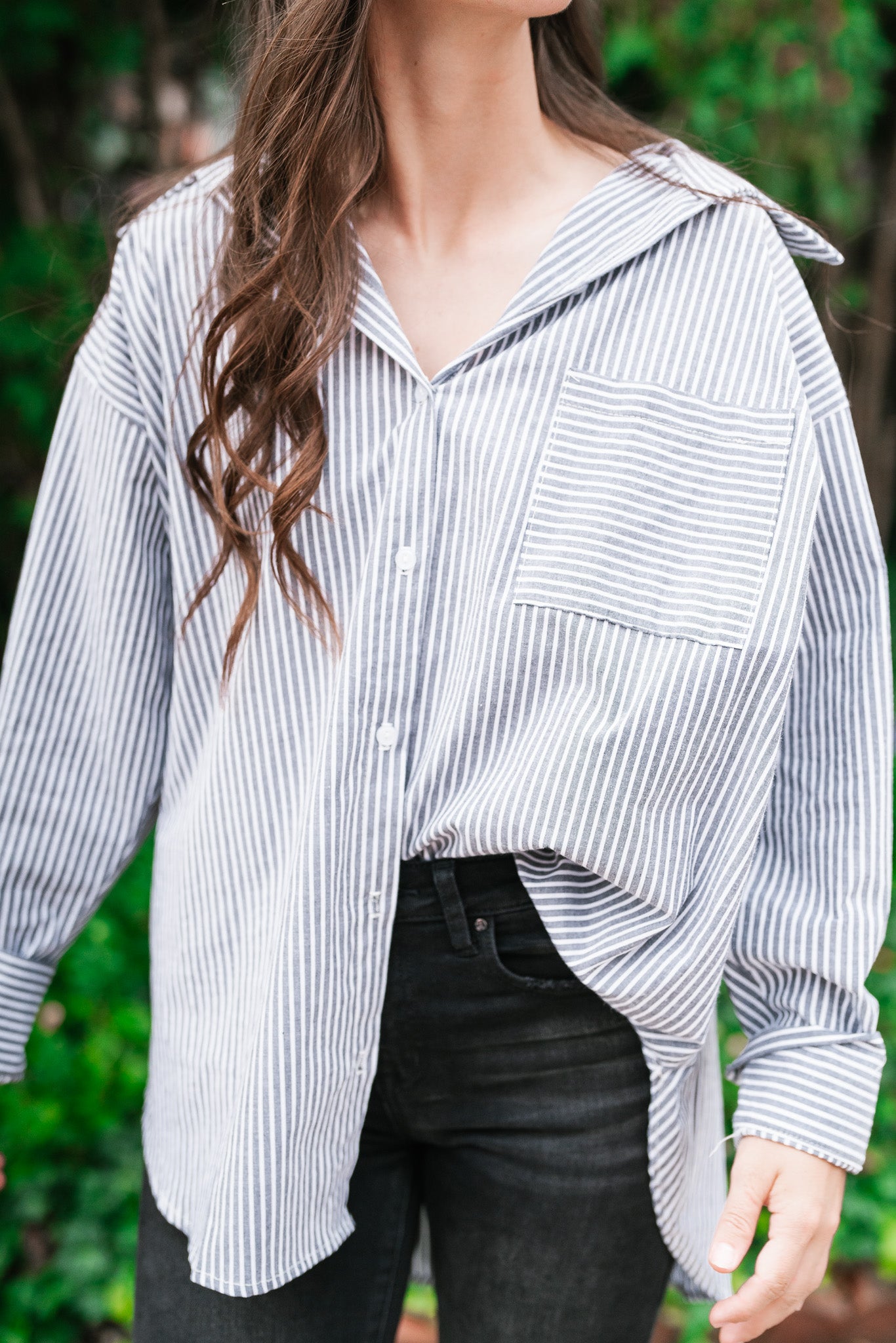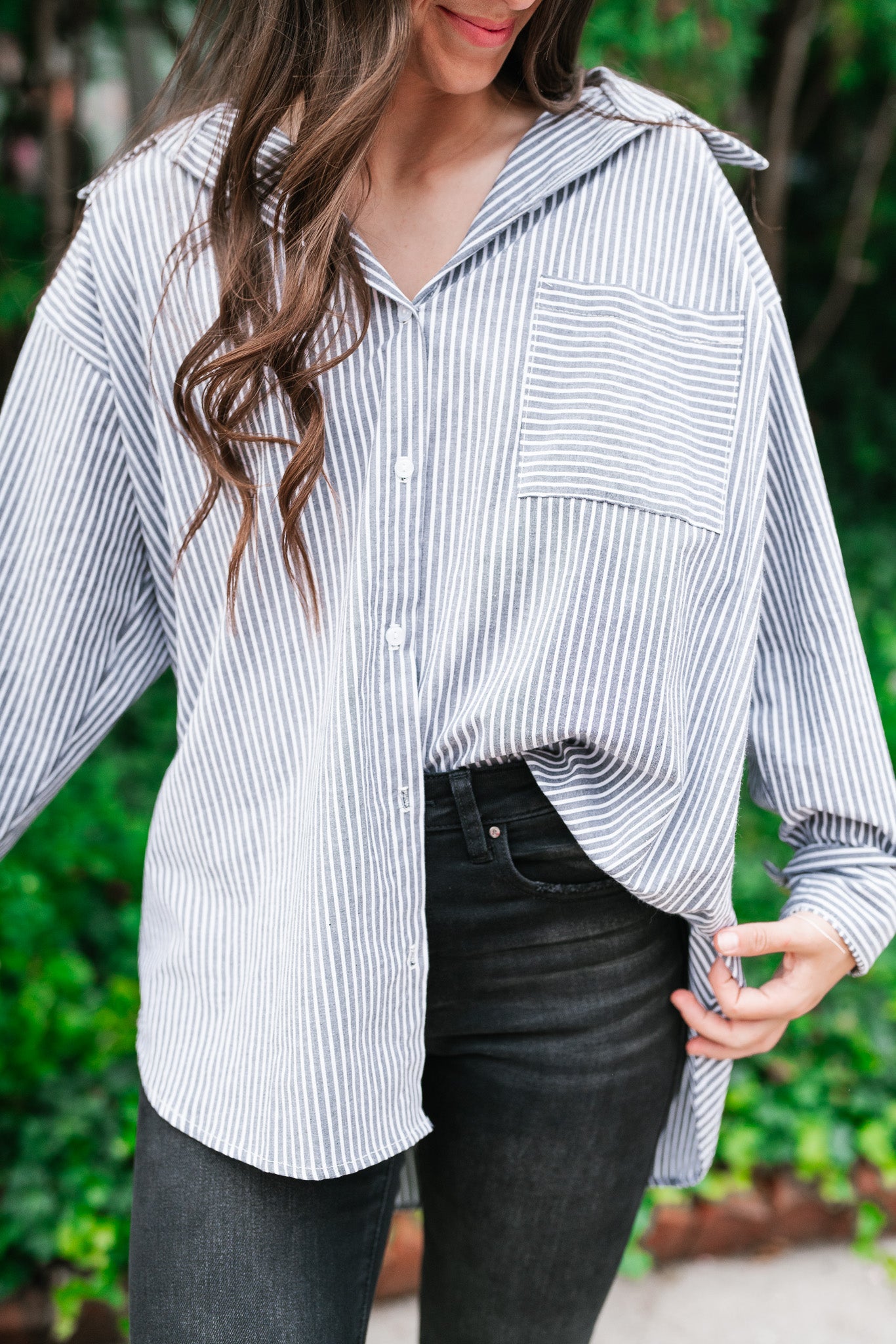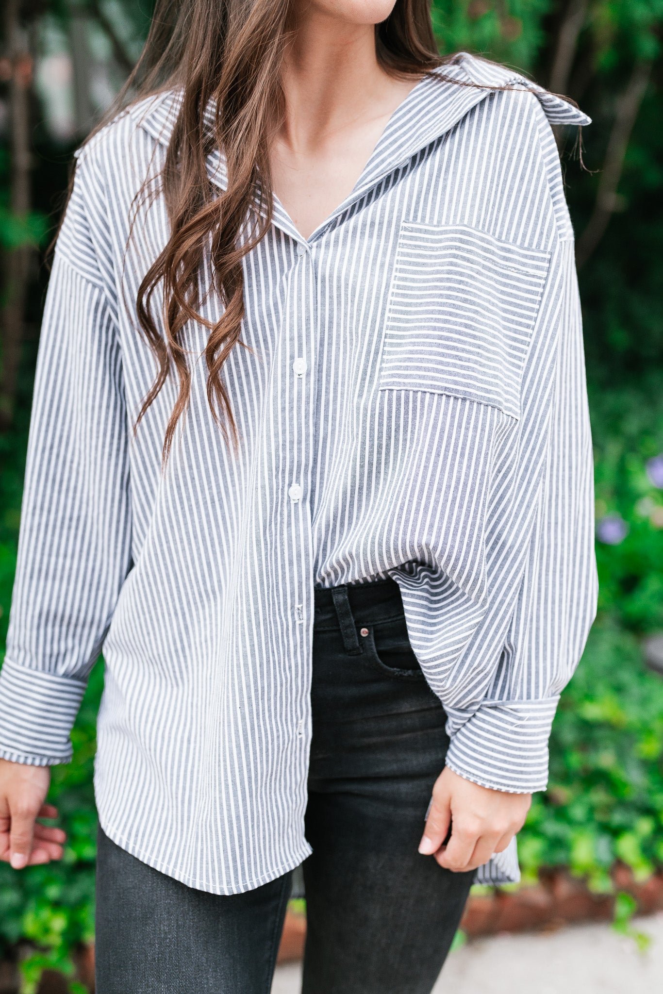 Complete your look with the Coastal Pinstripe Top, designed to match perfectly with our Coastal Pinstripe Bottoms. Featuring the same chic black and white pinstripe pattern, this top offers a polished yet relaxed vibe. With its flattering, slightly boxy silhouette and soft, breathable fabric, it’s the ideal balance of comfort and sophistication. Whether you're dressing it up for work or down for a casual day out, this top is a versatile staple for the modern woman on the go.