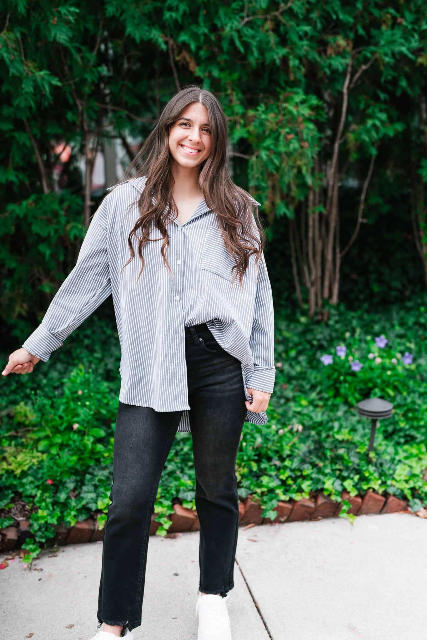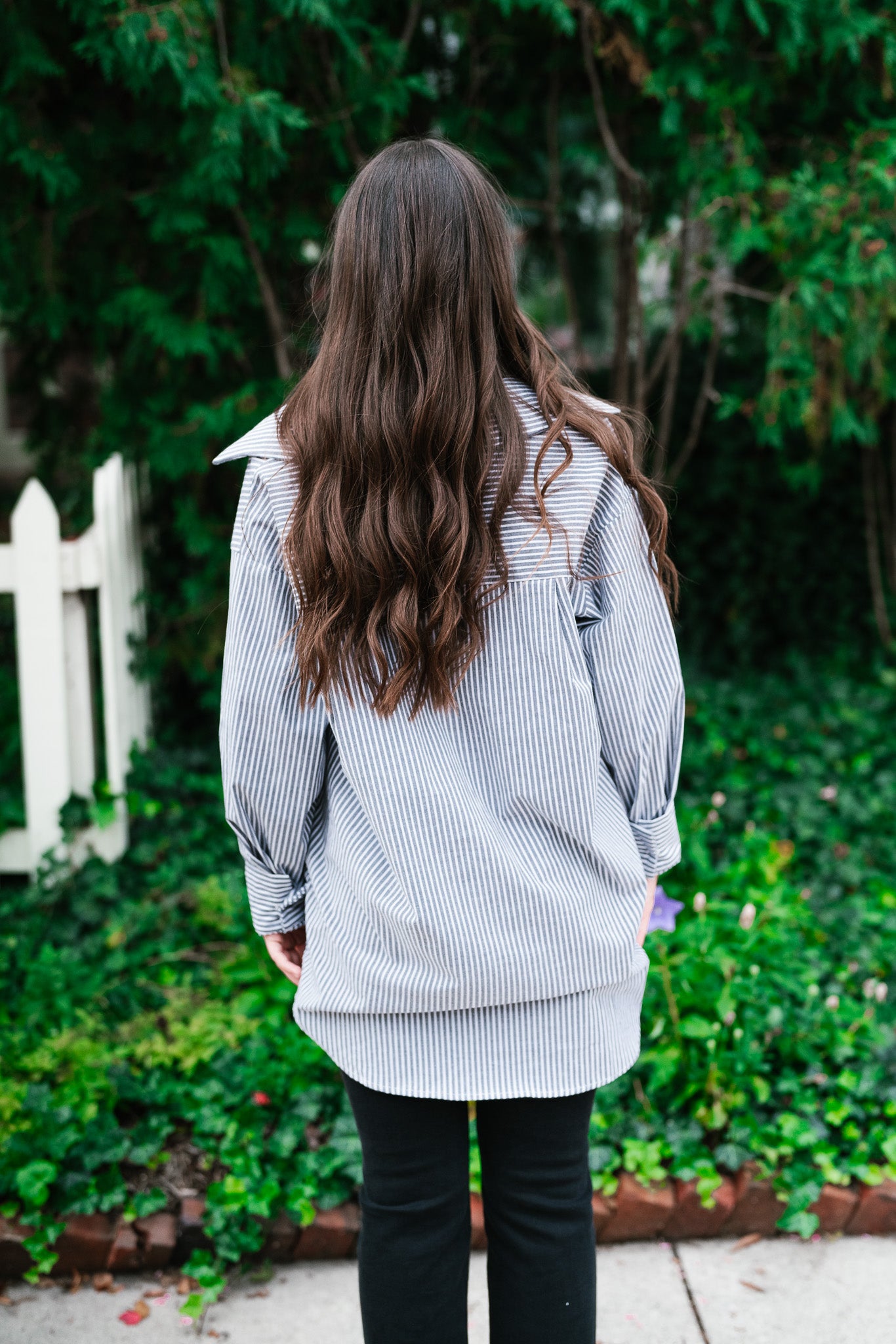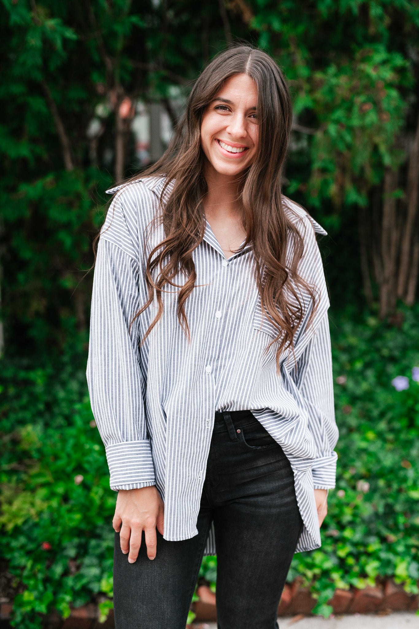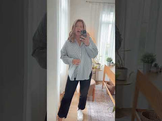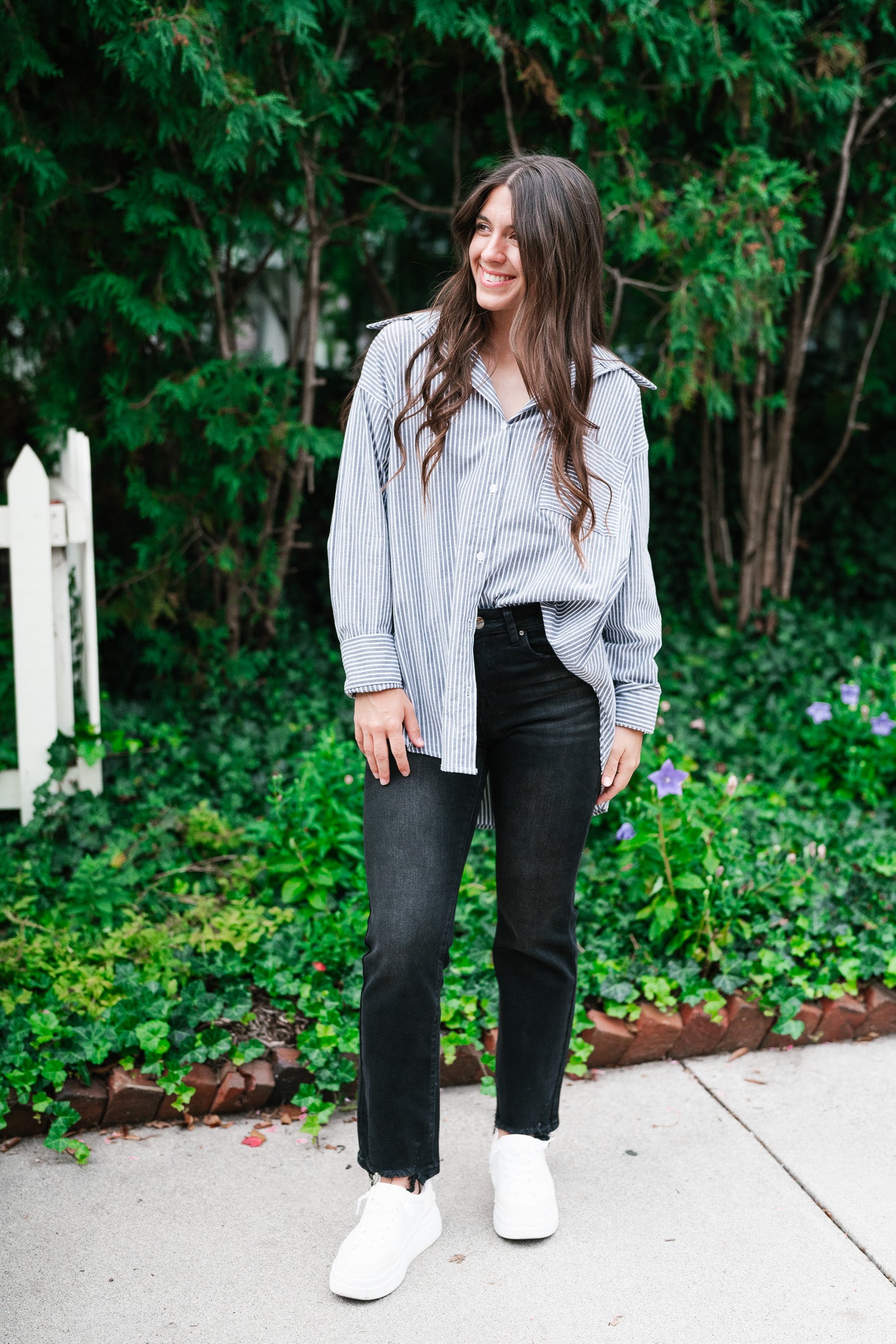 Complete your look with the Coastal Pinstripe Top, designed to match perfectly with our Coastal Pinstripe Bottoms. Featuring the same chic black and white pinstripe pattern, this top offers a polished yet relaxed vibe. With its flattering, slightly boxy silhouette and soft, breathable fabric, it’s the ideal balance of comfort and sophistication. Whether you're dressing it up for work or down for a casual day out, this top is a versatile staple for the modern woman on the go.
