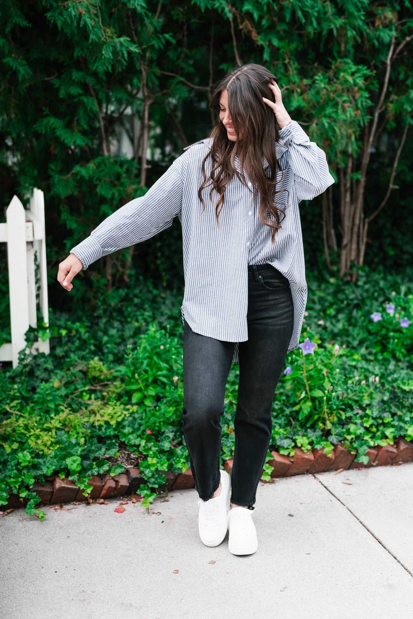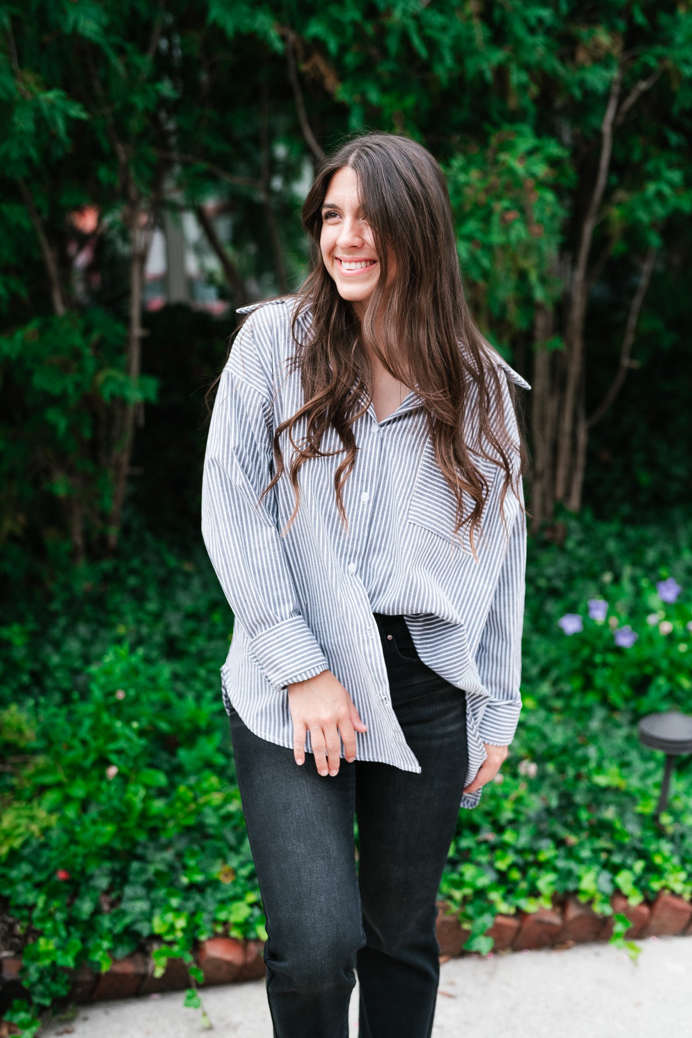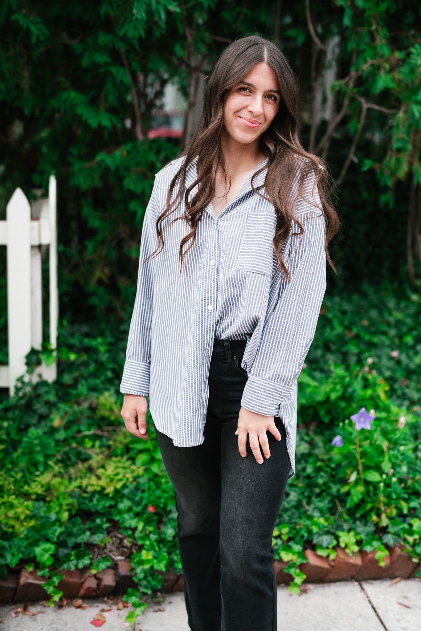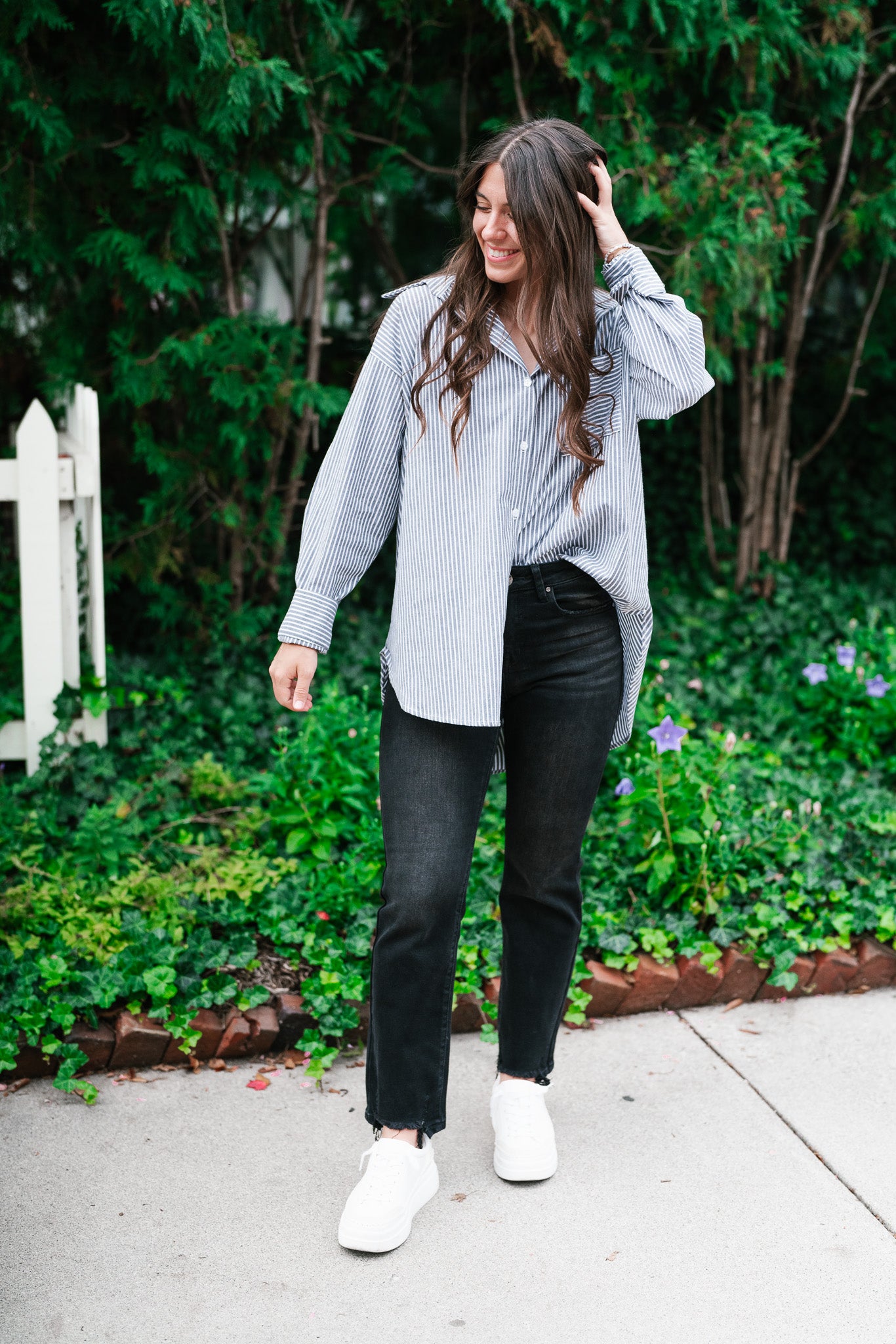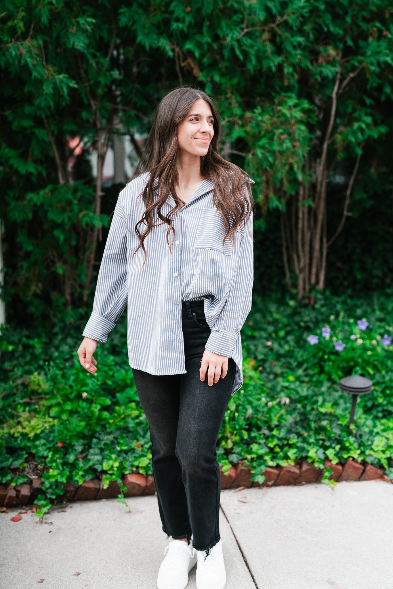 Complete your look with the Coastal Pinstripe Top, designed to match perfectly with our Coastal Pinstripe Bottoms. Featuring the same chic black and white pinstripe pattern, this top offers a polished yet relaxed vibe. With its flattering, slightly boxy silhouette and soft, breathable fabric, it’s the ideal balance of comfort and sophistication. Whether you're dressing it up for work or down for a casual day out, this top is a versatile staple for the modern woman on the go.