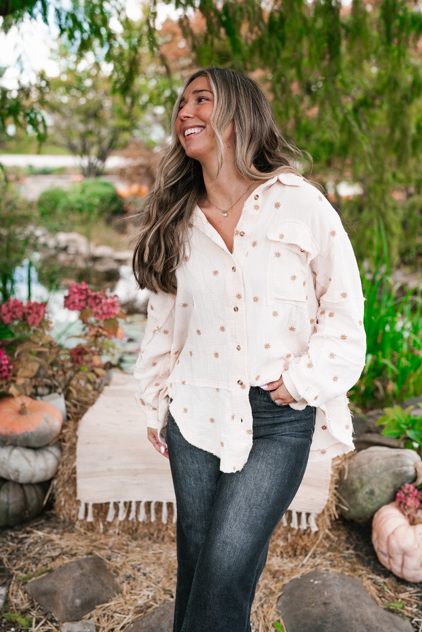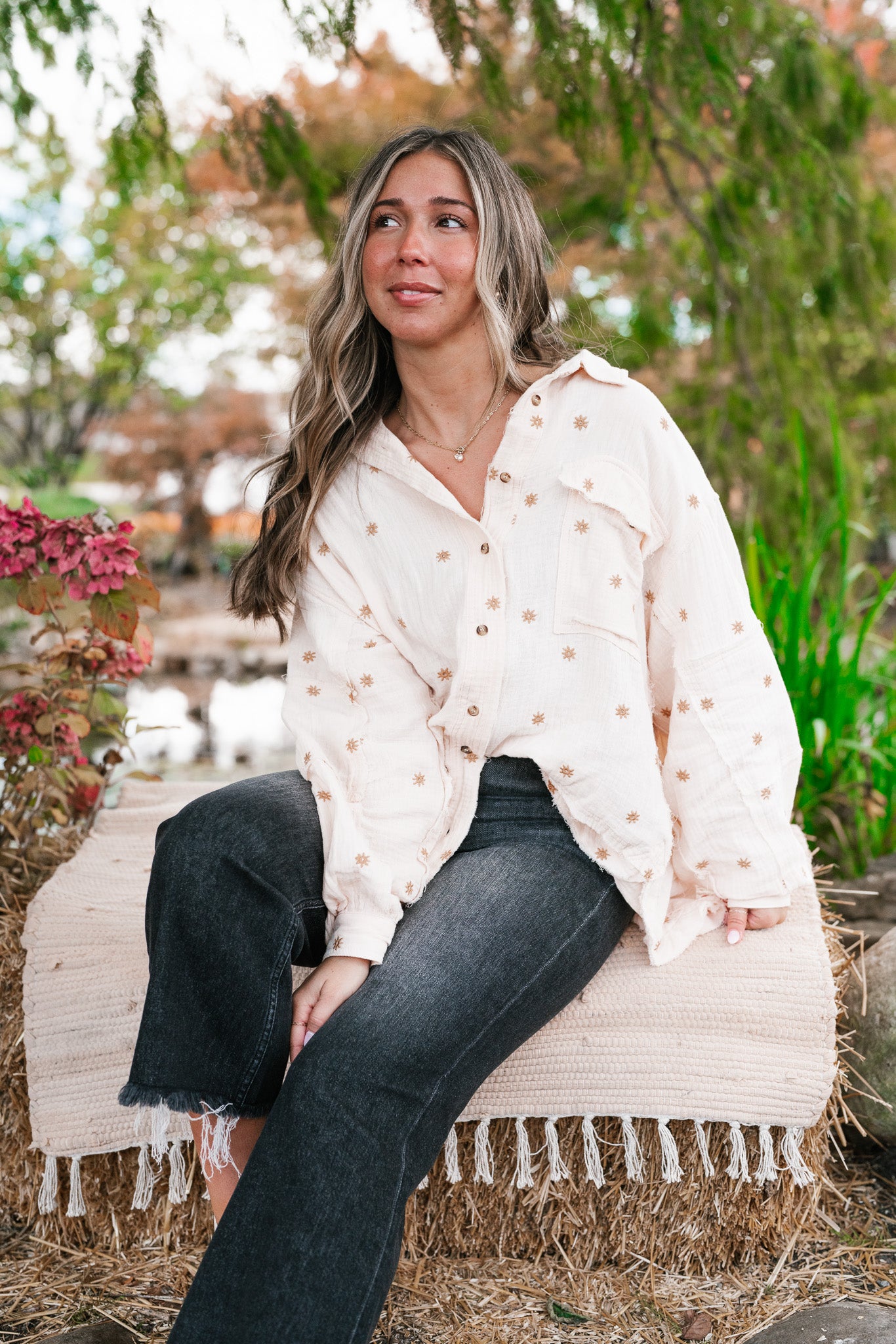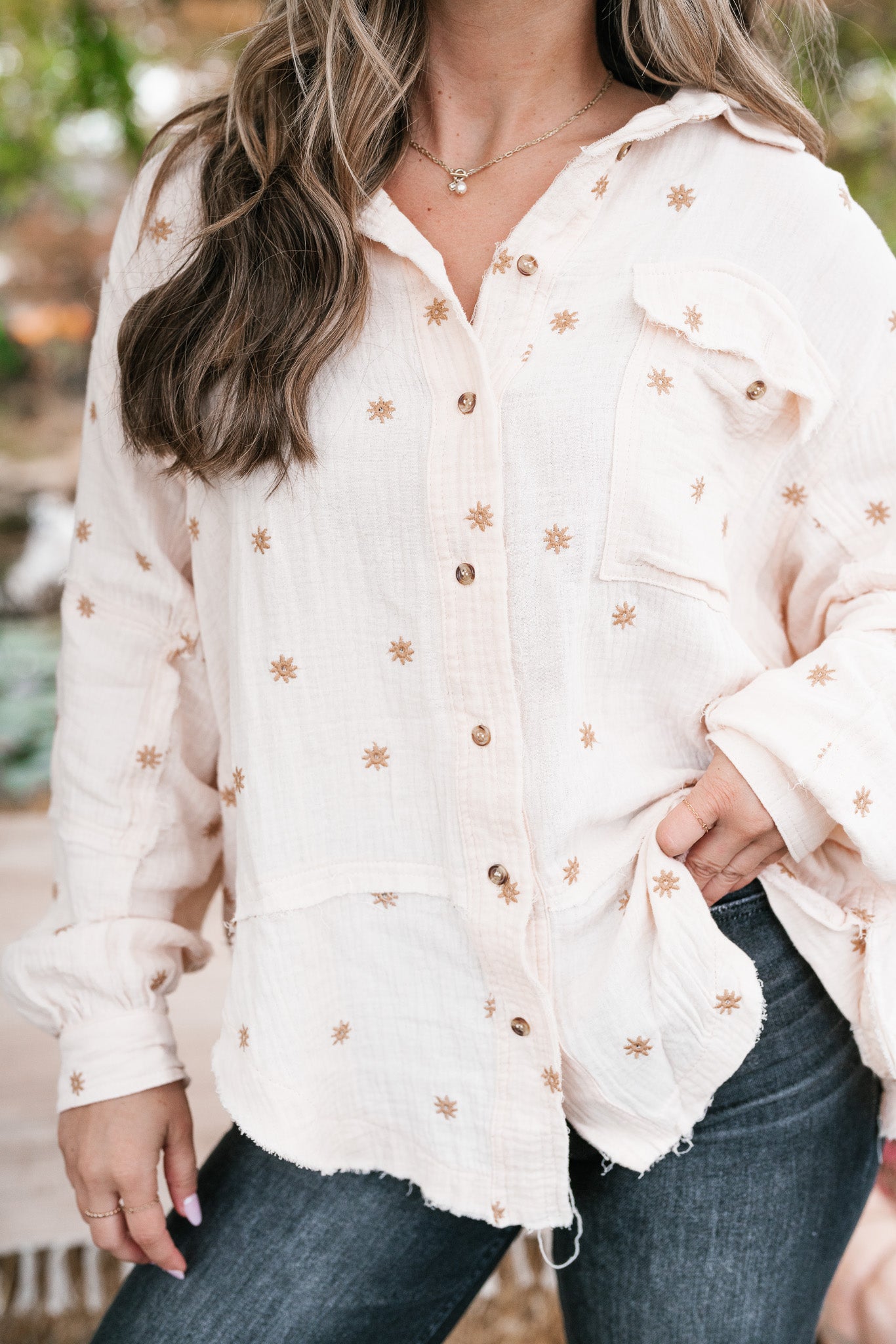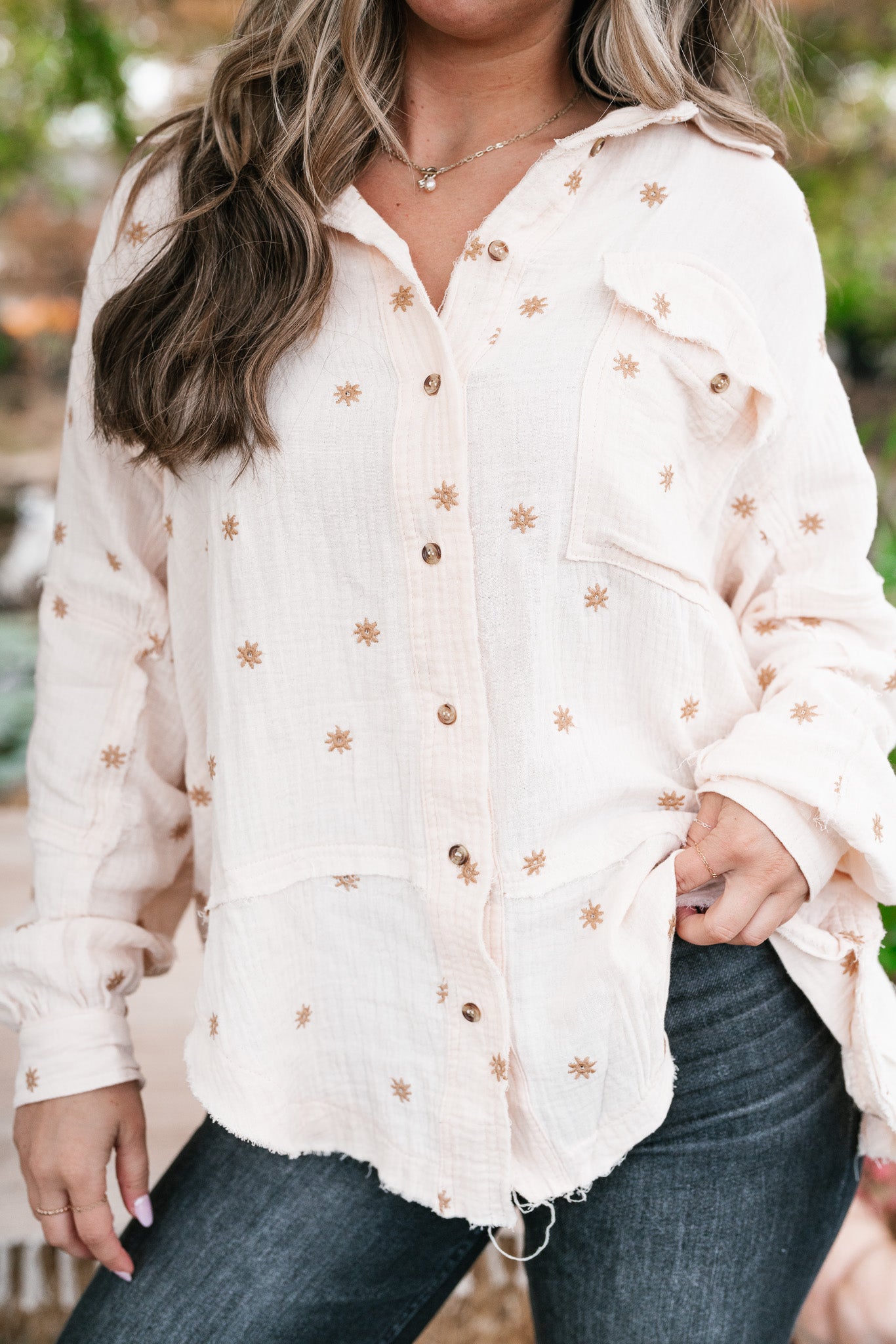 The Dainty Sunlight Button Up Collared Shirt radiates effortless charm with its soft, lightweight fabric and delicate embroidered sun motifs throughout. Designed with a relaxed, flowy fit, this cream-colored button-up shirt features a classic collar and front pocket detail, adding a touch of utility to its dainty design. The subtle texture of the fabric enhances its breezy appeal, making it perfect for warm days or layering under a cozy cardigan. With its whimsical sun embroidery, this shirt captures a playful yet polished aesthetic, ideal for casual chic looks.