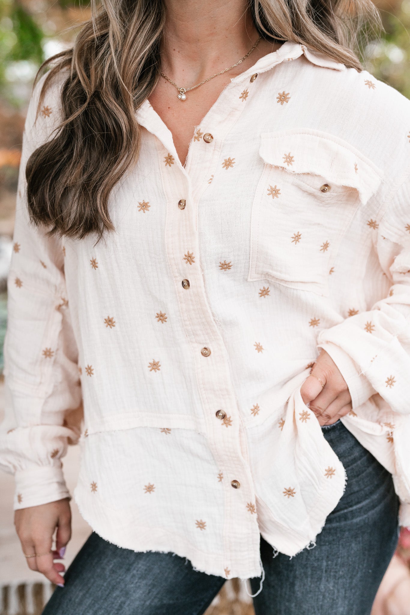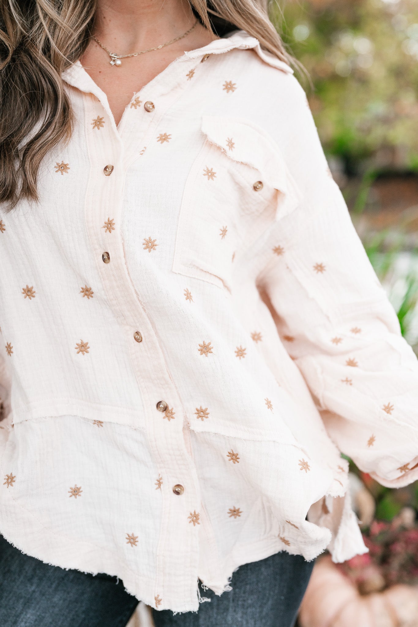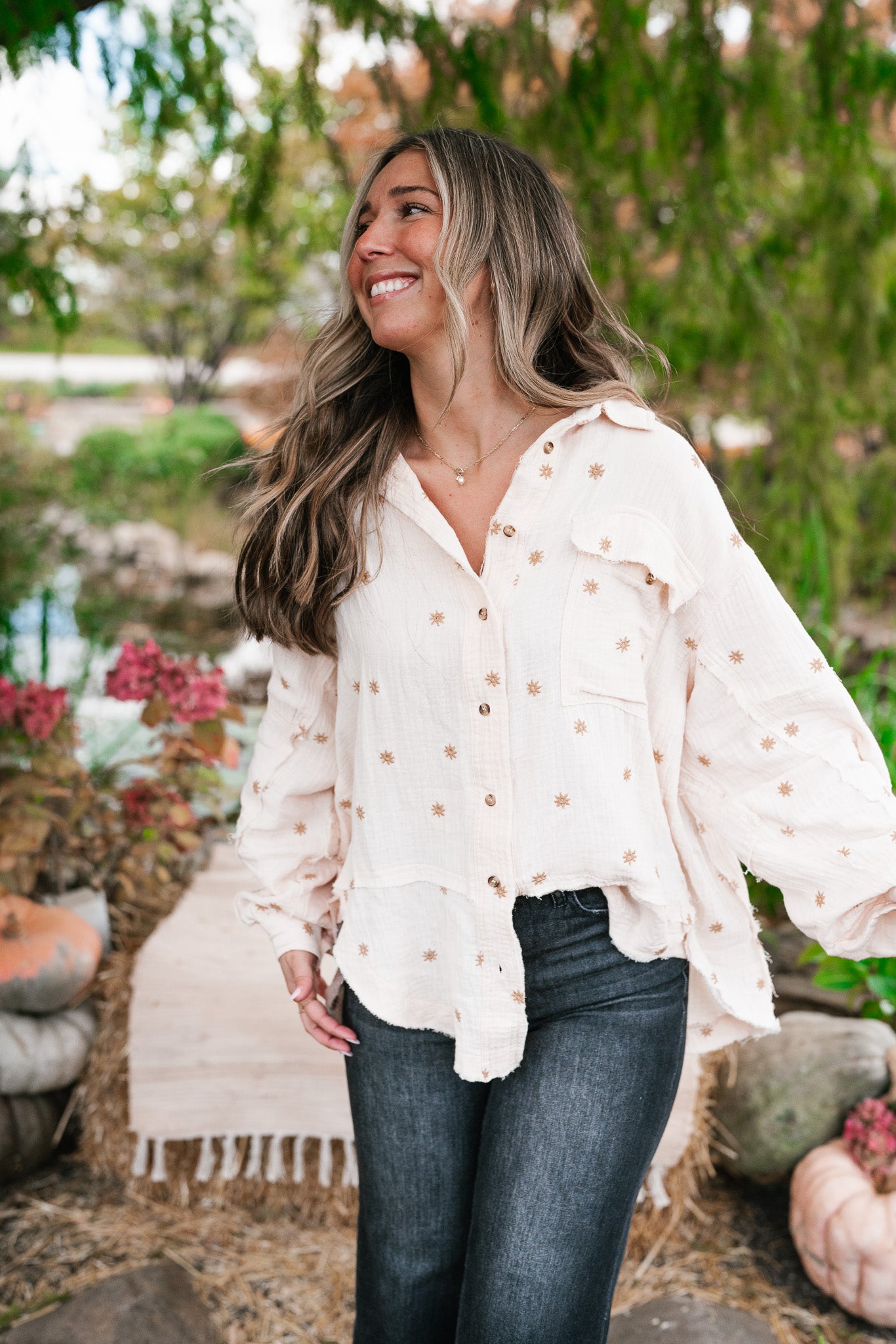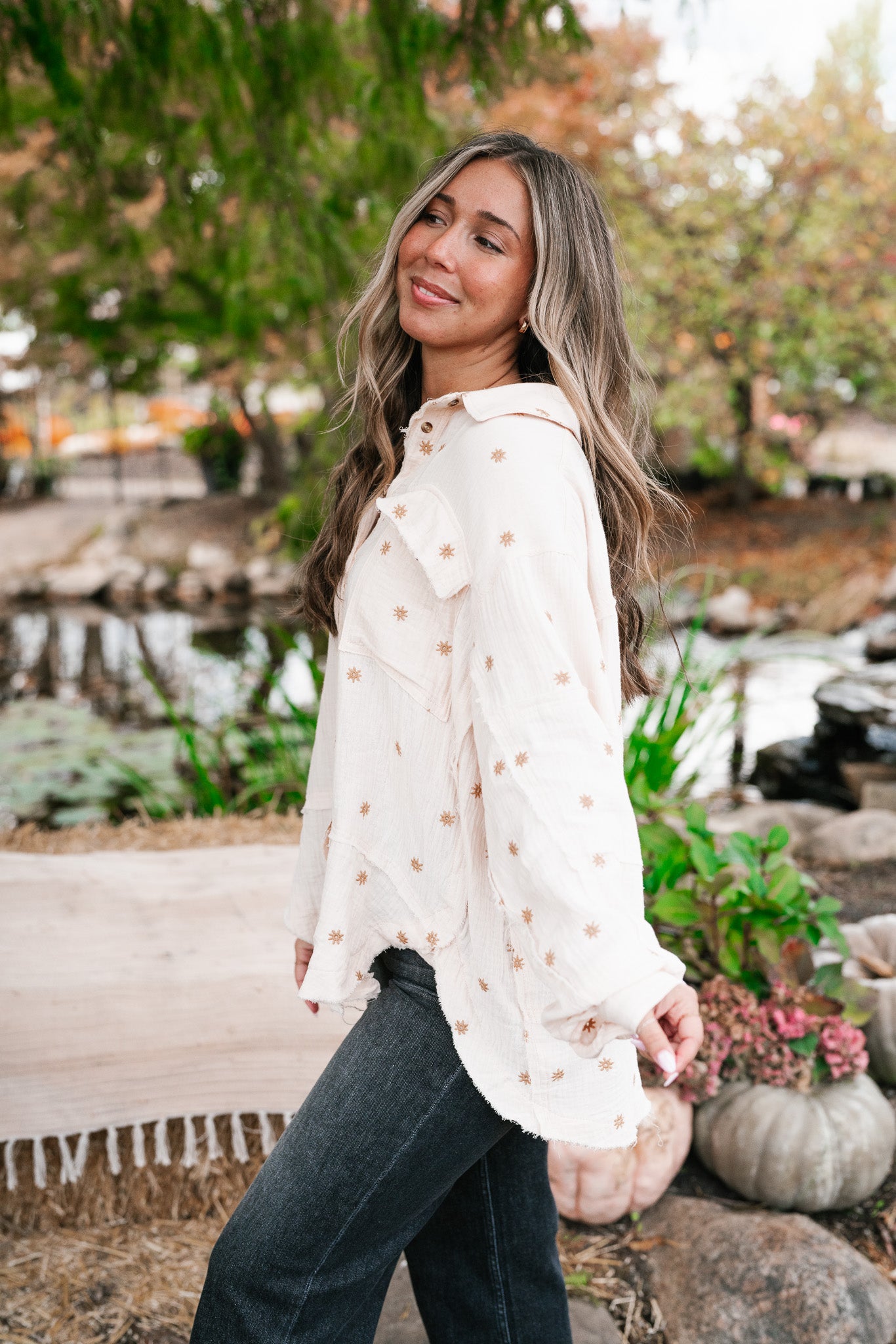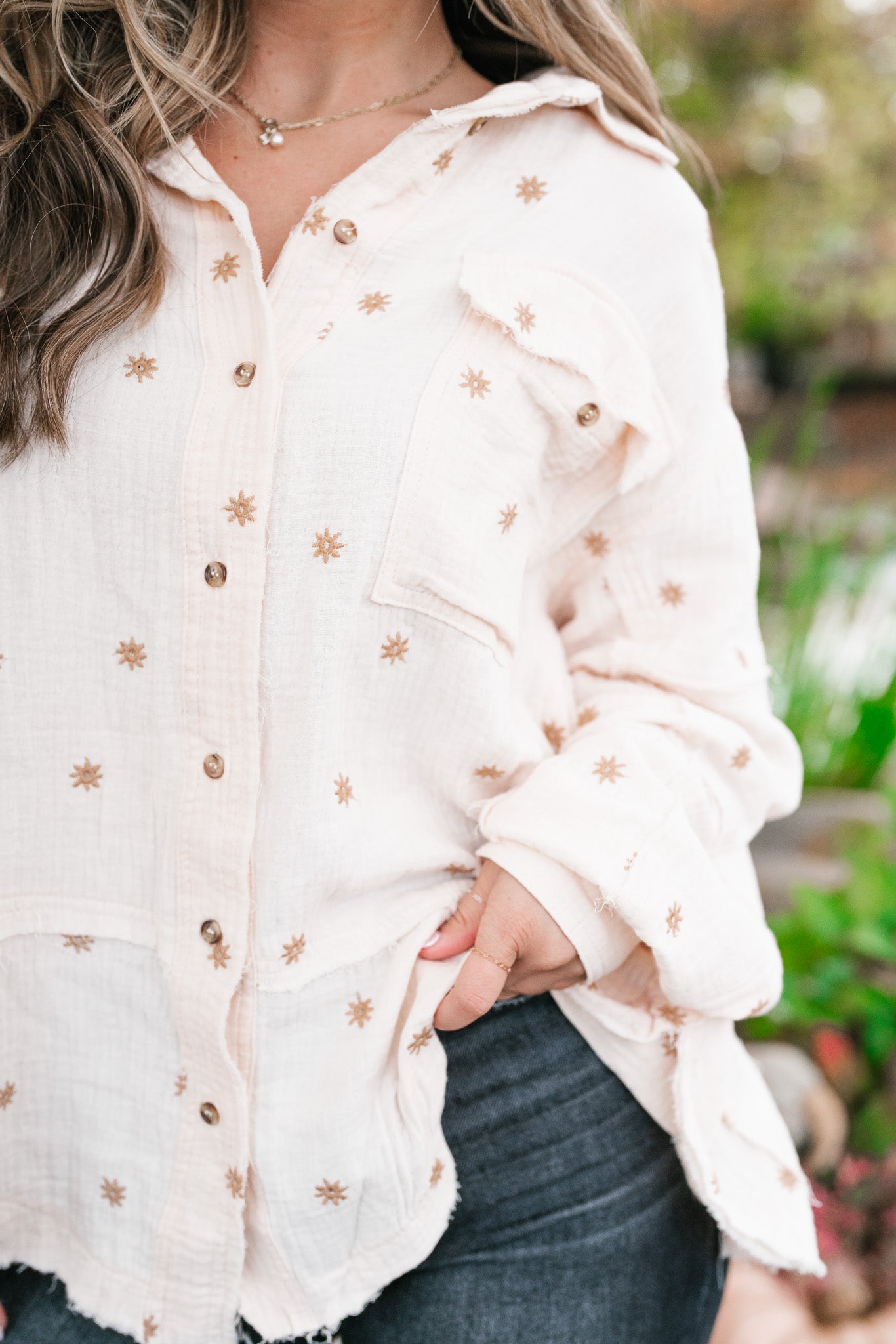 The Dainty Sunlight Button Up Collared Shirt radiates effortless charm with its soft, lightweight fabric and delicate embroidered sun motifs throughout. Designed with a relaxed, flowy fit, this cream-colored button-up shirt features a classic collar and front pocket detail, adding a touch of utility to its dainty design. The subtle texture of the fabric enhances its breezy appeal, making it perfect for warm days or layering under a cozy cardigan. With its whimsical sun embroidery, this shirt captures a playful yet polished aesthetic, ideal for casual chic looks.
