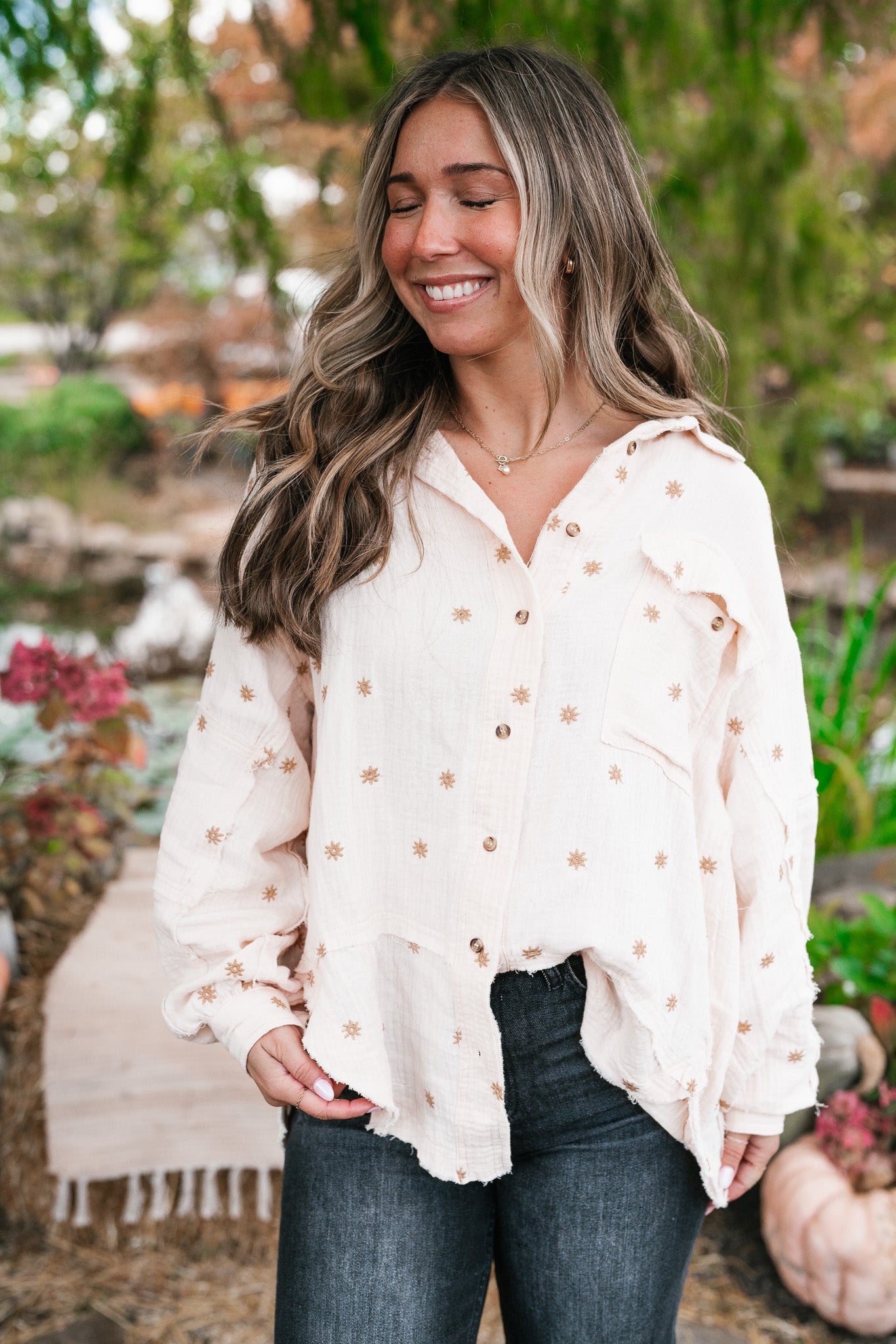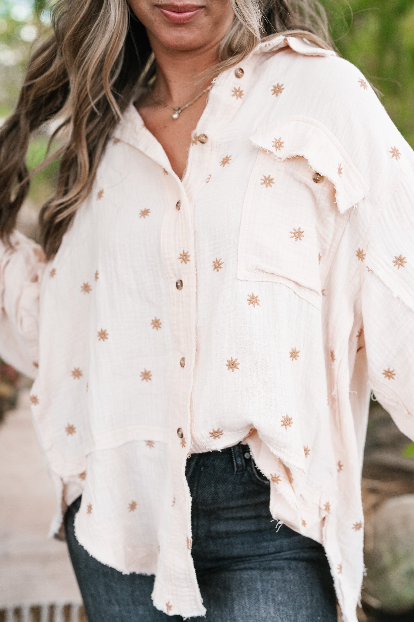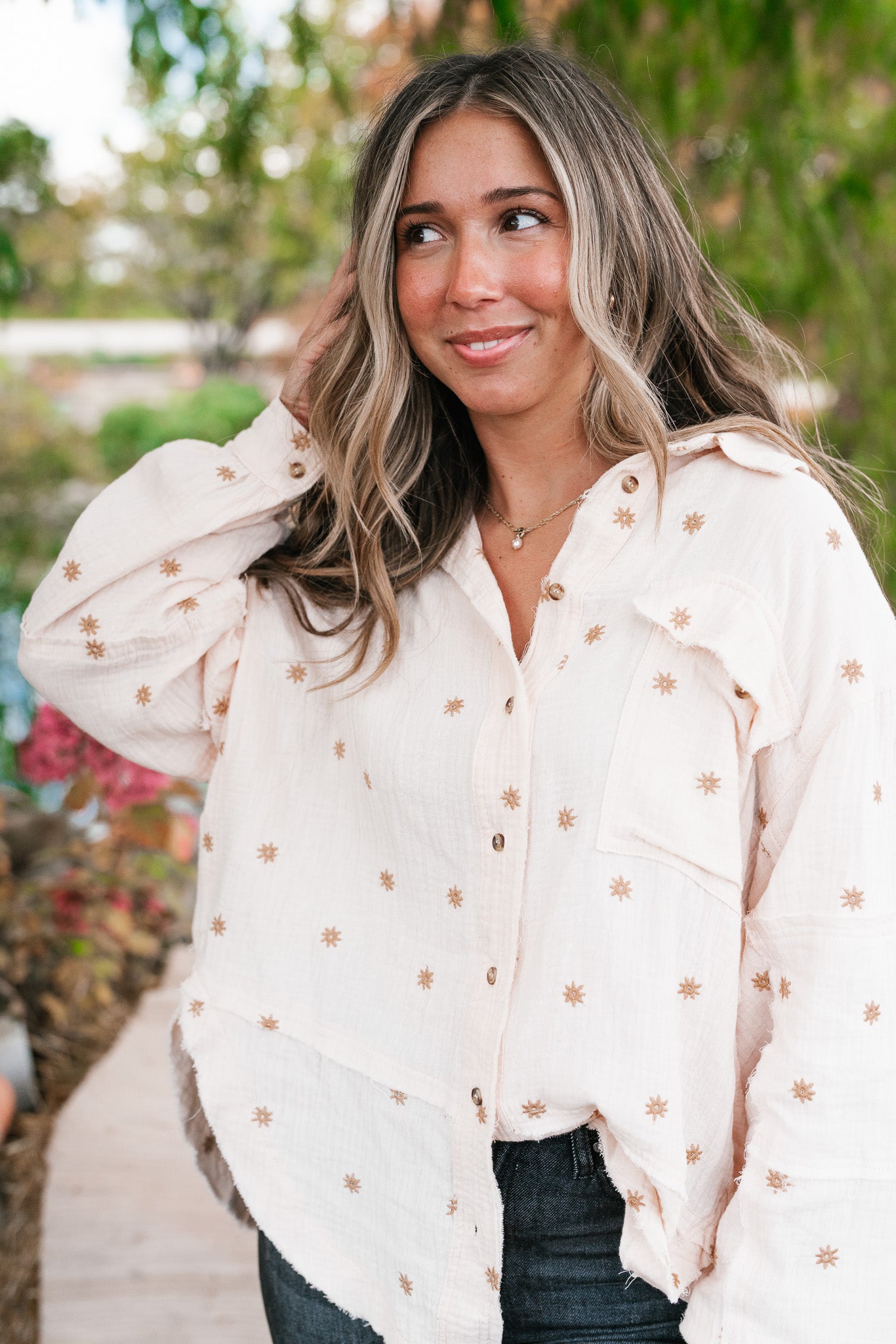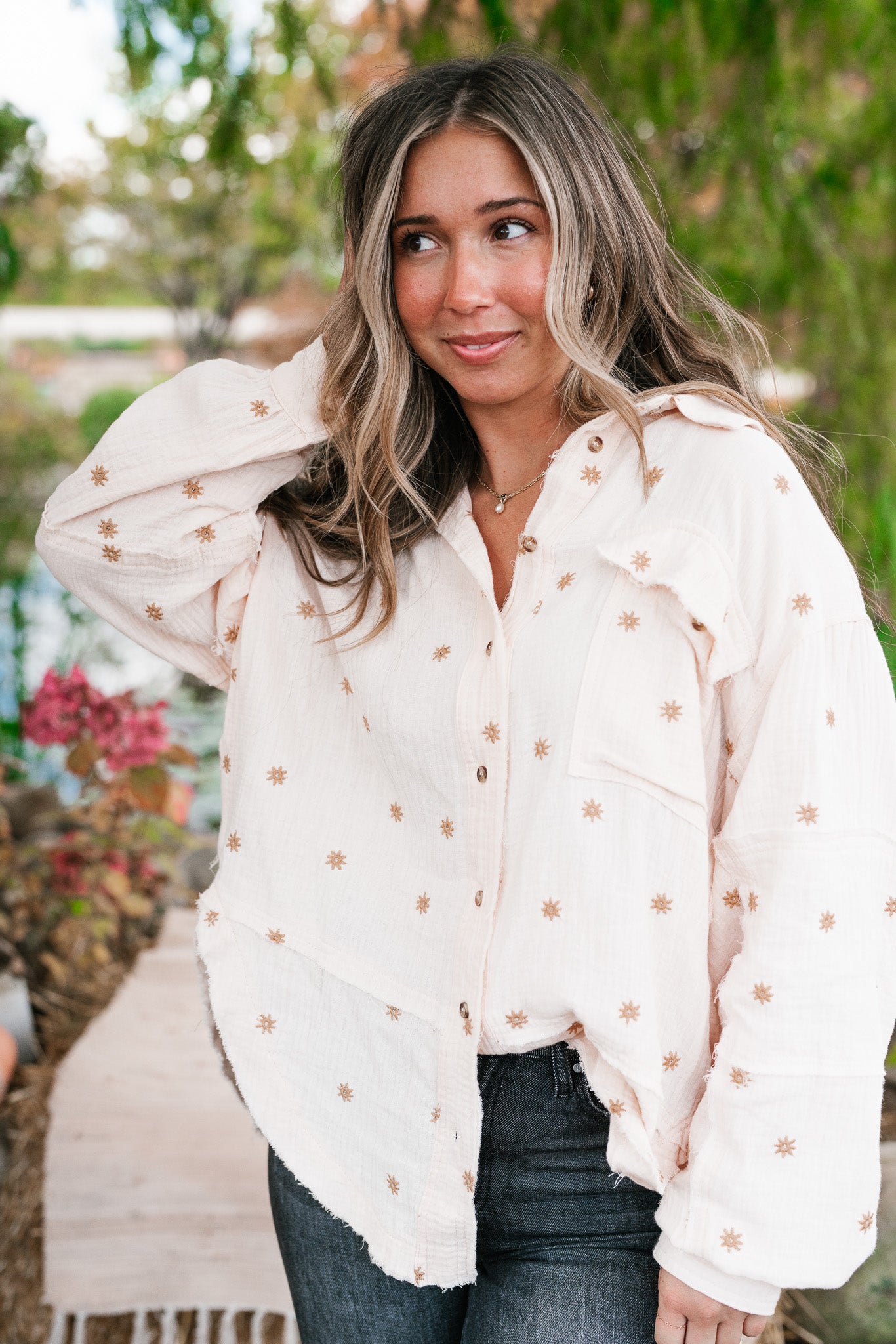The Dainty Sunlight Button Up Collared Shirt radiates effortless charm with its soft, lightweight fabric and delicate embroidered sun motifs throughout. Designed with a relaxed, flowy fit, this cream-colored button-up shirt features a classic collar and front pocket detail, adding a touch of utility to its dainty design. The subtle texture of the fabric enhances its breezy appeal, making it perfect for warm days or layering under a cozy cardigan. With its whimsical sun embroidery, this shirt captures a playful yet polished aesthetic, ideal for casual chic looks.