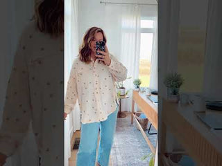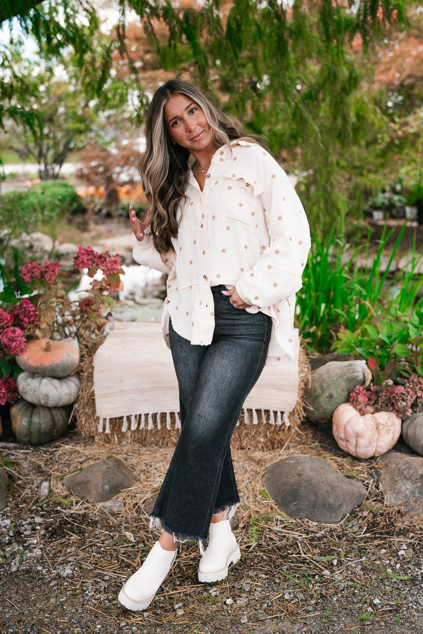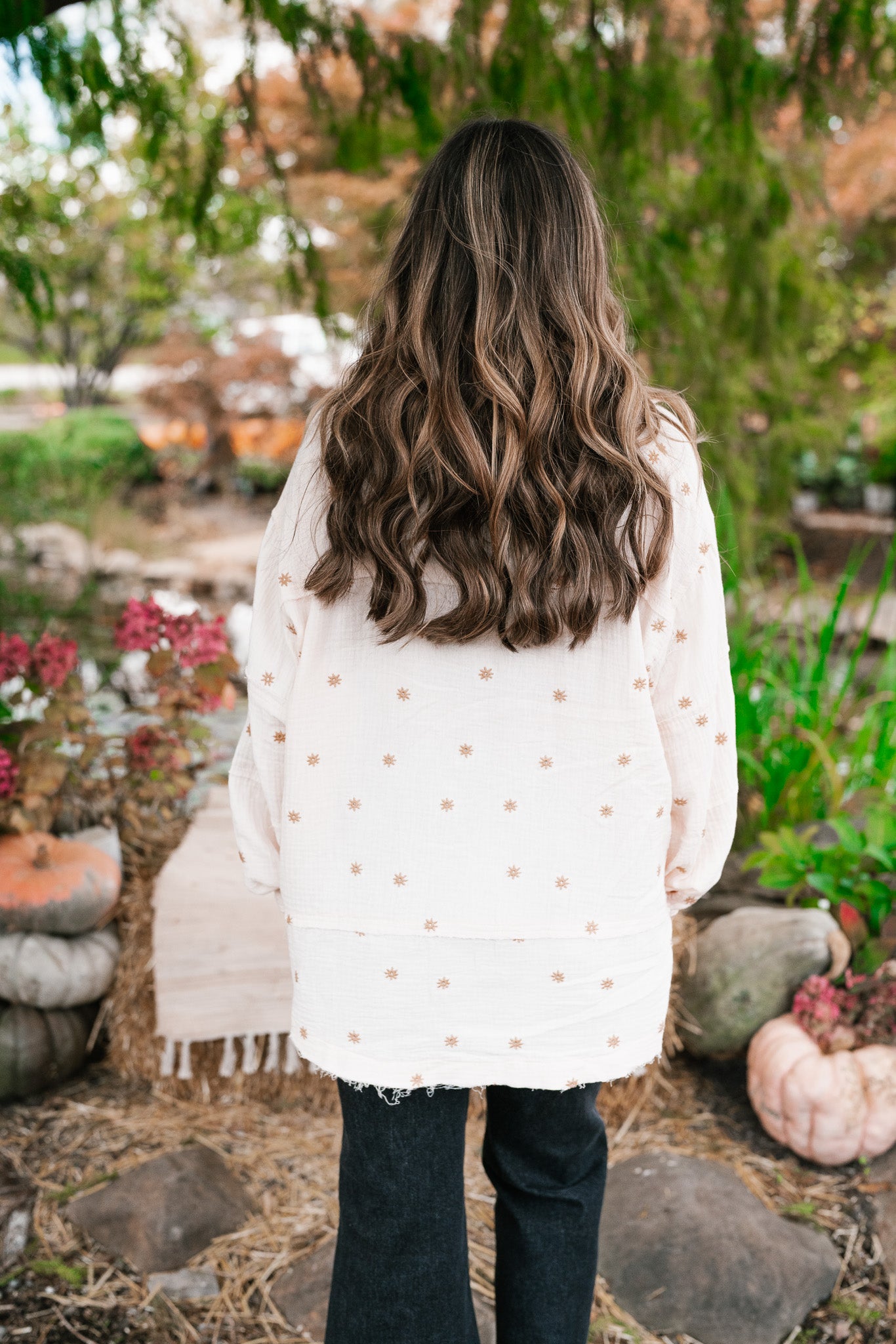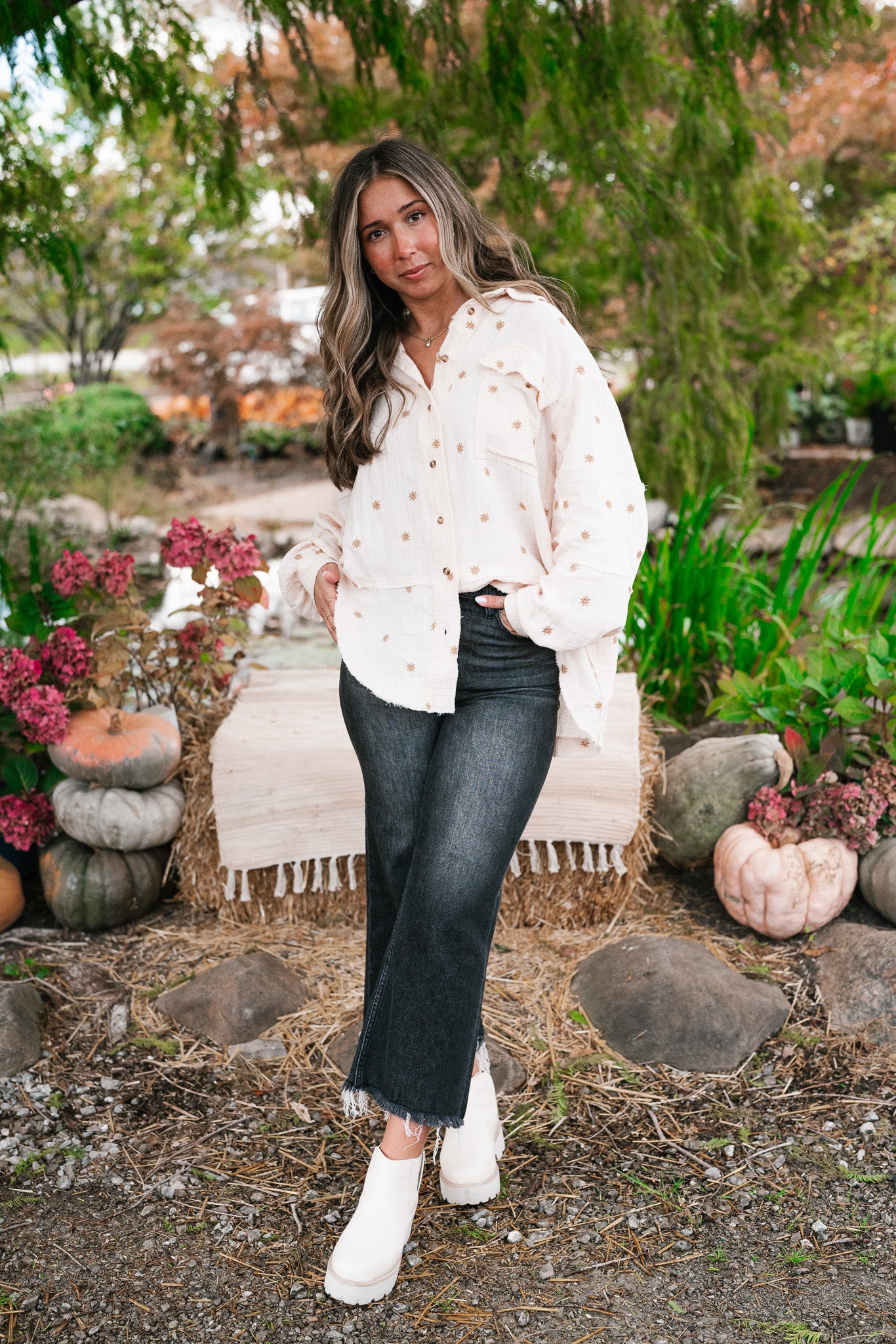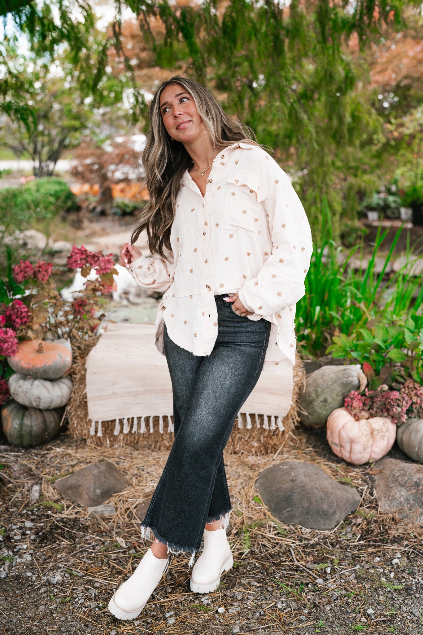The Dainty Sunlight Button Up Collared Shirt radiates effortless charm with its soft, lightweight fabric and delicate embroidered sun motifs throughout. Designed with a relaxed, flowy fit, this cream-colored button-up shirt features a classic collar and front pocket detail, adding a touch of utility to its dainty design. The subtle texture of the fabric enhances its breezy appeal, making it perfect for warm days or layering under a cozy cardigan. With its whimsical sun embroidery, this shirt captures a playful yet polished aesthetic, ideal for casual chic looks.