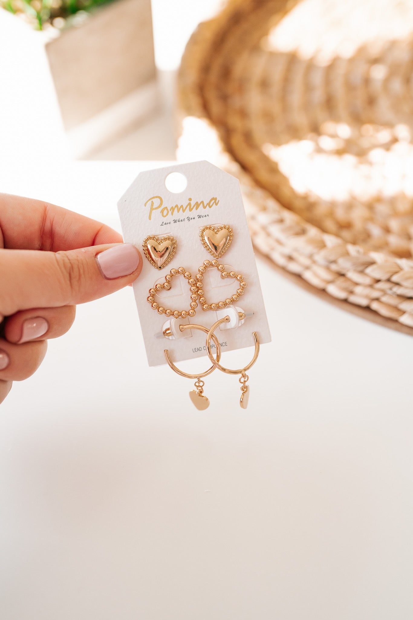 The perfect mix-and-match earring set for everyday sparkle. This trio features two heart-shaped studs—one smooth and one beaded—plus a classic mini hoop with a dainty charm. Sweet, versatile, and effortlessly polished for any look.