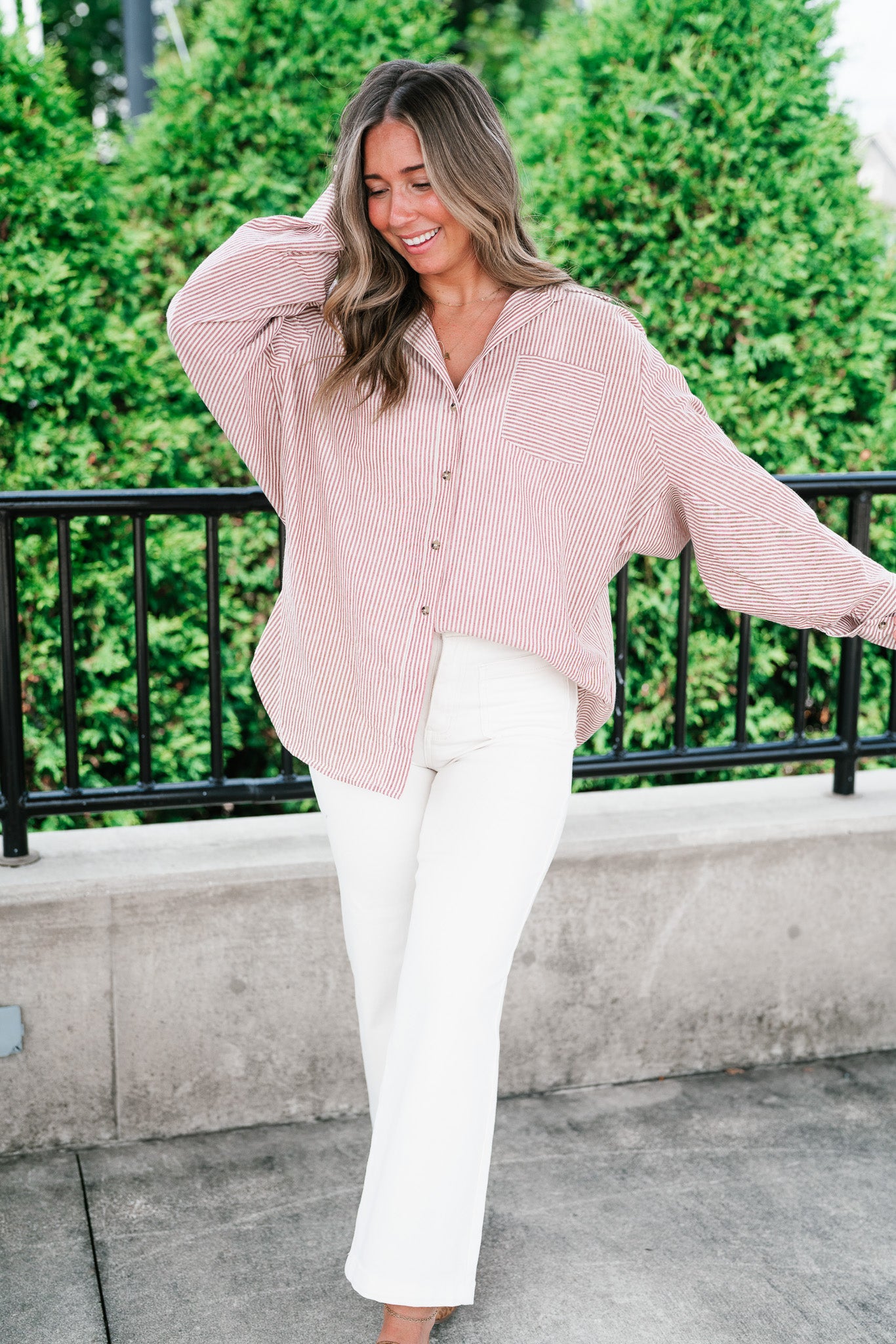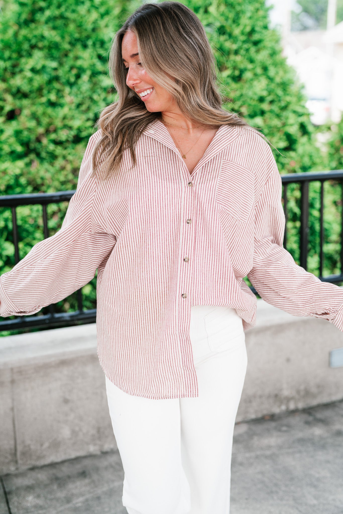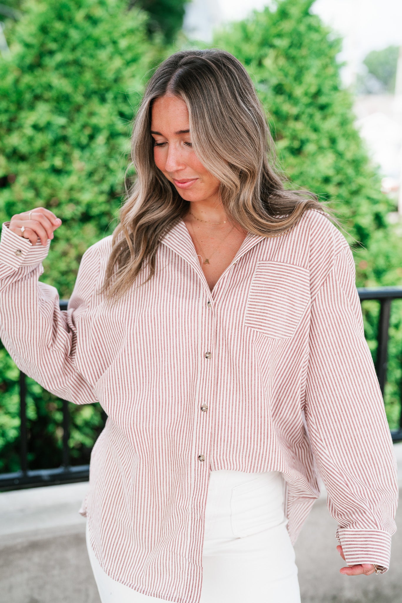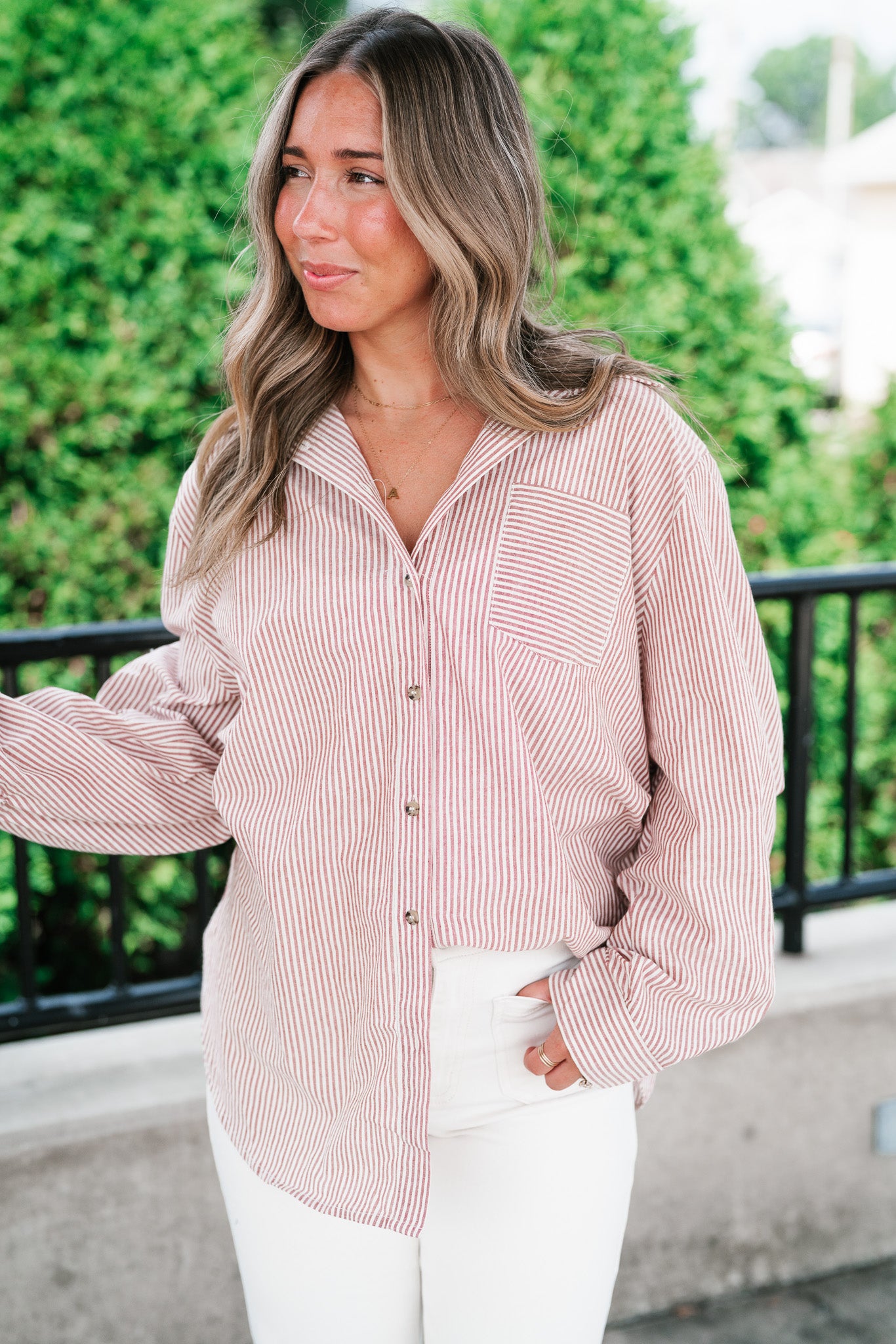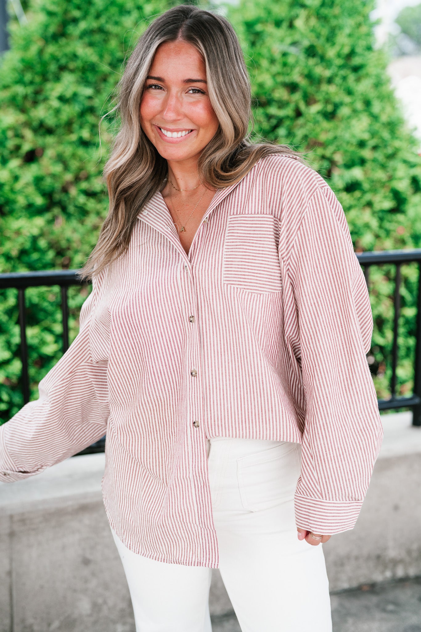 Elevate your wardrobe essentials with the Monroe Pinstripe Button Up Top, a refined take on classic style. Featuring crisp vertical pinstripes, this button-up offers a flattering tailored fit with a polished collared neckline. Crafted from lightweight, breathable fabric, it’s perfect for transitioning from office meetings to casual outings. The functional button front and long sleeves provide versatile styling options, while the sleek pinstripe pattern adds a touch of sophistication to any look. Pair it with tailored pants or your favorite jeans for an effortlessly chic ensemble.
