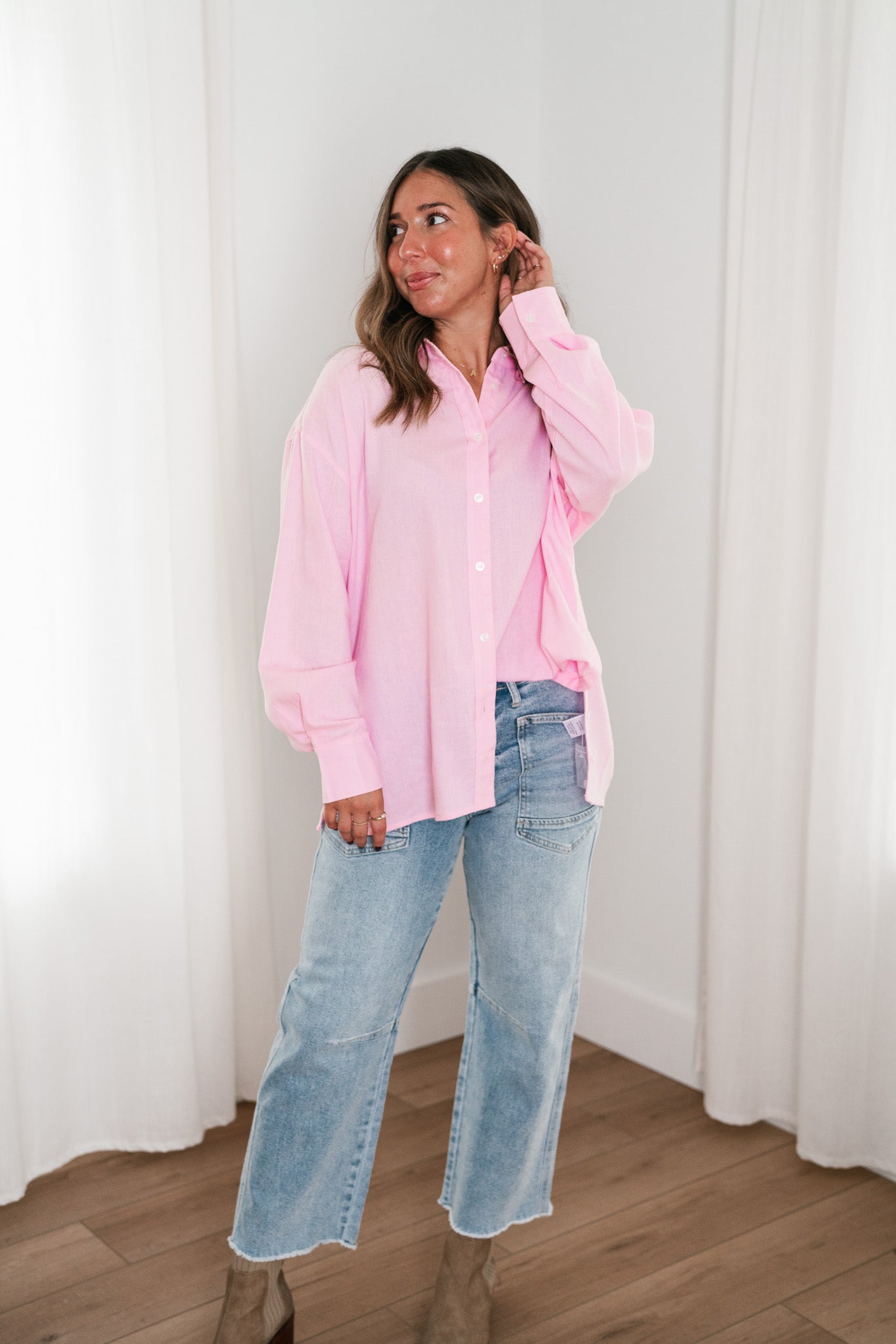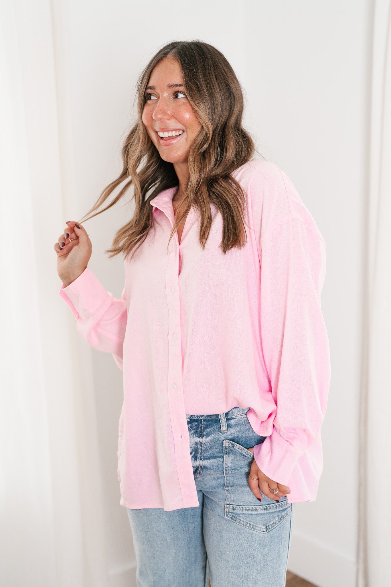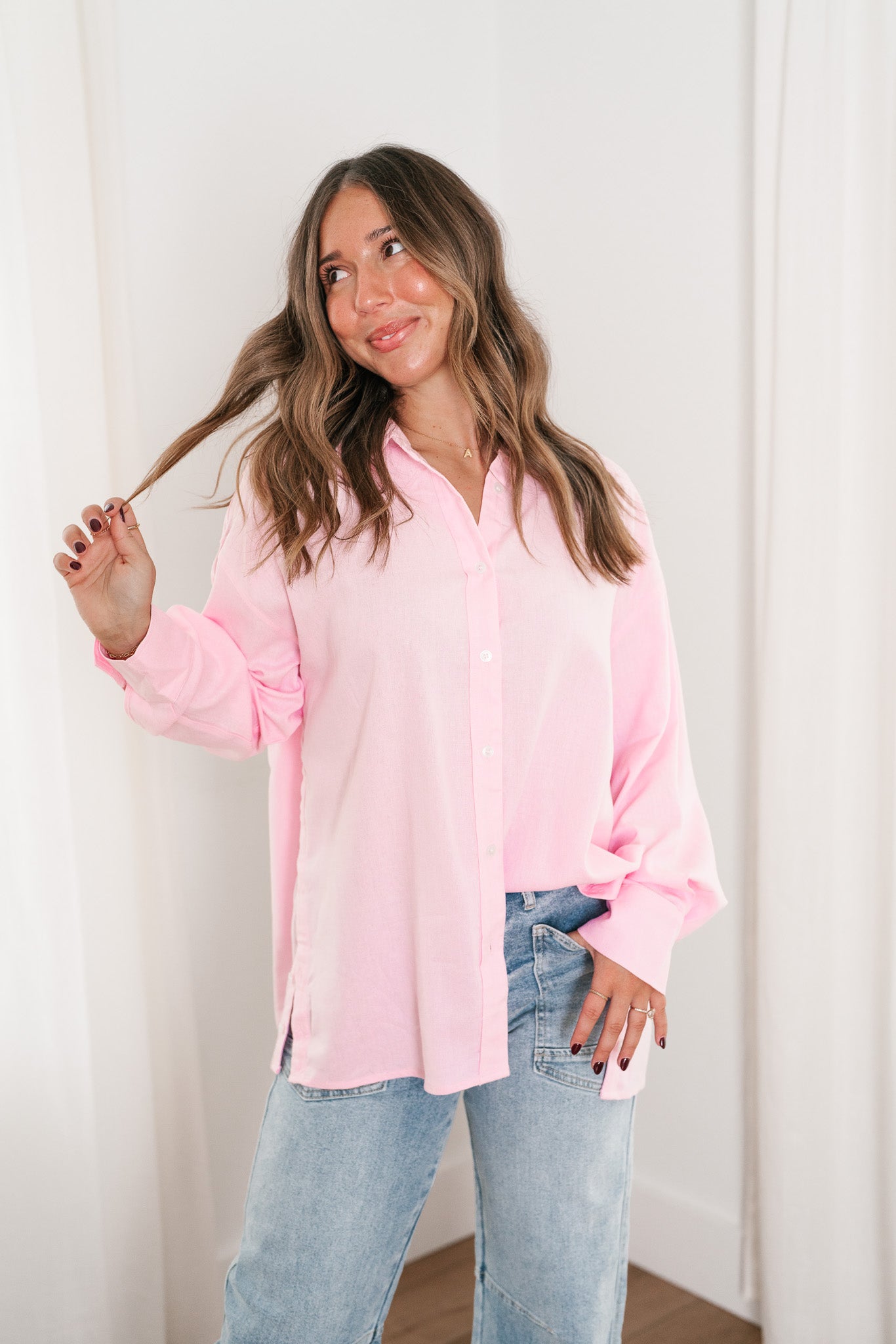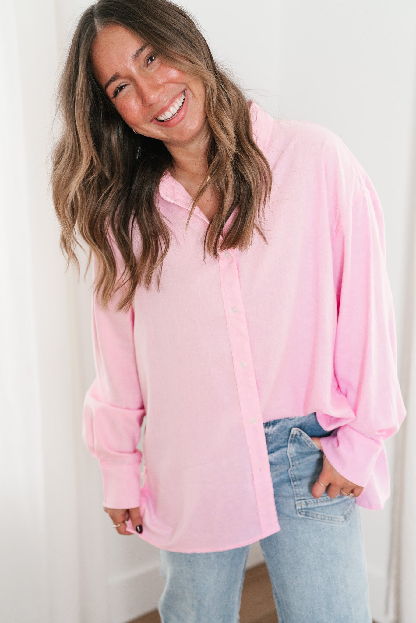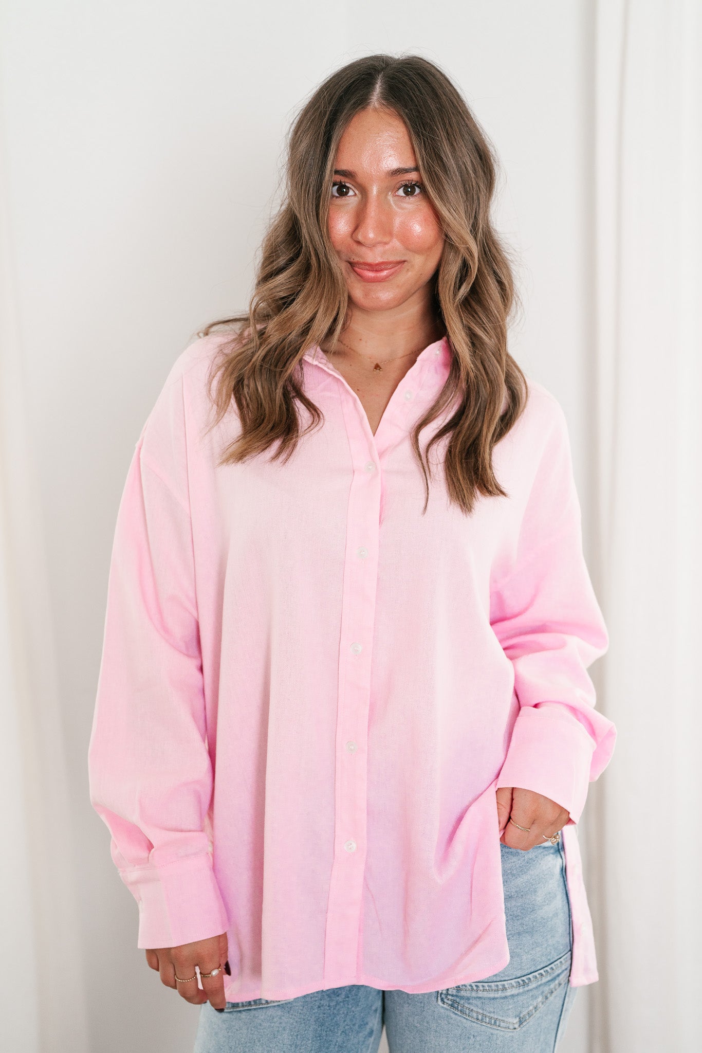 Add a touch of sweetness to your wardrobe with our Oh My Darling Button-Up Top! This lovely piece features a soft, blush pink hue that exudes femininity and charm. Designed with a classic button-front closure and a crisp collar, it offers a versatile and polished look that's perfect for both casual outings and more refined occasions. The lightweight, breathable fabric ensures comfort throughout the day, while the relaxed fit makes it easy to layer or wear solo. Pair it with your favorite jeans for a laid-back vibe or tuck it into a skirt for a chic, sophisticated ensemble.