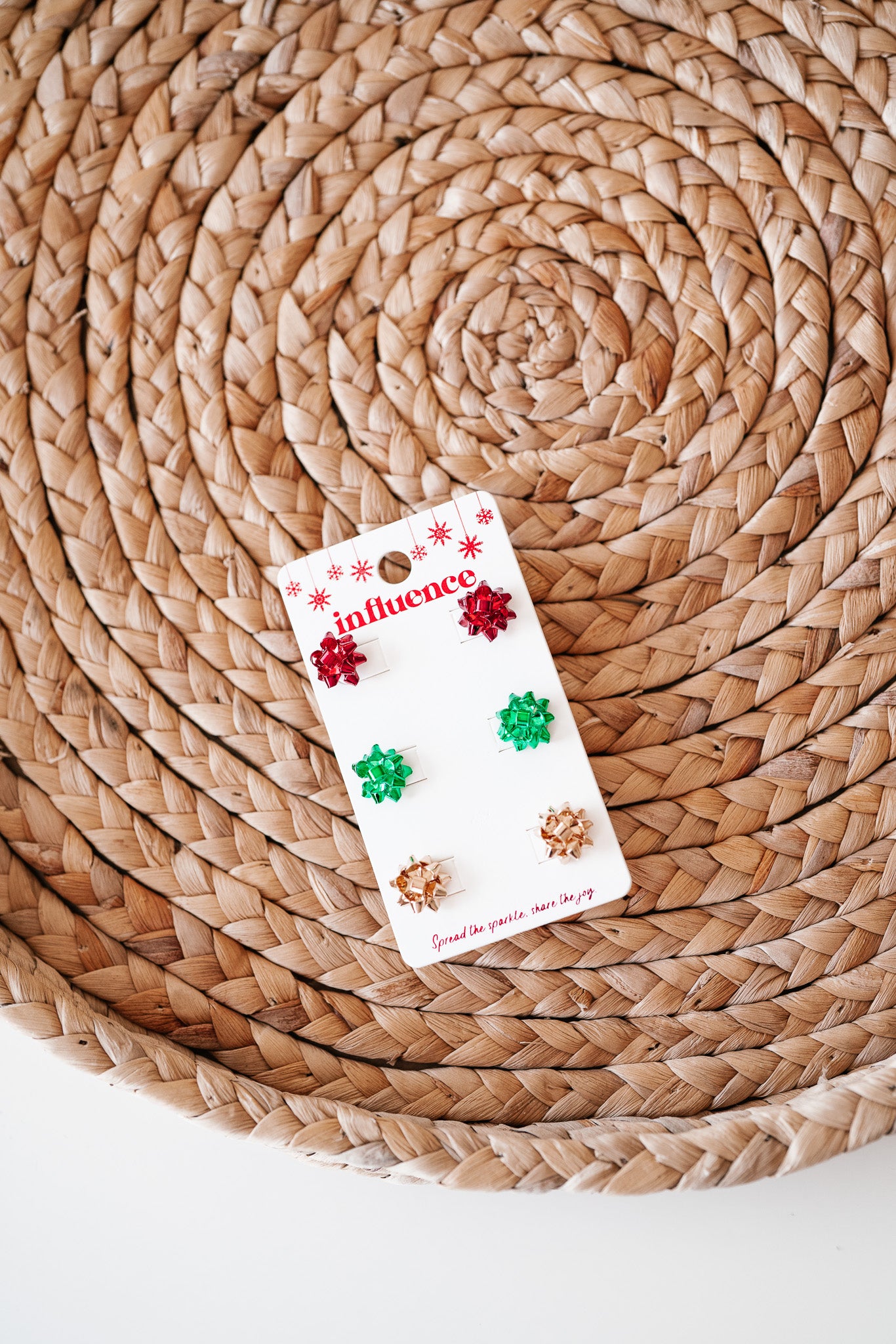 Add a little cheer to every outfit with this adorable holiday bow earring set! Featuring three festive pairs—red, green, and metallic gold—these playful studs bring instant holiday spirit to your look. Perfect for parties, gifting, or adding a touch of joy to your everyday style. Light, cute, and guaranteed to make you smile all season long.