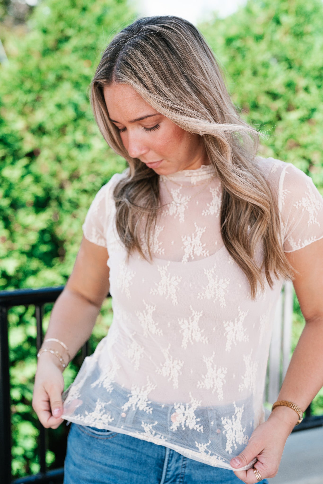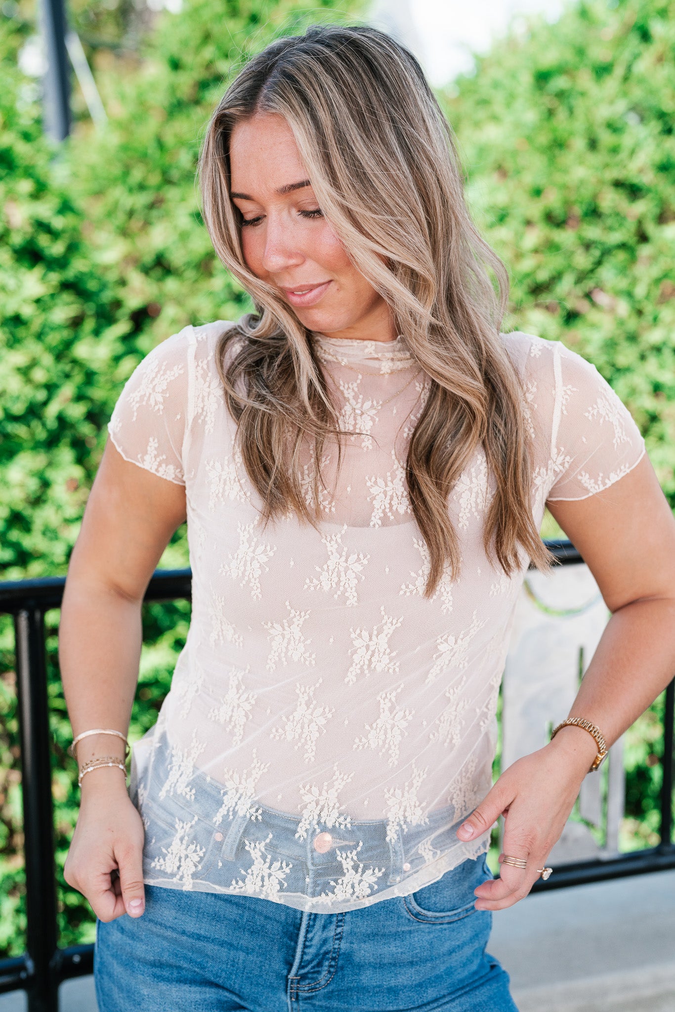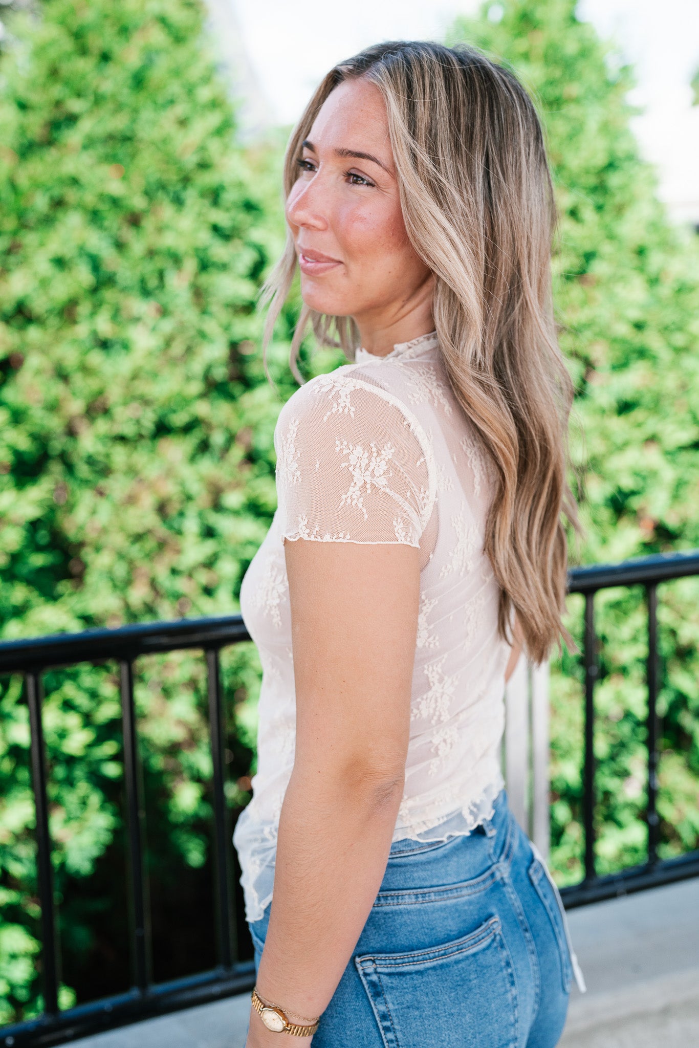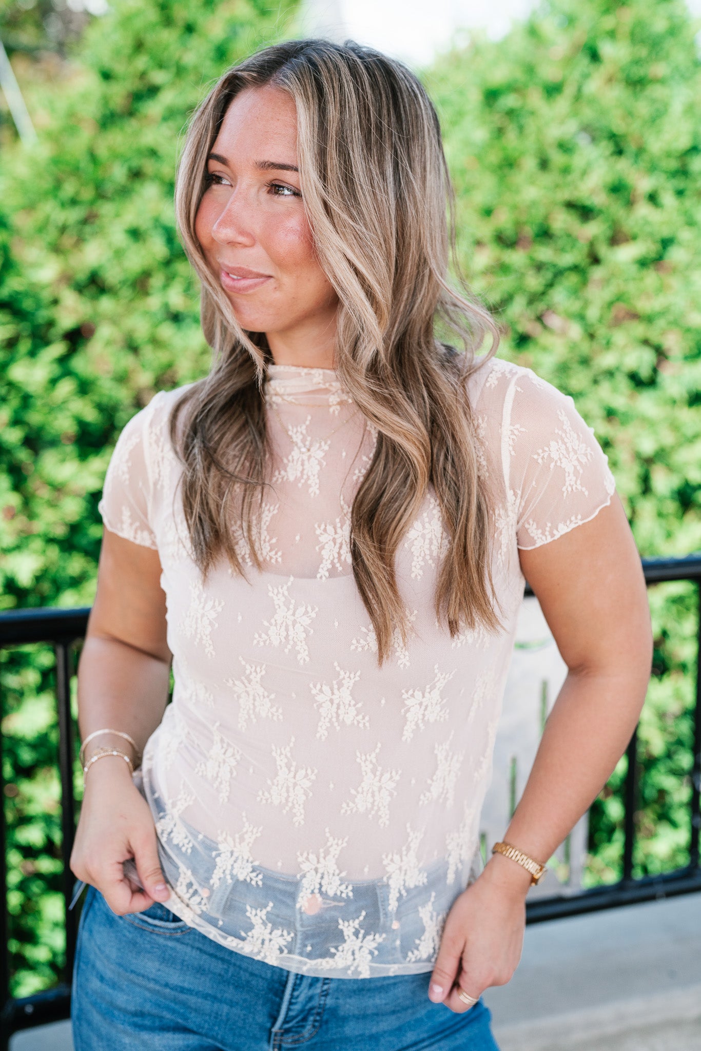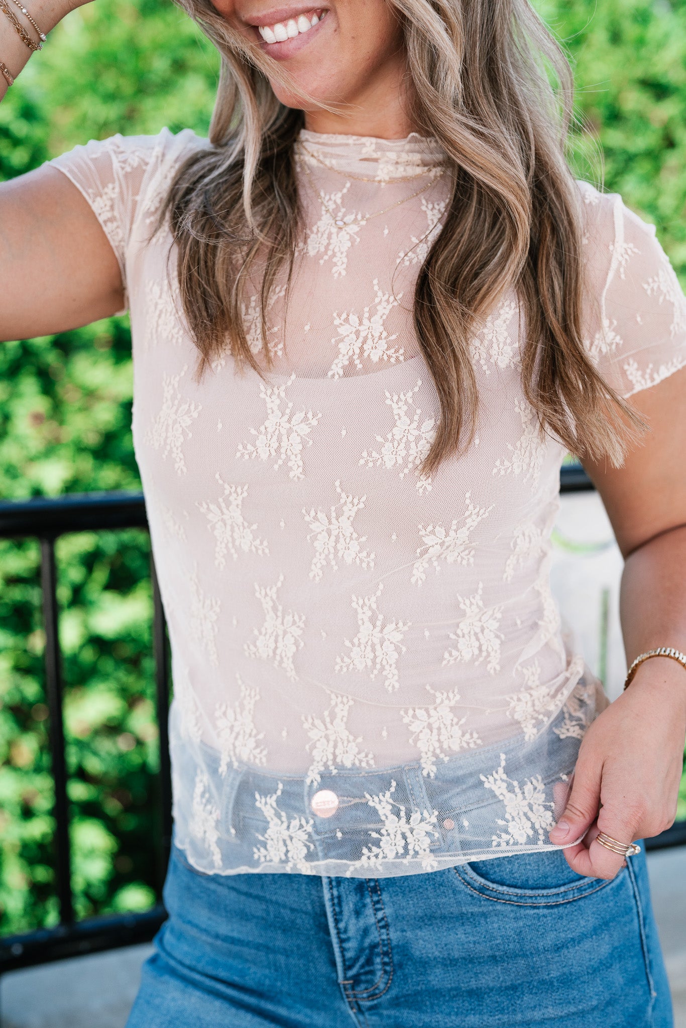 Bring a delicate touch to your wardrobe with the Sheer Lace Short Sleeve Top.