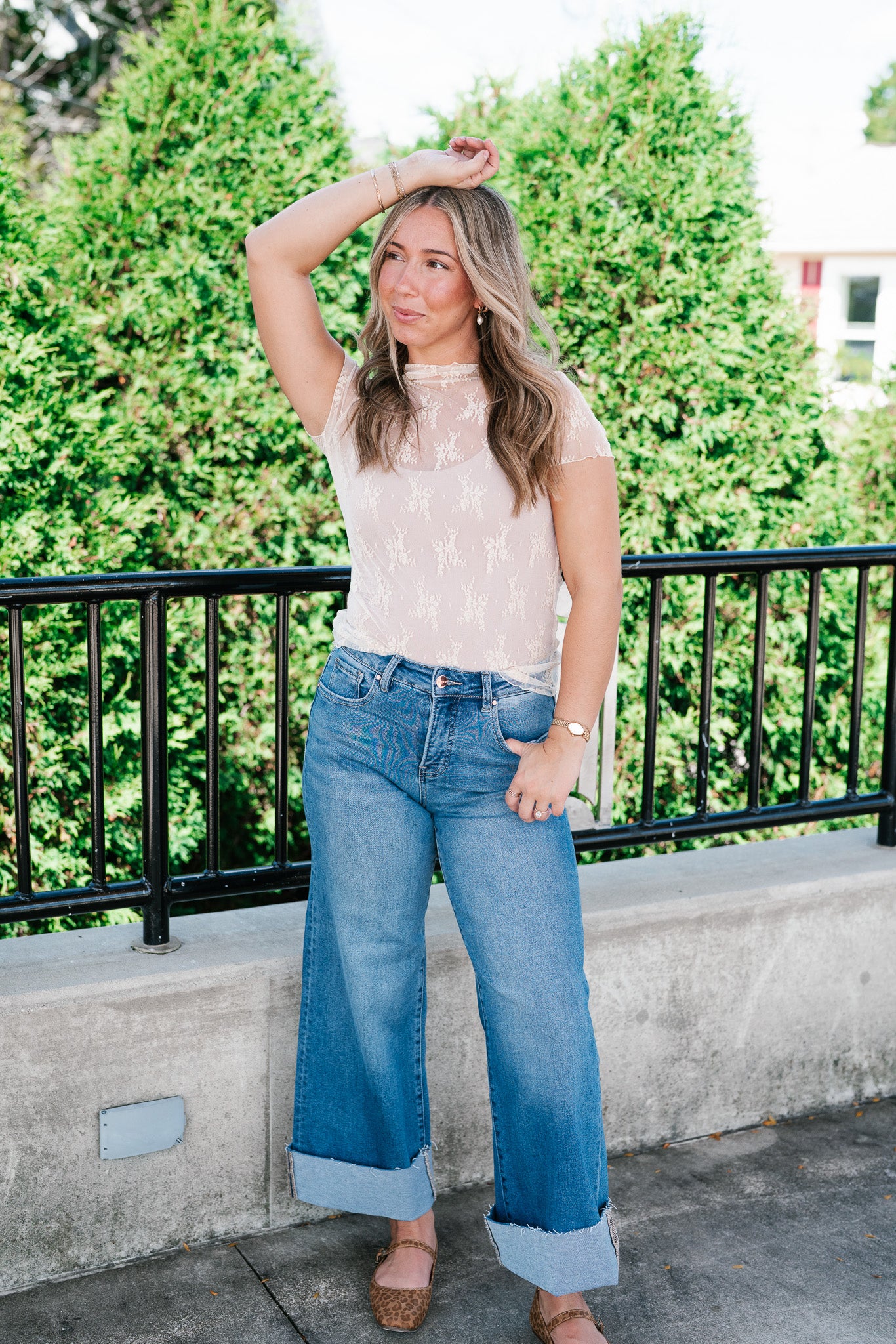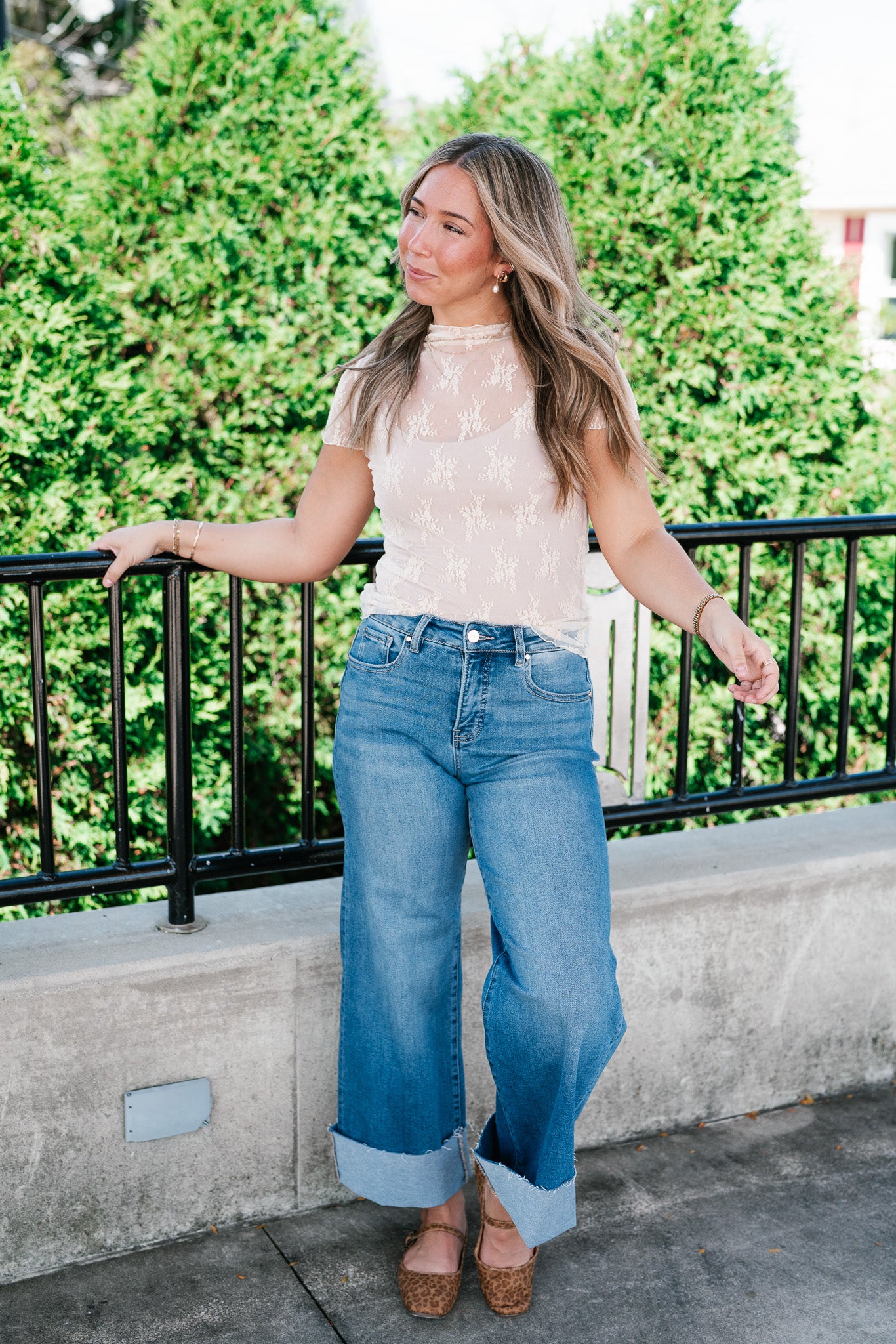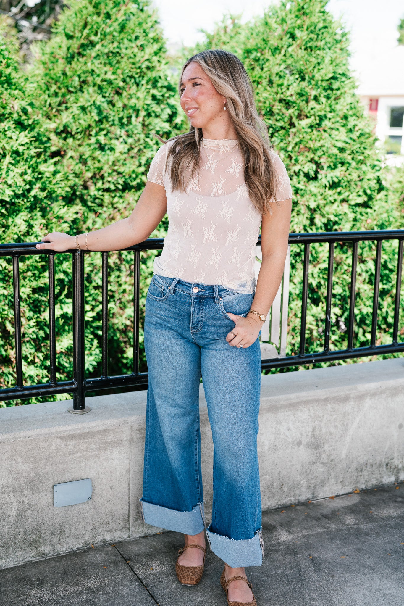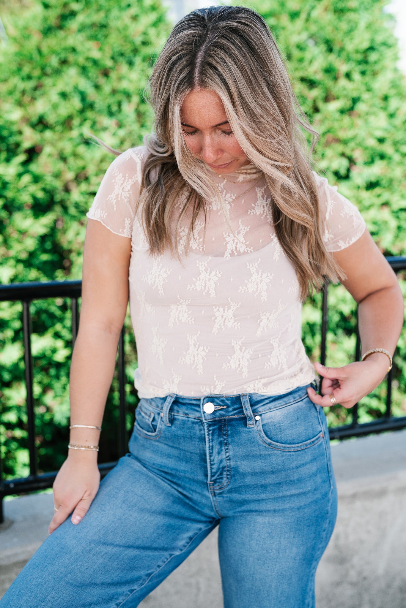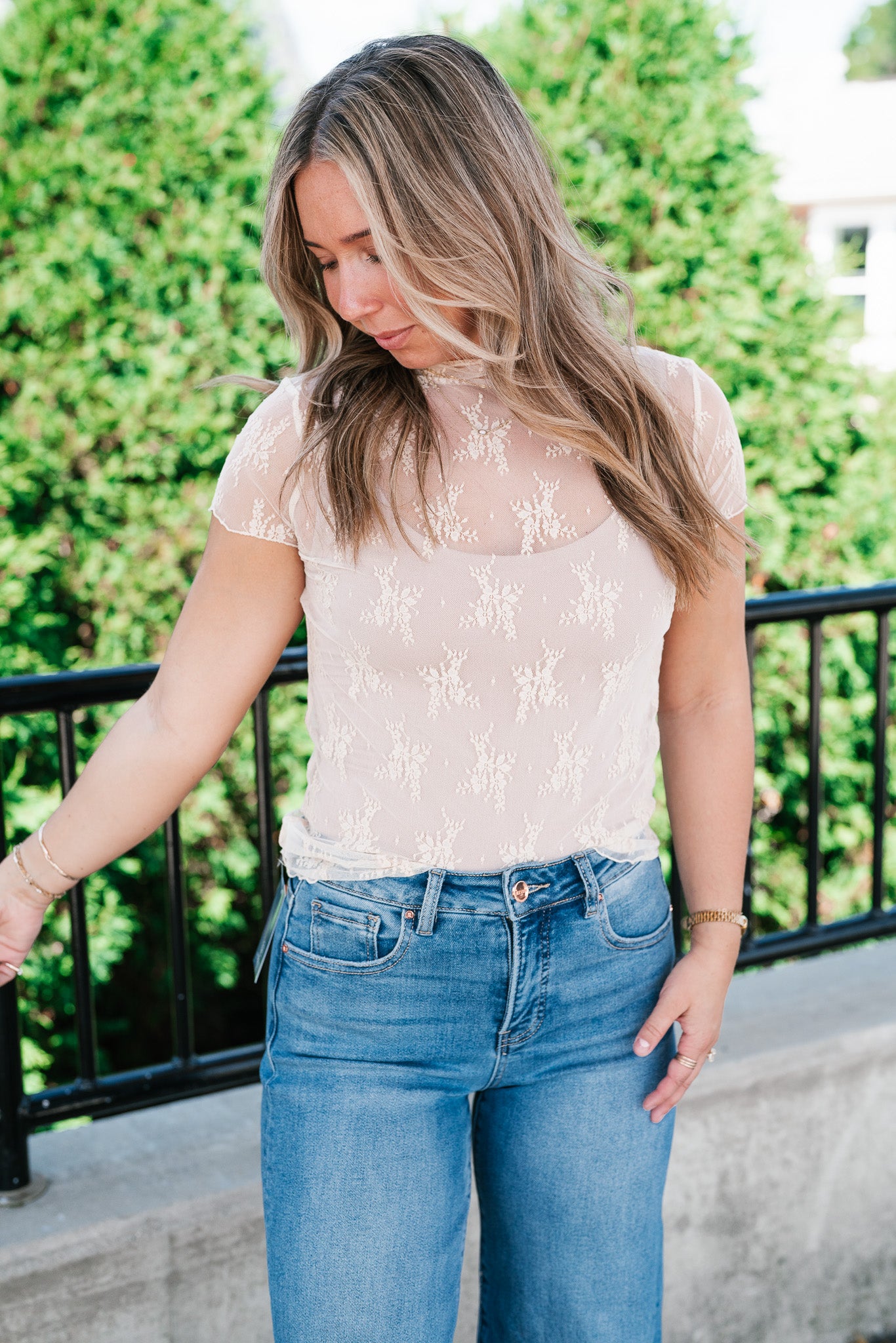 Bring a delicate touch to your wardrobe with the Sheer Lace Short Sleeve Top.
