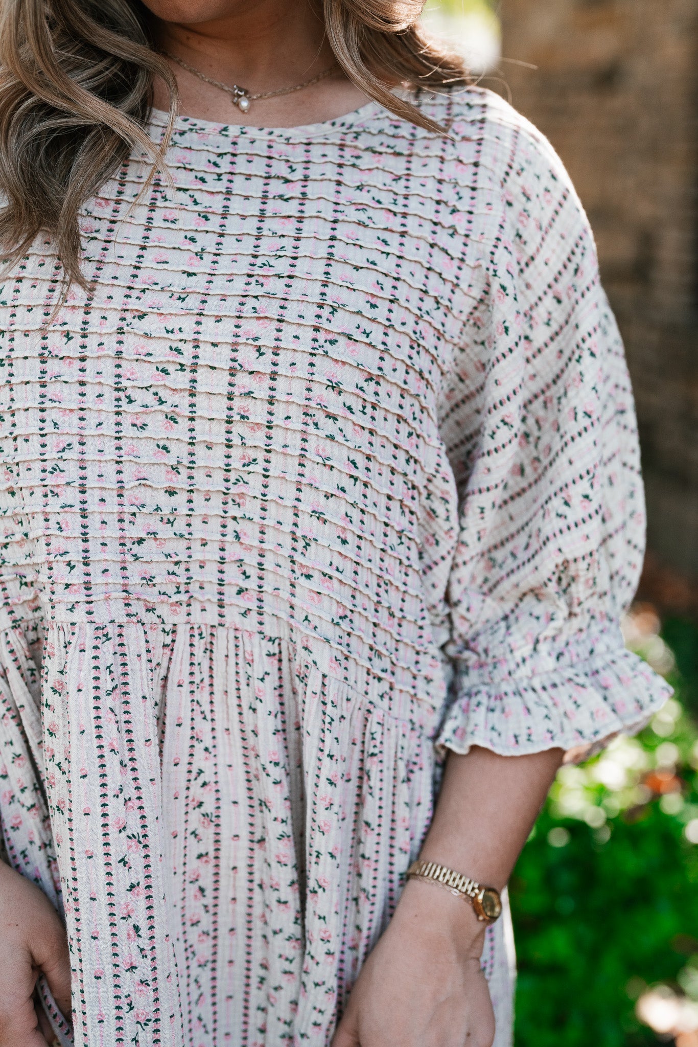 You’ll love how comfortable and flattering it feels—the relaxed babydoll shape offers gentle movement without clinging, and the lightweight fabric drapes beautifully. The long balloon sleeves with elastic cuffs add just the right touch of volume, keeping the look sweet and modern. Whether you pair it with boots for fall or sandals for spring, this dress moves seamlessly from casual to elevated.