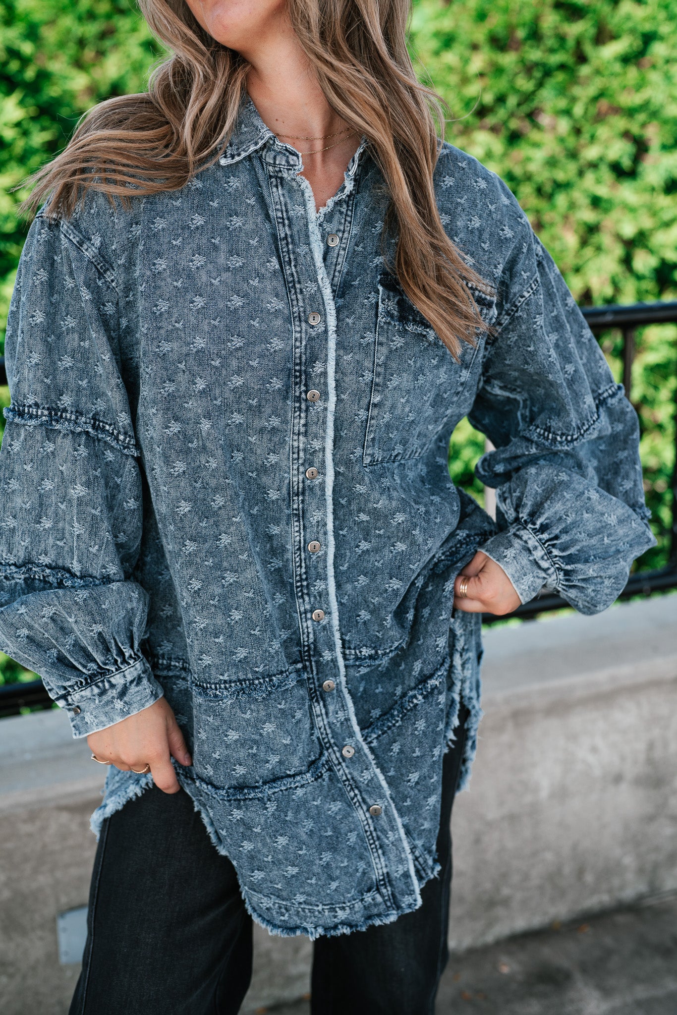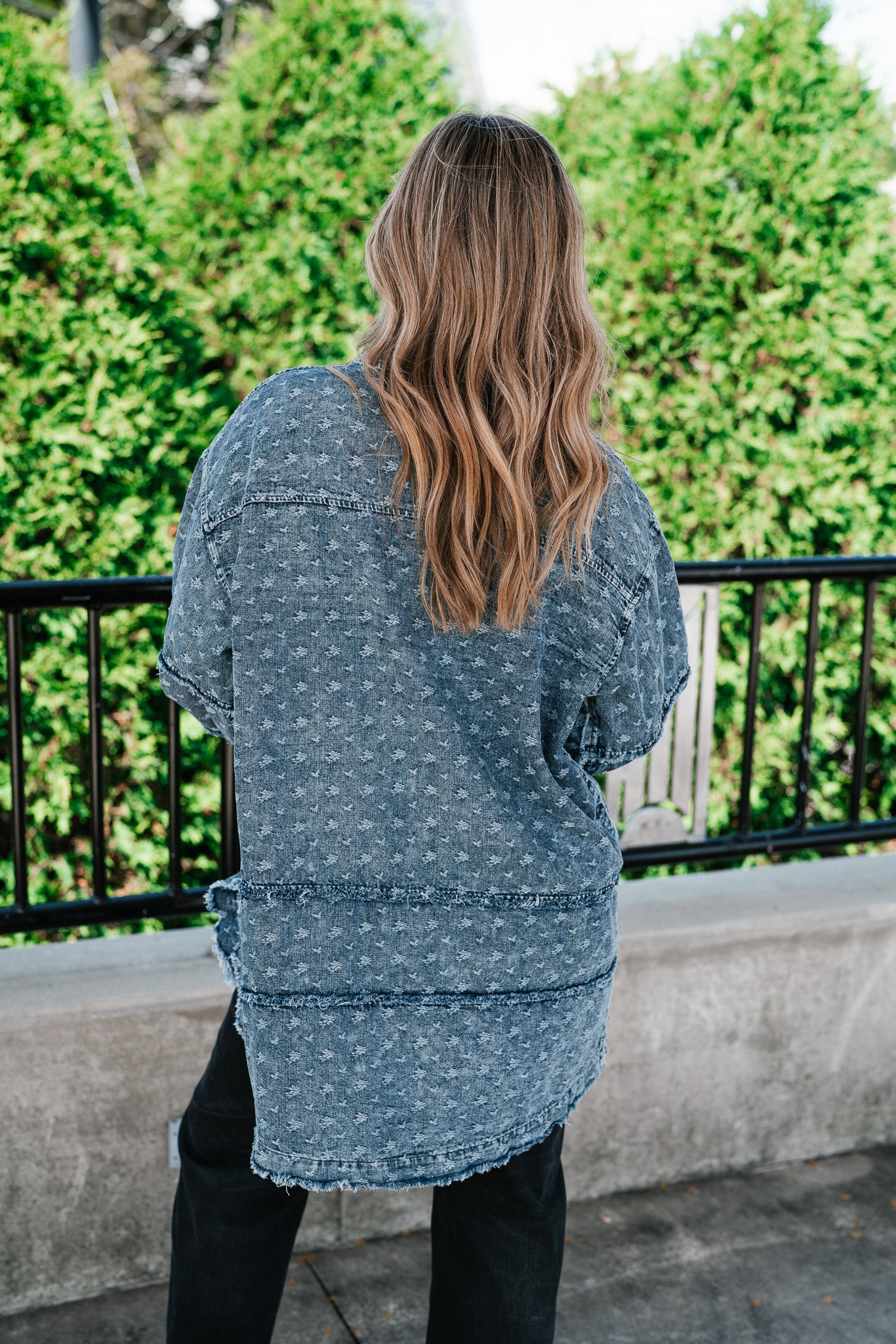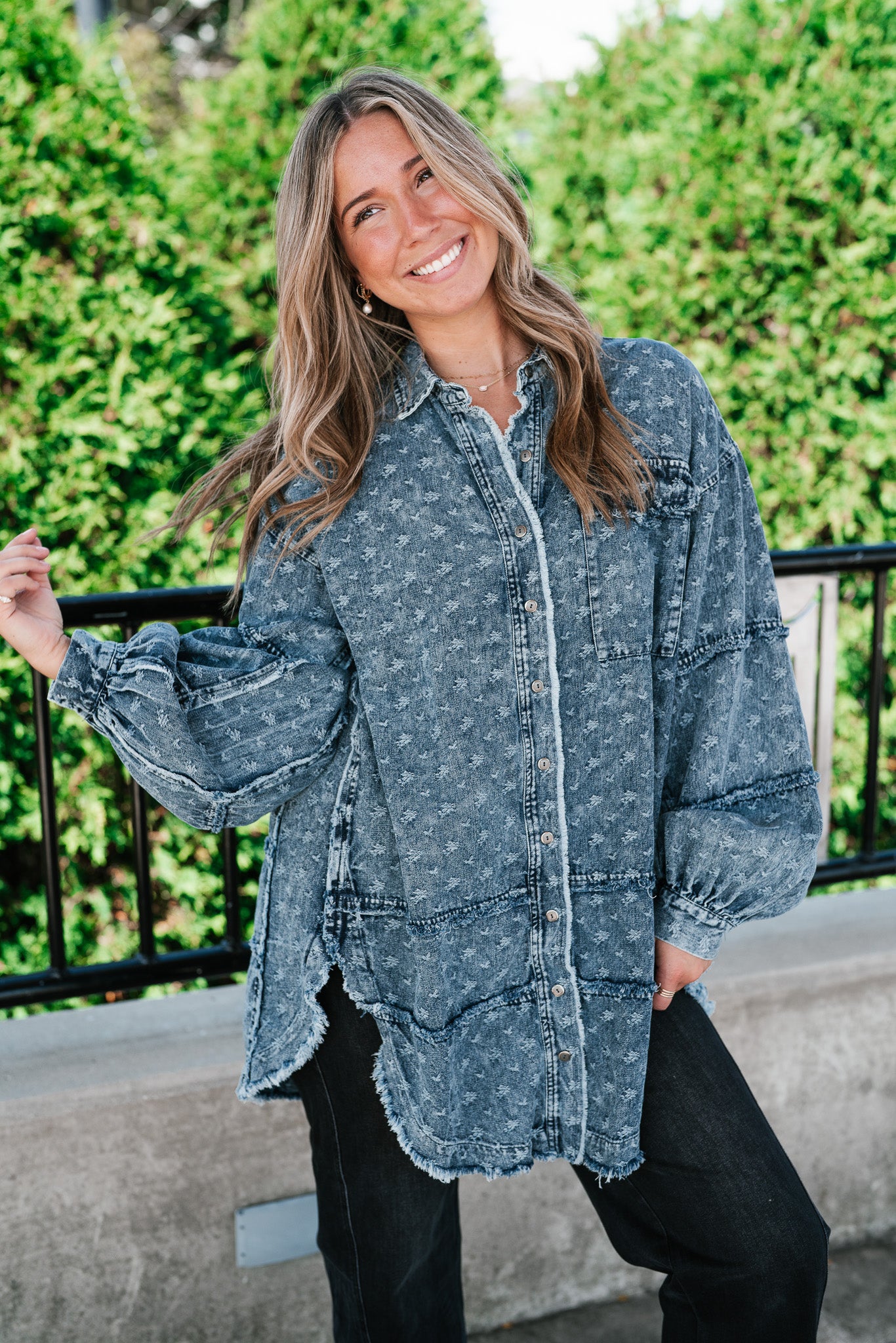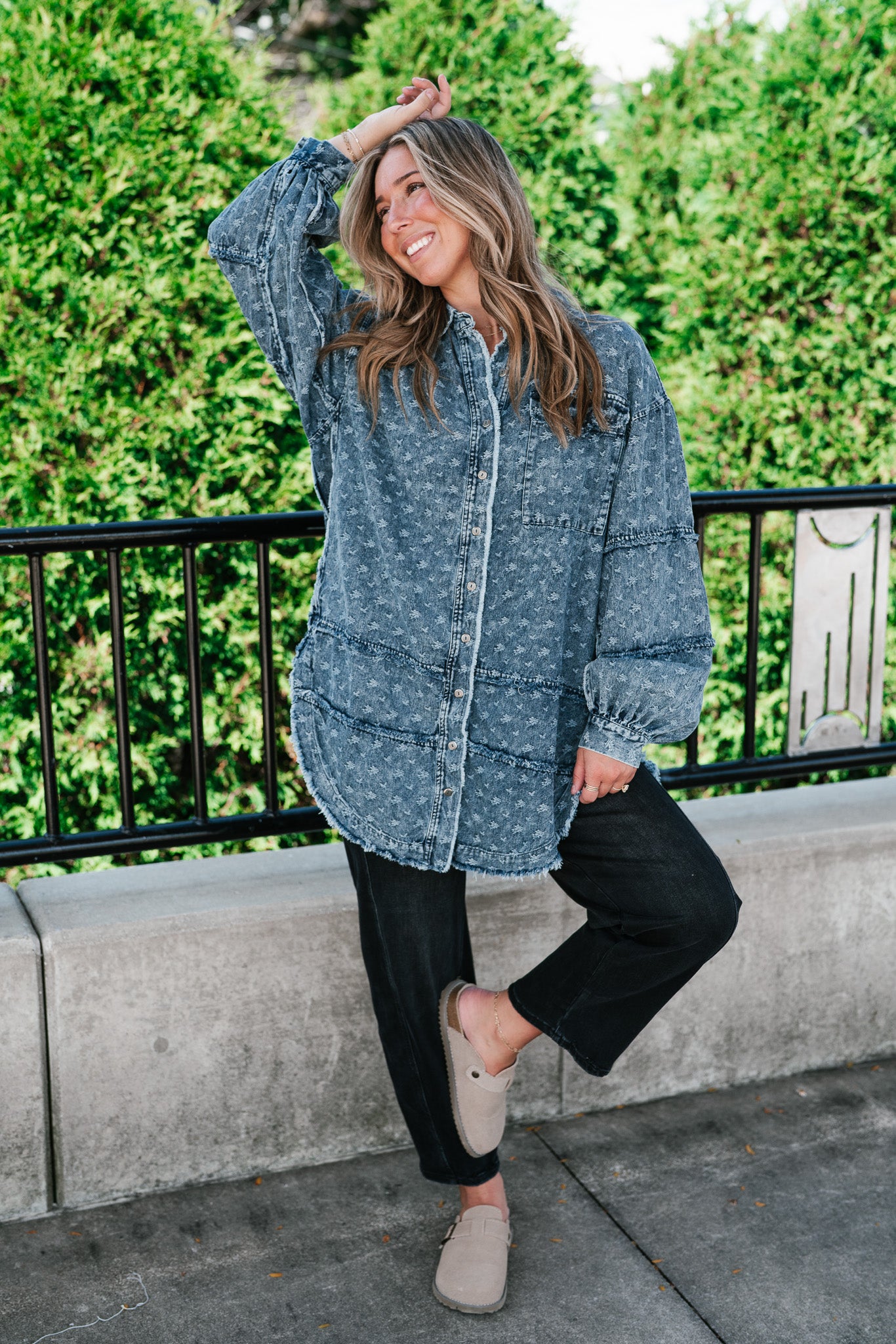 Designed with a relaxed oversized silhouette and a unique star print denim wash, this versatile layering piece blends casual ease with standout style. Perfectly balanced between a shirt and a jacket, it offers endless outfit possibilities—throw it on over a dress, pair with leggings, or style with denim for a chic double-denim look. With its raw hem and vintage-inspired details, this shacket is a true statement piece for the modern woman on the go.