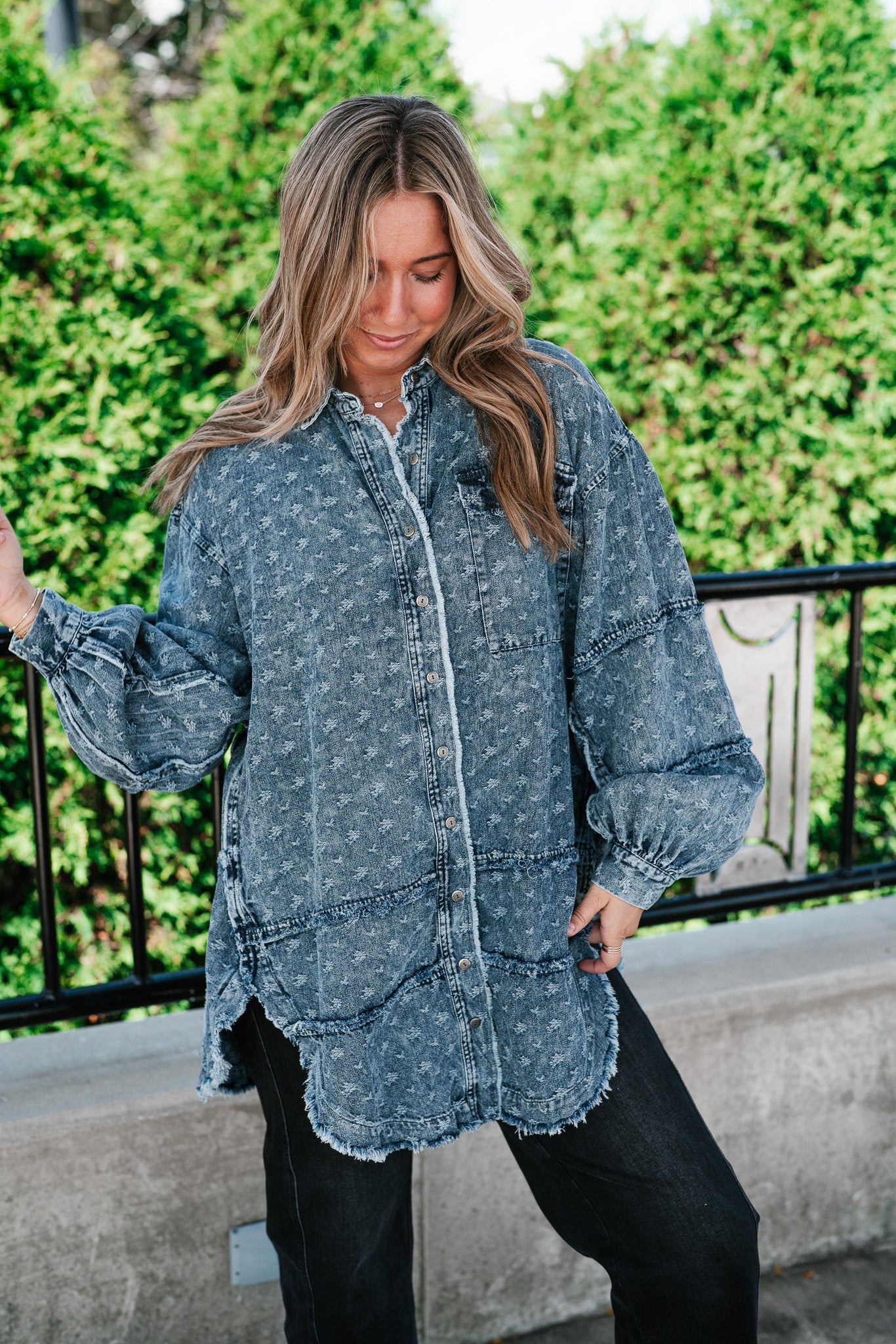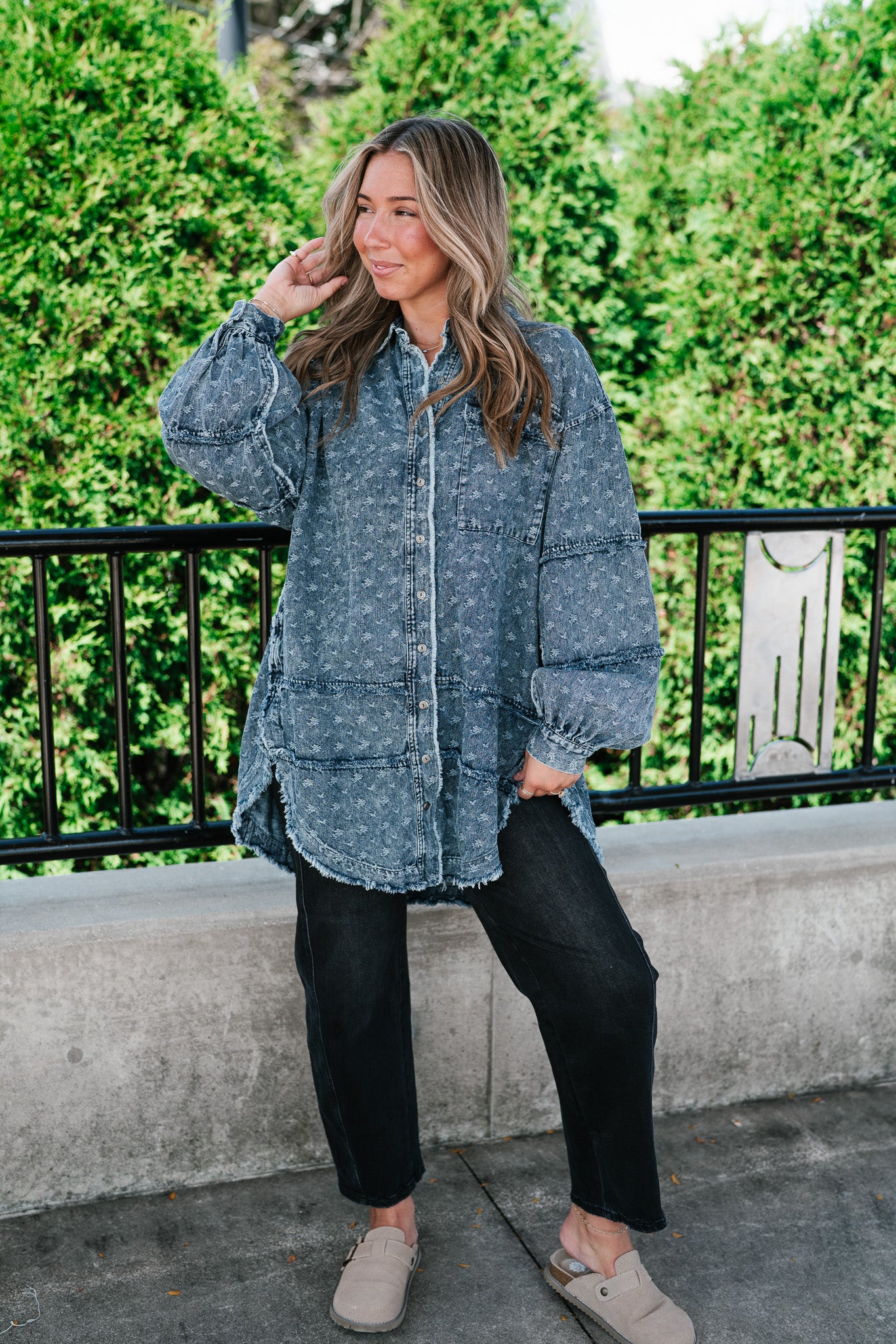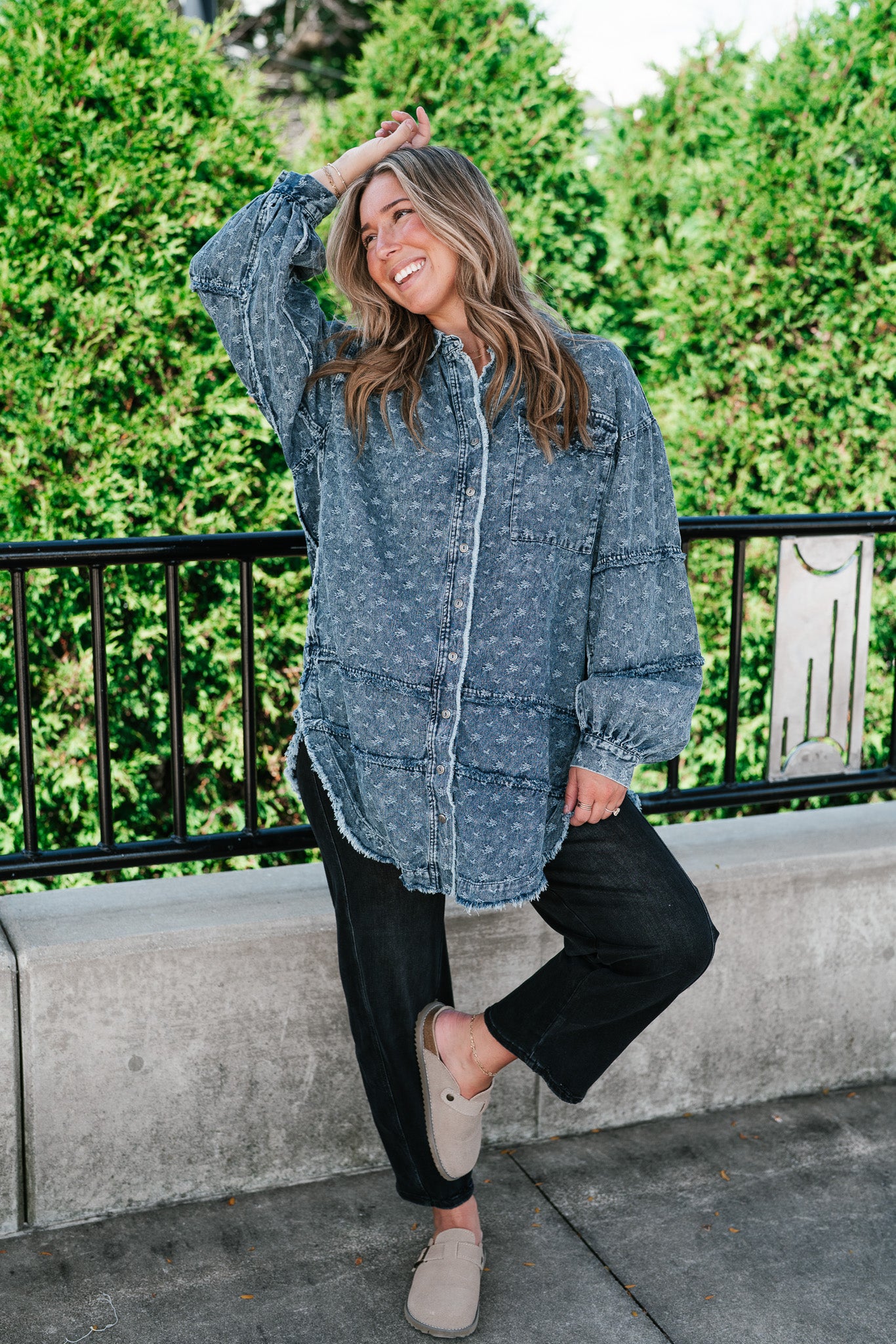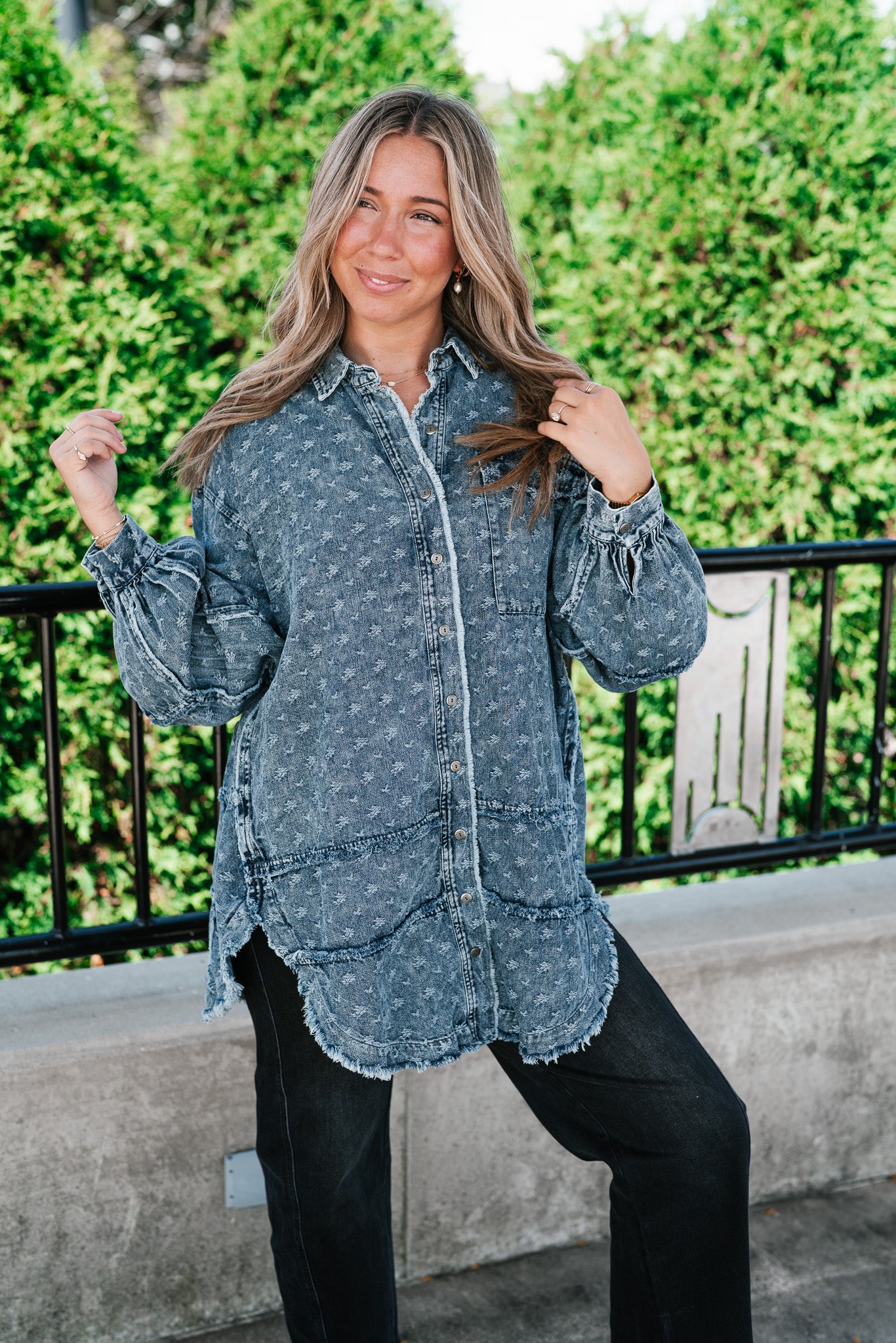 Designed with a relaxed oversized silhouette and a unique star print denim wash, this versatile layering piece blends casual ease with standout style. Perfectly balanced between a shirt and a jacket, it offers endless outfit possibilities—throw it on over a dress, pair with leggings, or style with denim for a chic double-denim look. With its raw hem and vintage-inspired details, this shacket is a true statement piece for the modern woman on the go.