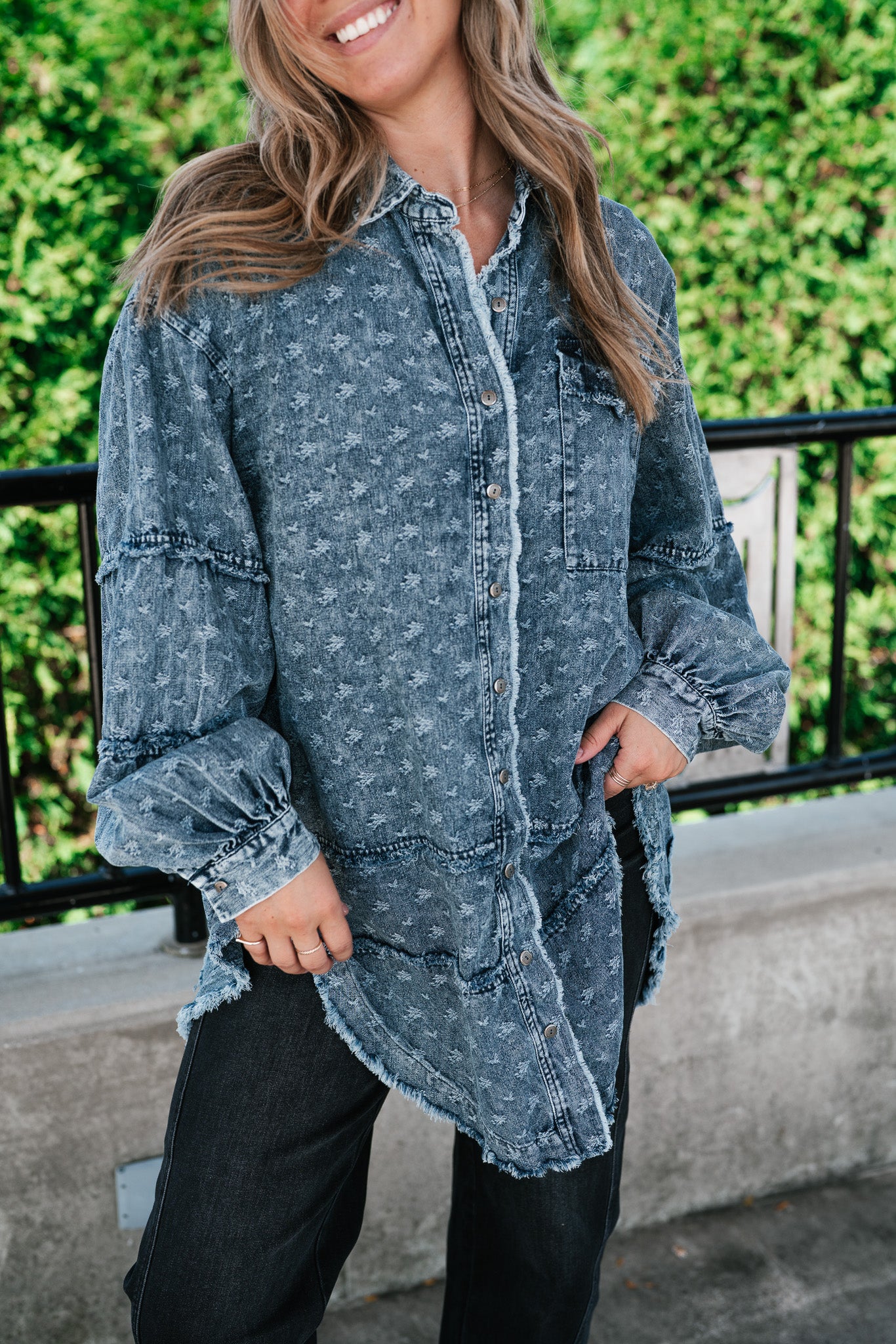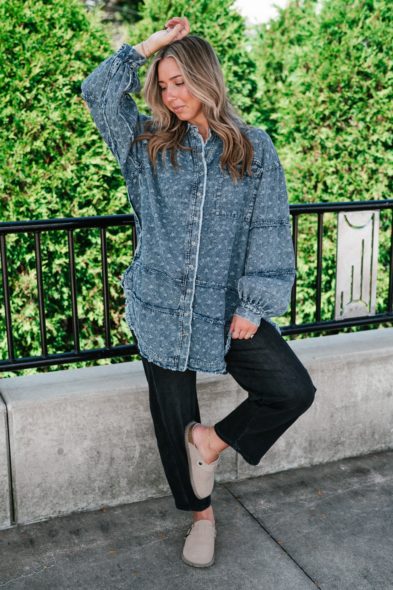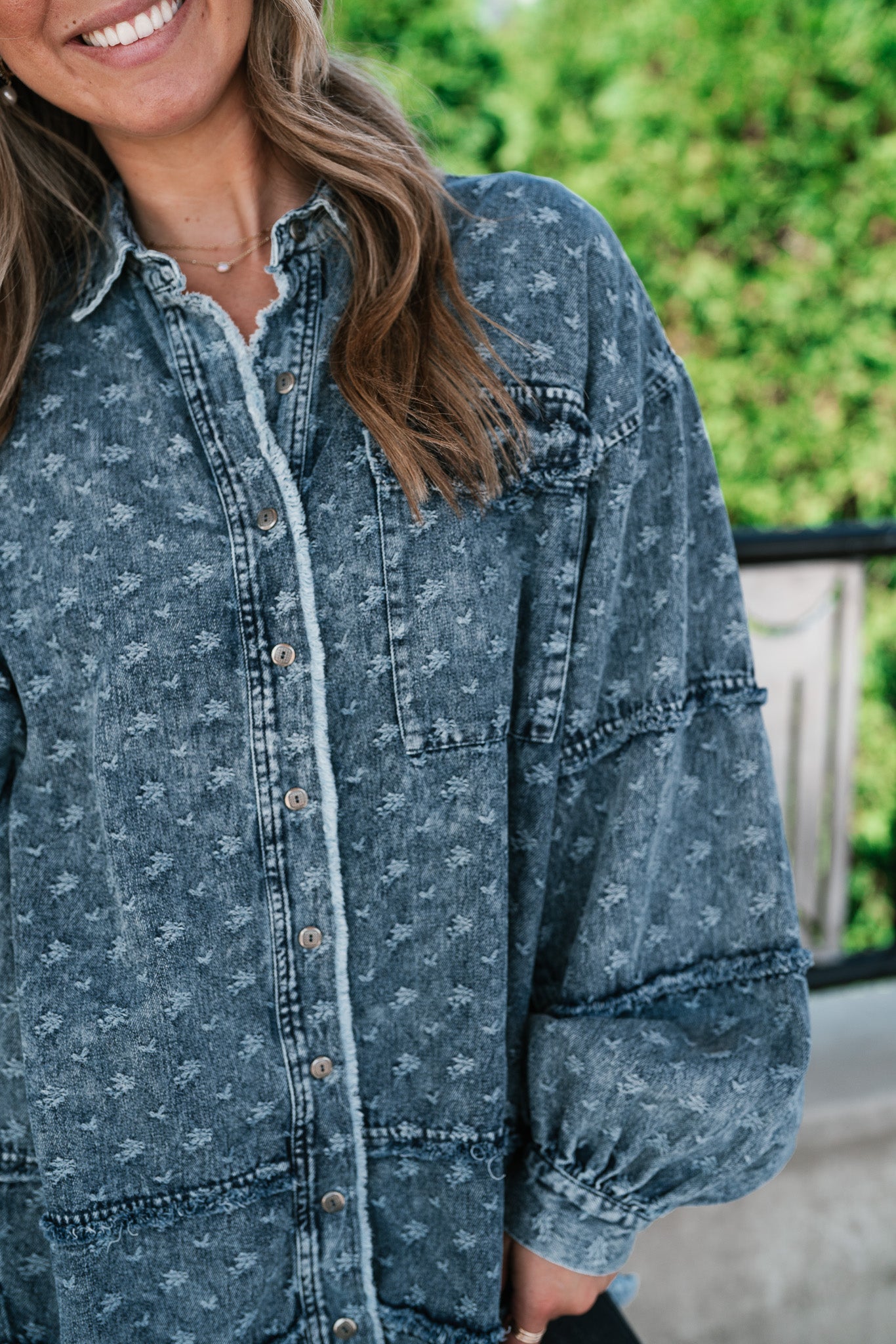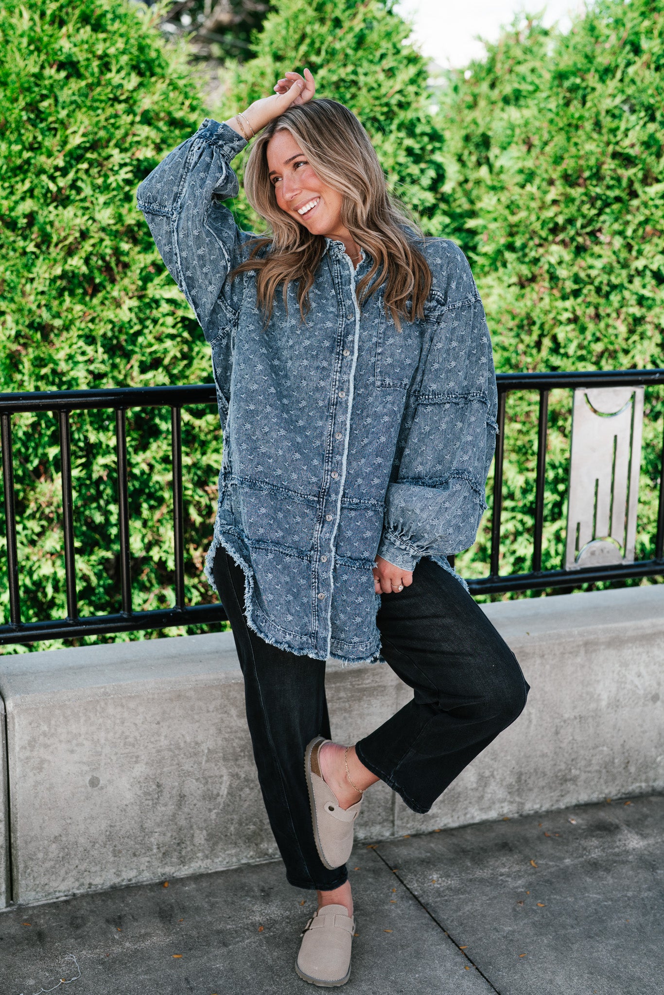 Designed with a relaxed oversized silhouette and a unique star print denim wash, this versatile layering piece blends casual ease with standout style. Perfectly balanced between a shirt and a jacket, it offers endless outfit possibilities—throw it on over a dress, pair with leggings, or style with denim for a chic double-denim look. With its raw hem and vintage-inspired details, this shacket is a true statement piece for the modern woman on the go.